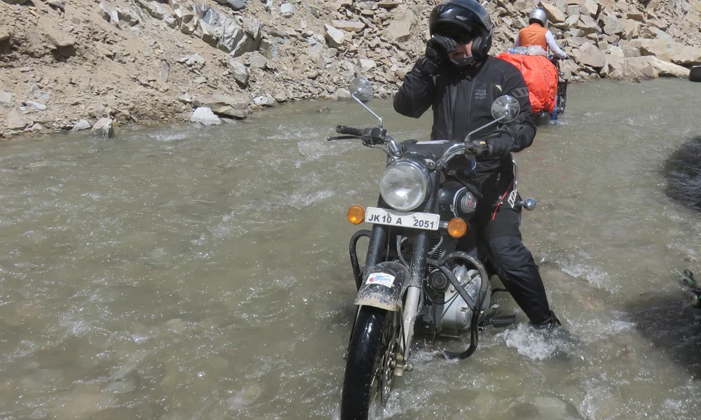 Kameleiden luota kohti Kardung Lata. Jokainen jännittää jonkin verran eilisen 50 metrin vesiestettä joka oli eilen jo haastava vaikka pääsimme ajamaan sen alavirtaan. Tänään pääsemme ajamaan voimakasta virtaa vastavirtaan! Ja ihme ja kumma jokainen pääsee siitä läpi, pieniä työntöapuja tarvitsee itse kukin mutta homma onnistuu. Eilen sukat pysyivät kuivana. Tänään ei ole toivoa sellaiseen ylellisyyteen... :]