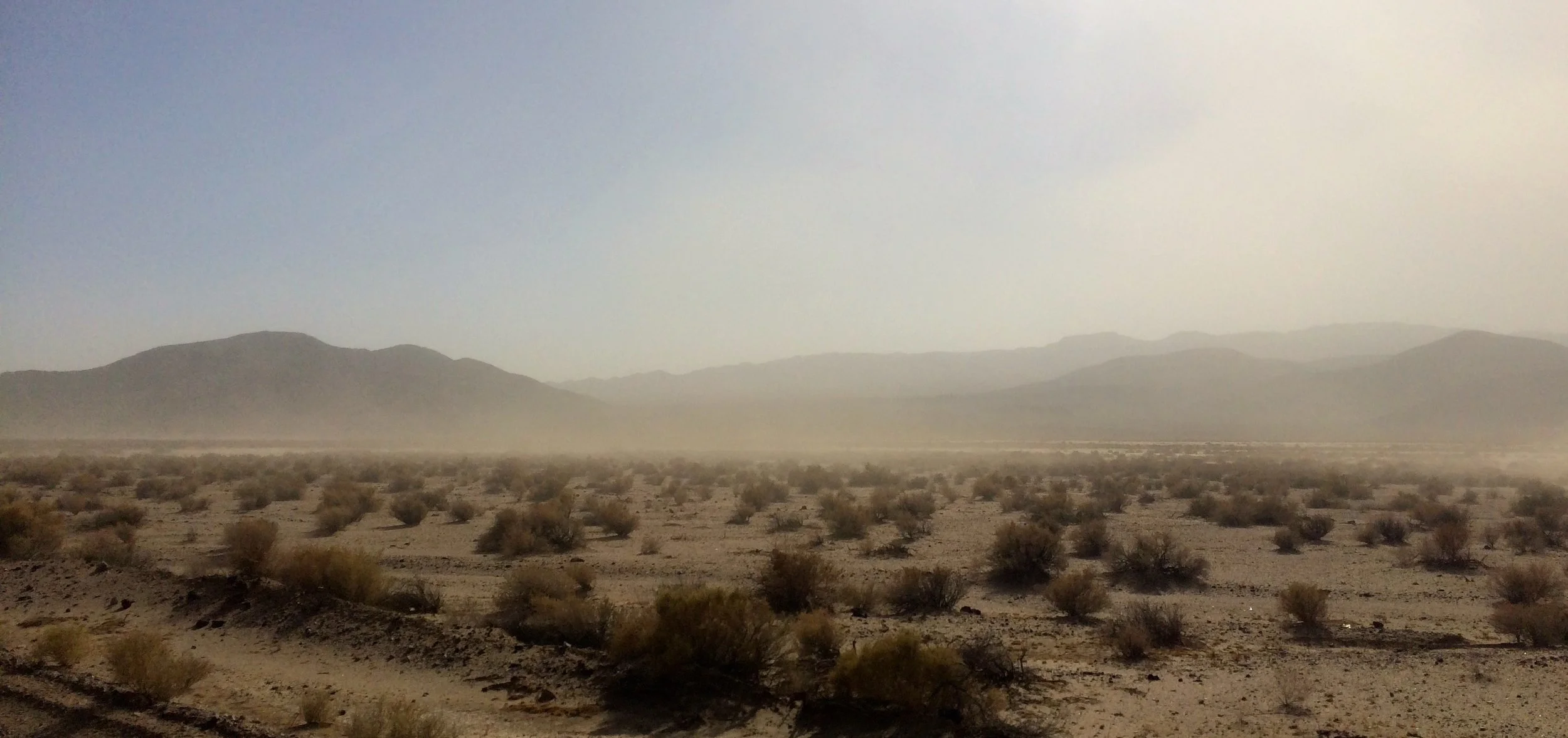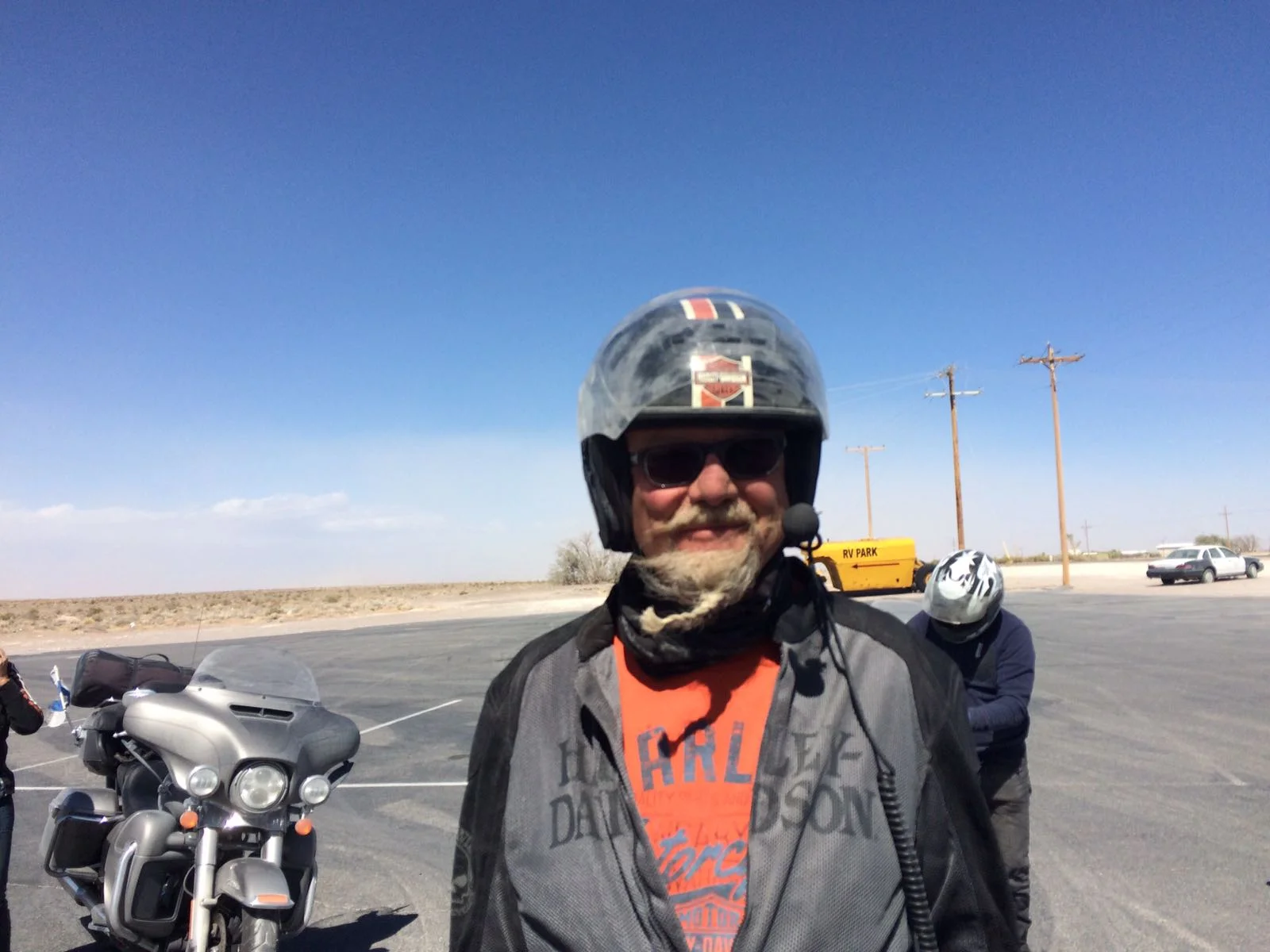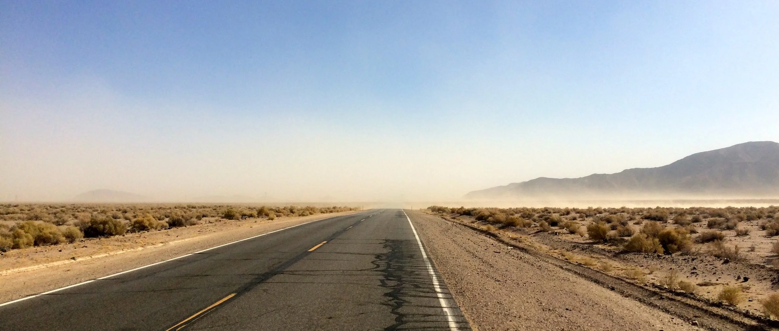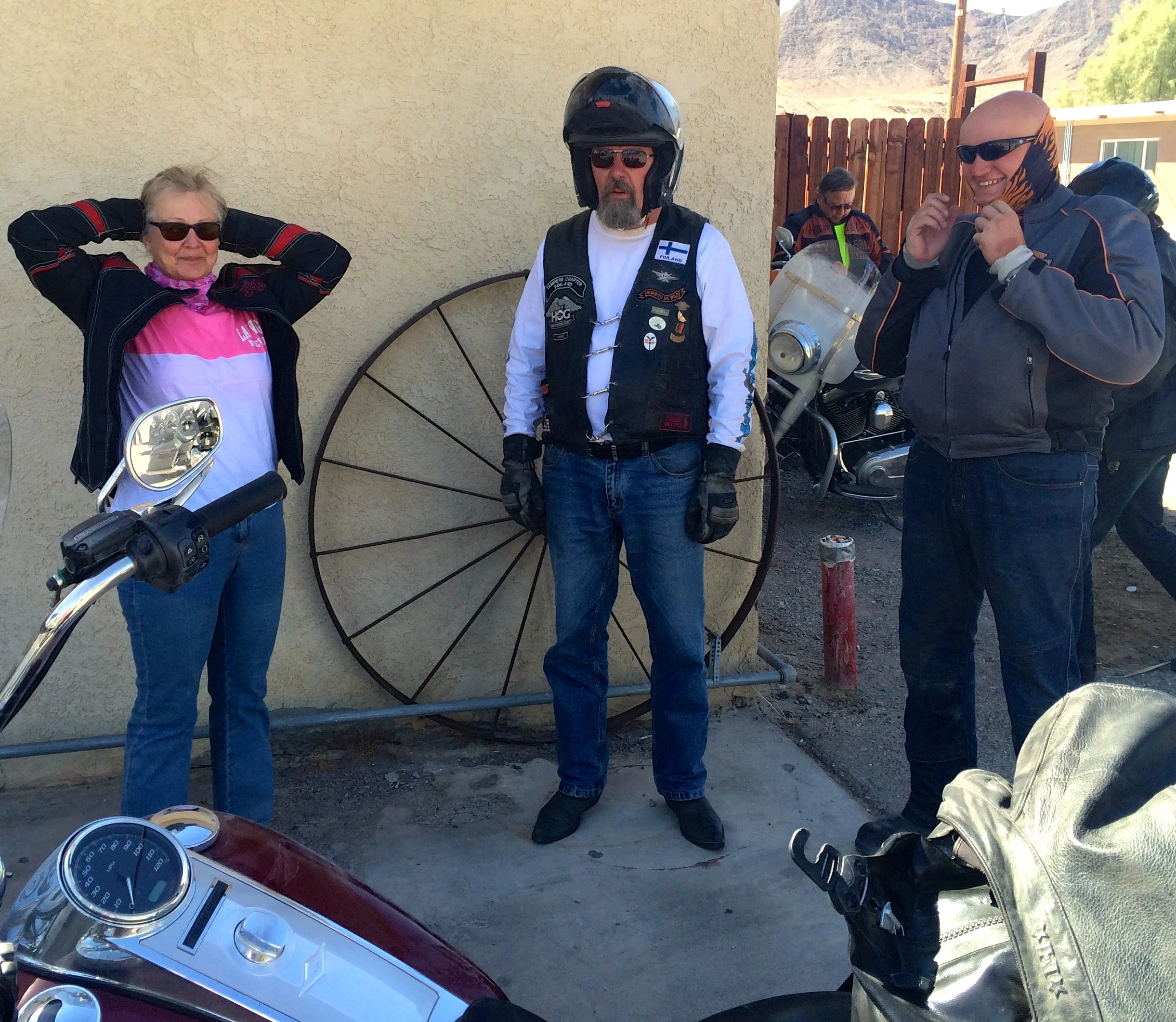 Las Vegasin jäädessä taustapeileihin ja letkamme edetessä syvemmälle Mojaven autiomaahan alkoi puuskittainen tuuli ravistella pyöriämme. Hetkessä olimme niin kovan tuulen keskellä, että pystyssä pysyäkseen sai ponnistella ihan tosissaan. Tuulta vasten kuitenkin puskettiin seuraavalle huoltoasemalle asti. Suojaan ja pitämään palaveria jatkosta. Death Valleyn pohjalle ajo päätettiin jättää turvallisuus-syistä kokonaan väliin ja otimme suunnaksi sen laitamilla kulkevan suorimman reitin kohti Barstowia. Nyt routemme jatkui keskellä Nevadan autiomaata, hiekkamyrskyn keskellä. Näkyvyys oli pahimillaan arviolta 10m, hienoa hiekkaa lensi vaakasuorassa päin näköä ja myrsky ravisteli pyöriä… Tuulen nopeudesta ei ole tarkkoja lukemia mutta HD kaatui kuin domino nappula jos siitä ei pitänyt kaksin käsin kiinni. Muutama pyörä kellahtikin kaatumarautojen varaan mutta onneksi kukaan ei loukannut itseään.