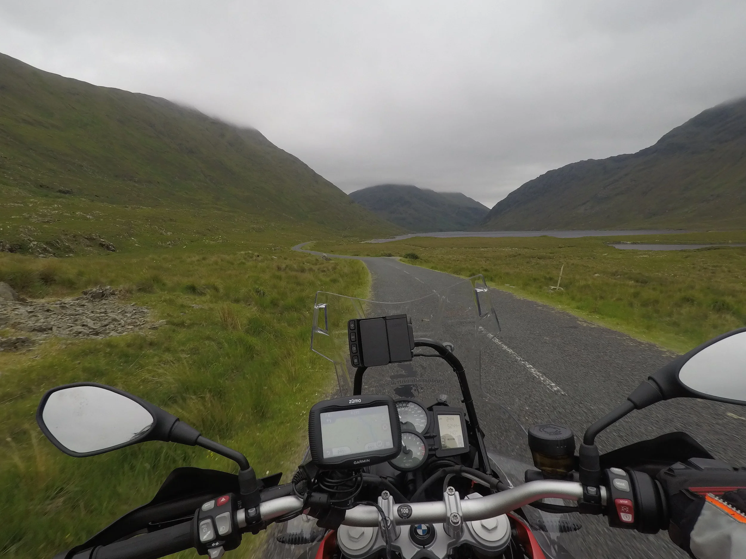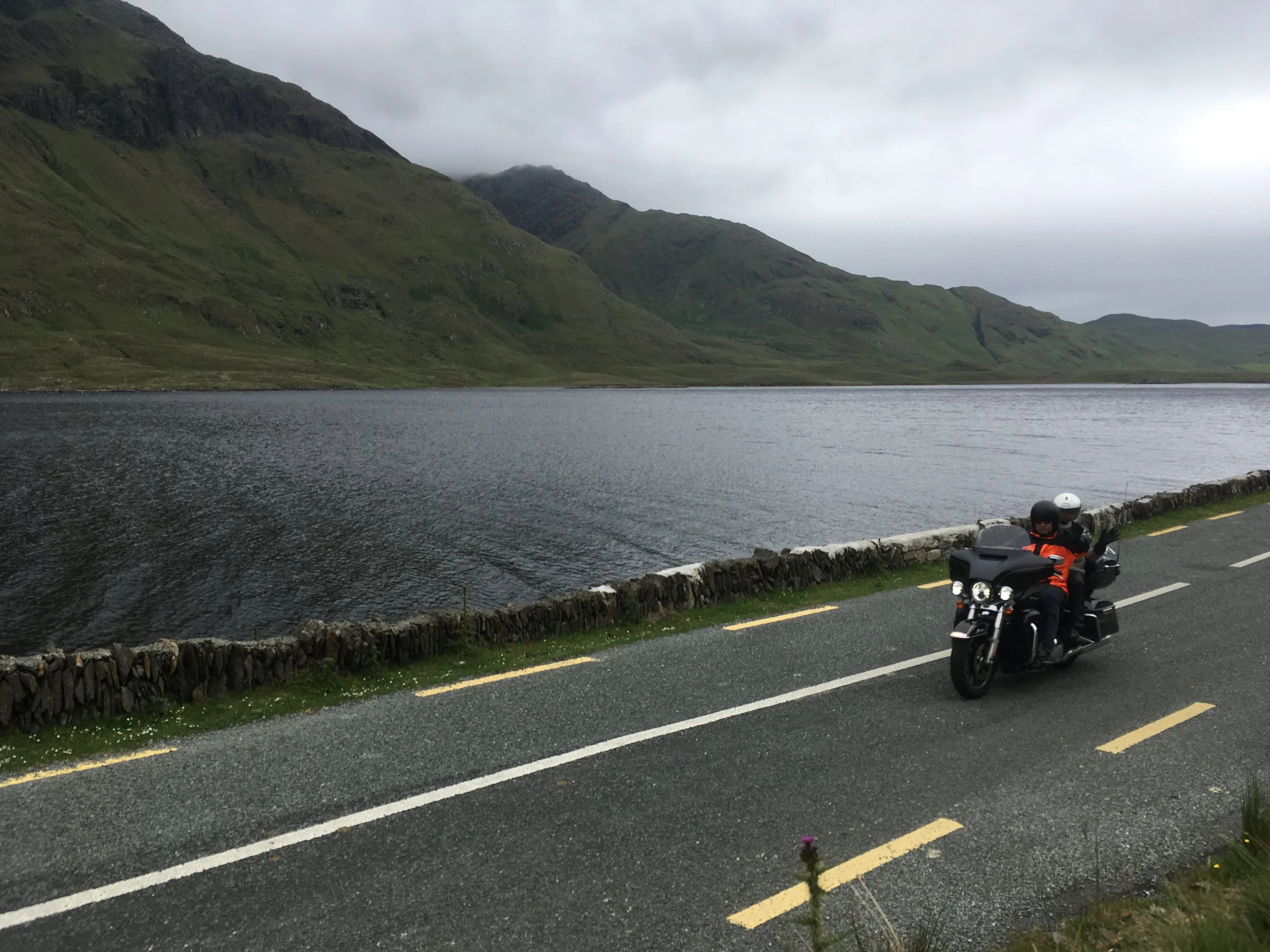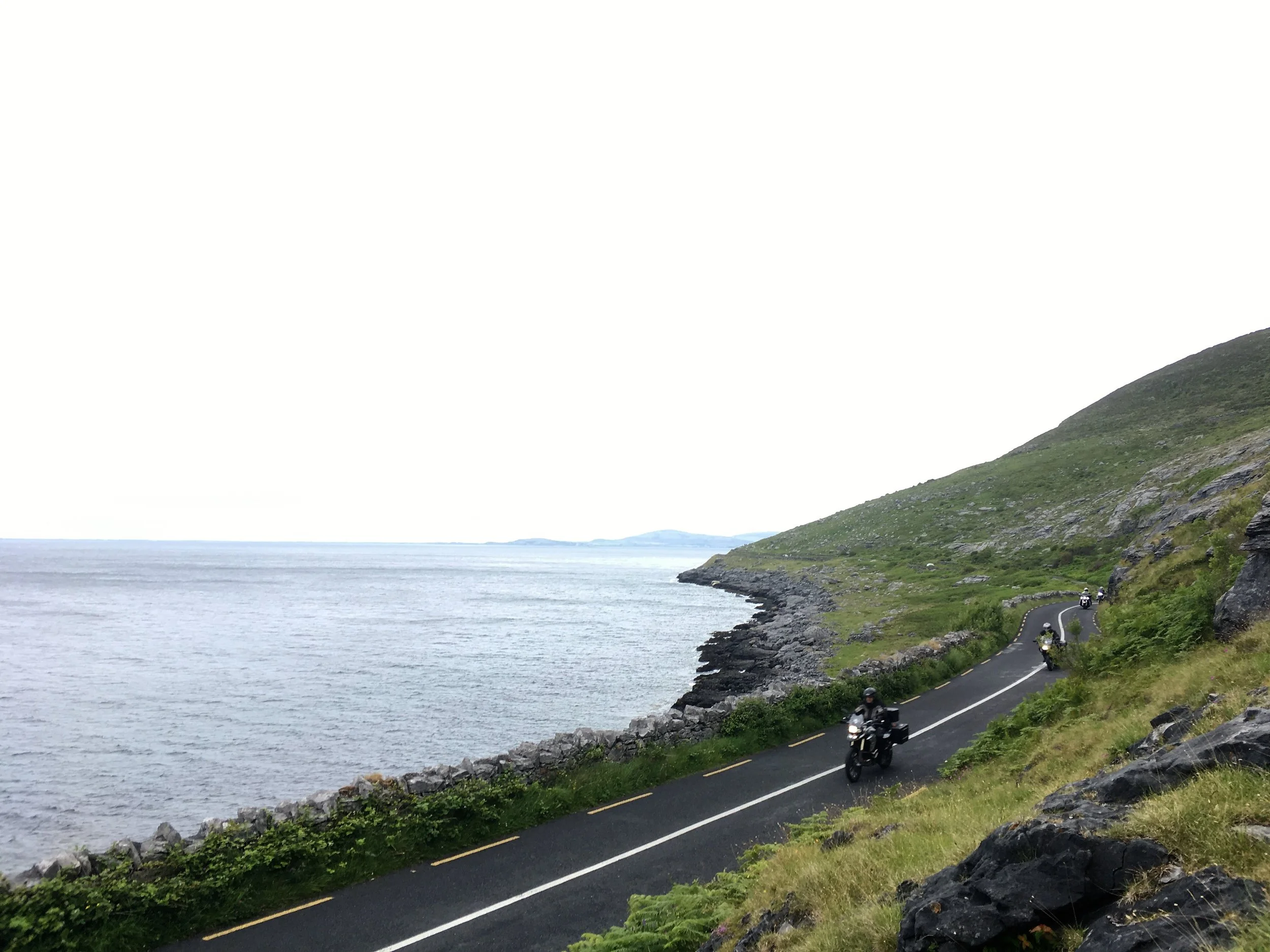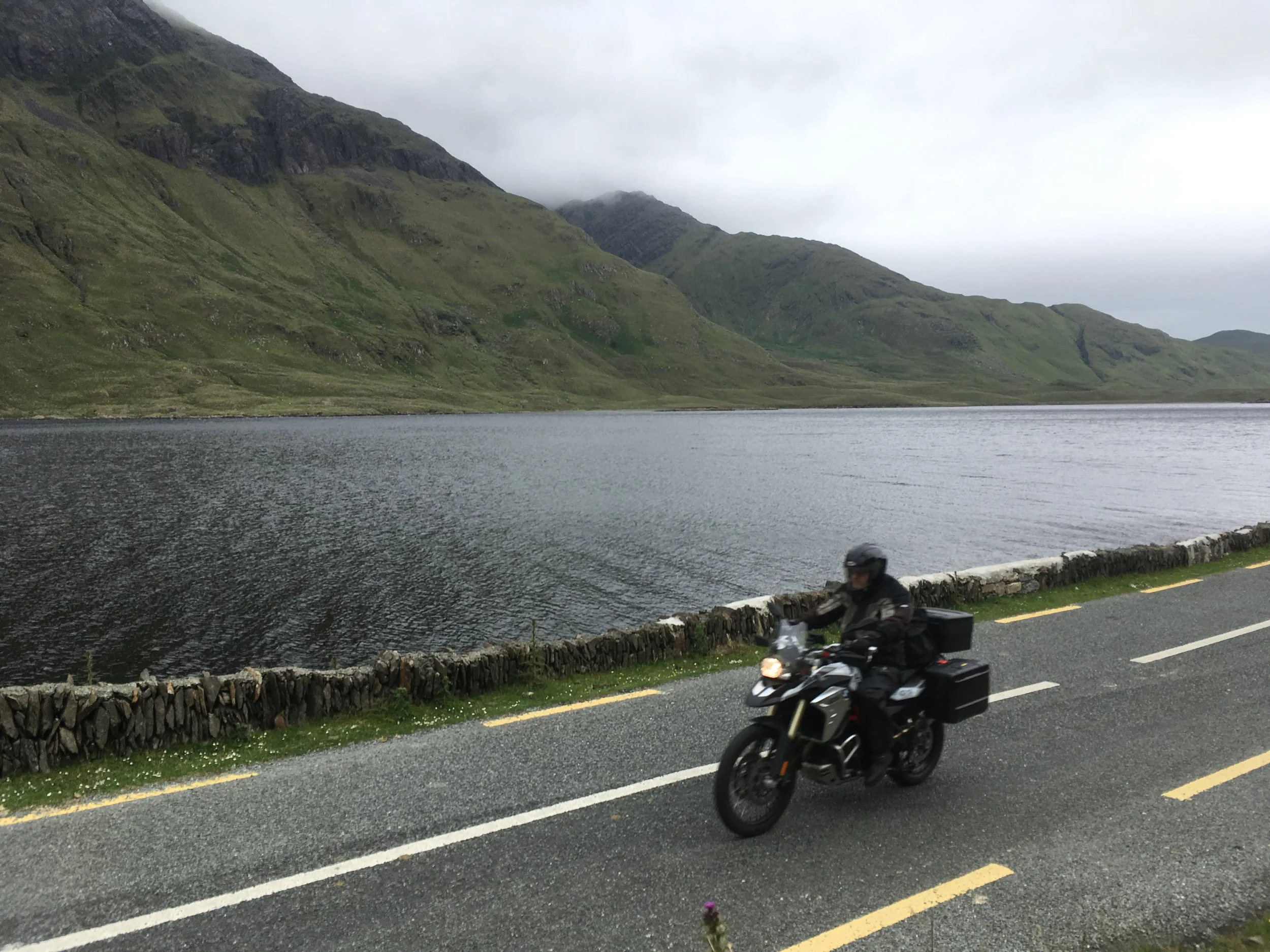 Sillä aikaa kun Eino ja Jaana taistelivat rengasrikkoja vastaan muu ryhmä jatkoi matkansa Irlannin länsirannikkoa pitkin! Paljon pieniä teitä. Paljon ylämäkiä ja alamäkiä. Paljon mutkia vasemmalle ja oikealle. Vettä tuli aina silloin tällöin ja sumukin kerääntyi hyvin nopeasti. Maisemissa ei silti valittamista.