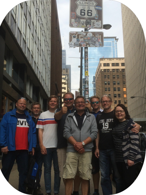 Ensimmäisen amerikan aamun aamiaisella olen seitsemältä. Jari, kaimani Peter ja Tero tulevat noin samaan aikaan! Yhdeksältä pidän briiffuksen lähitulevan elämästä kymmeneltä olemme matkalla Adams Streetille... Route66'n alkupisteeseen jos lähtöpaikka Chicago. Sitten kierrämme korttelin Jackson Streetille ja olemme Route66'n loppupisteessä jos lähtöpaikkana Santa Monica! Tämä päivä on aikaeron tasauspäivä ja Chicago päivä... ja ensimmäinen Route66'ni jona Milwaukee saa olla harrikoineen ja museoineen kaikessa rauhassa. Siihen asiaan taitaa vaikuttaa suurestikin, että tämä ryhmä ei ole siviilissä harrikkaryhmä! Kukaan ei ole vielä tullut HD-ikään... jokainen motoristi ainakin tietää moottoripyöräilijän elämän kaaren, joka on; kolmerattainen, polkupyörä, mopo, kevari, moottoripyörä, HD, trike, rollaattori ja rullatuoli... :]