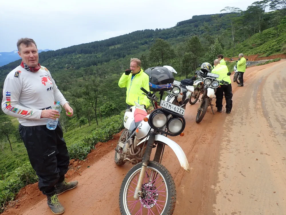 Tänään matka jatkui vapaapäivän jälkeen kohti Sri Lankan suurimpia vuoristoisia teealueita. Sää näytti kostealta lähtiessä, joten vetäistiin sadevehkeet varmuuden vuoksi päälle. Ensin tankille, ulos Kandysta ja pikkuteille. Ei tarvinnut ajaa kovin kauan, kun ensimmäiset teealueet tulivat vastaan ja reittikin kohosi reilun kilometrin korkeuteen. Oli mukavaa ajella teeplantaasien keskellä hienoilla mutkaisilla teillä, joita riittikin koko päiväksi eikä sitä sadettakaan tullut.