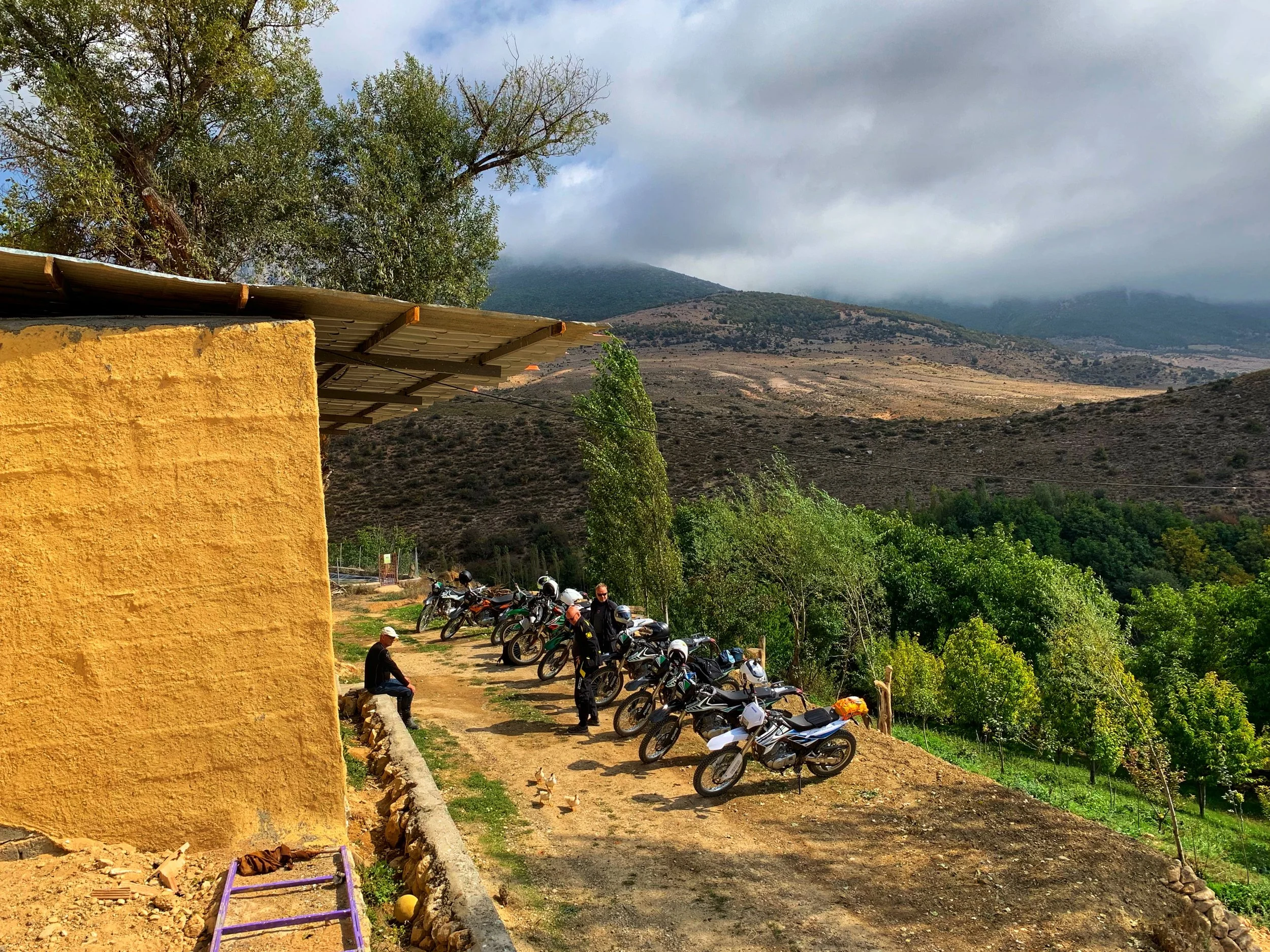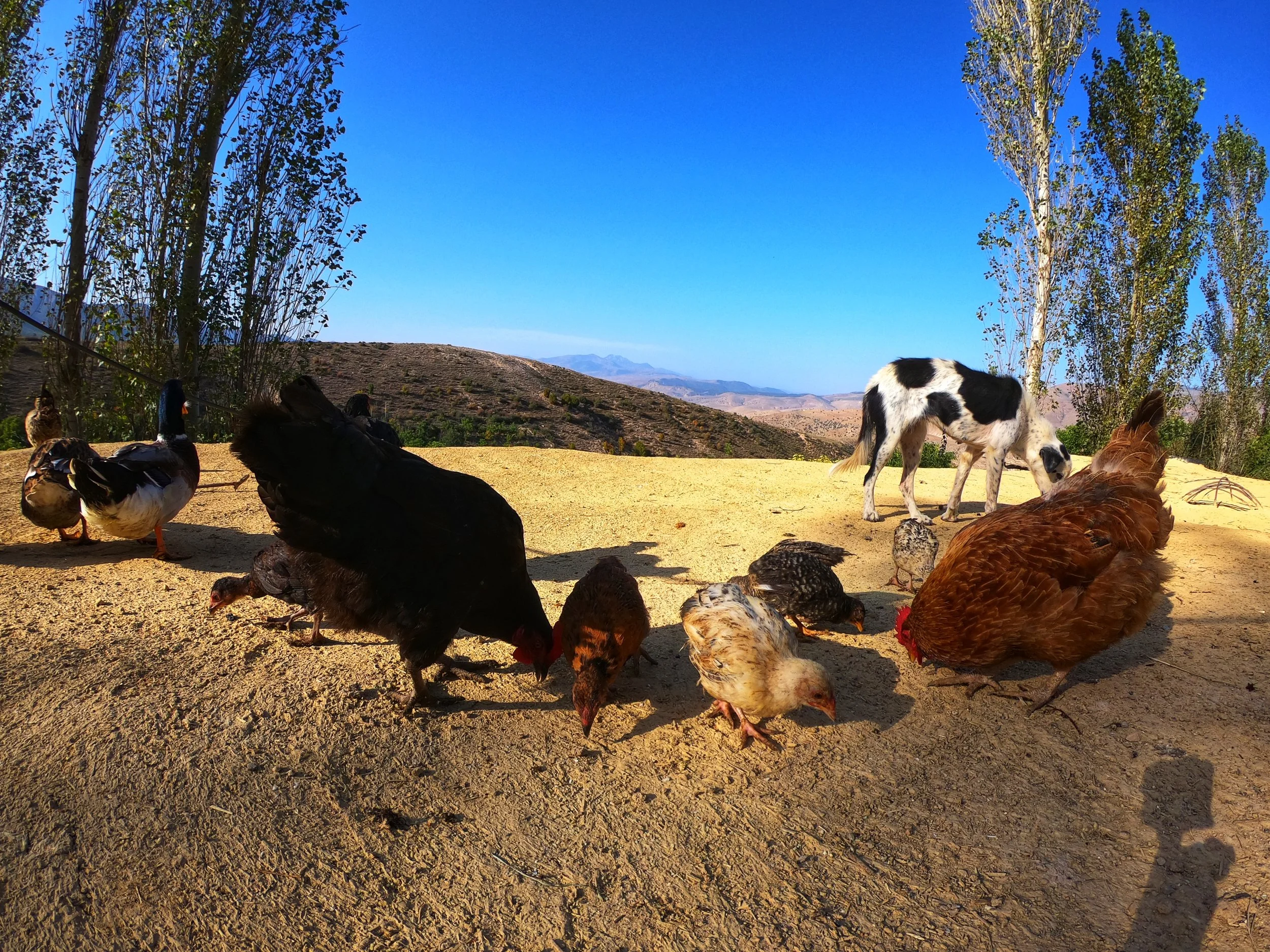 Majoituimme simppelissä majatalossa, jossa kuitenkin pääsi lähemmäksi paikallista elämää. Teevesi kiehuu notskilla, lampaat vaeltavat vapaasti ja kanat kotkottavat pihalla. Terassilta näköalat suoraan vuorille!