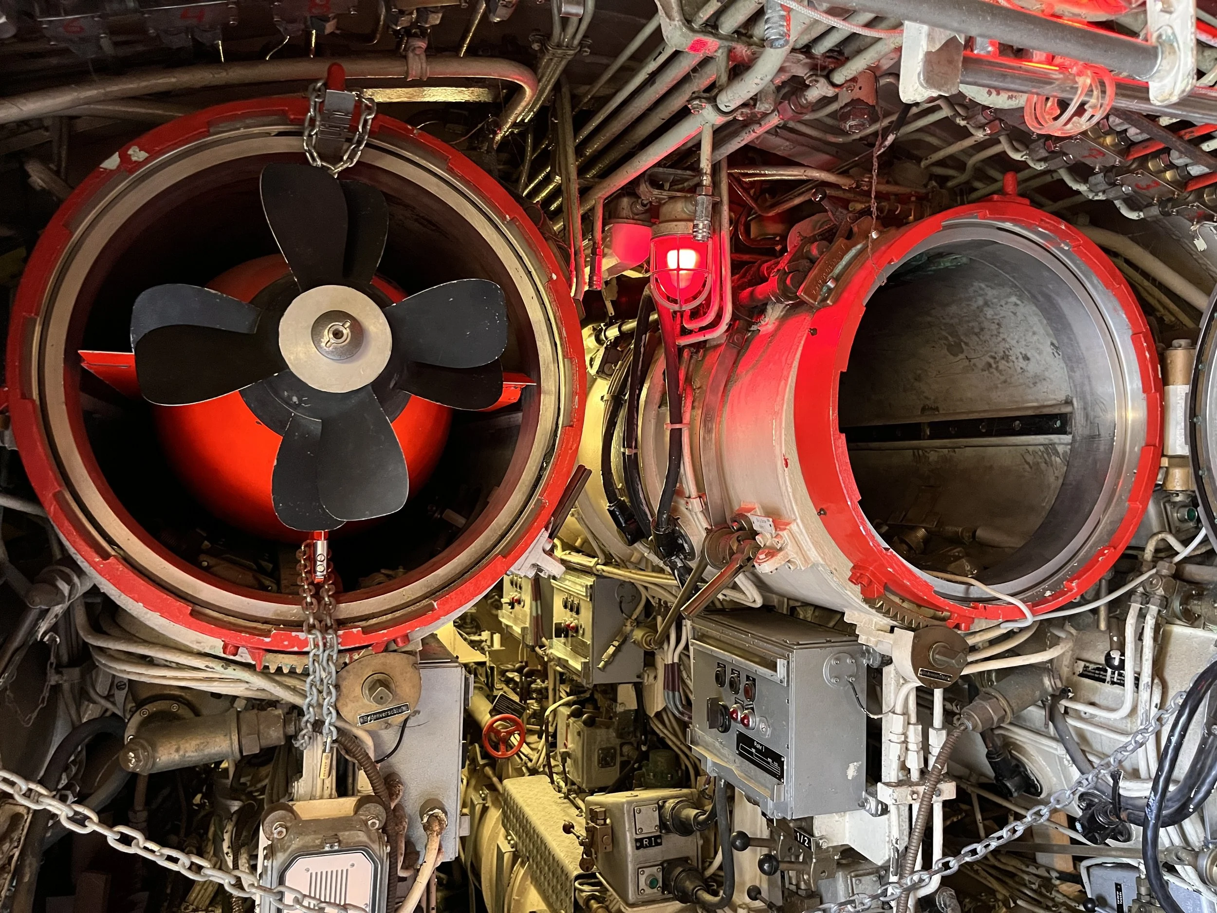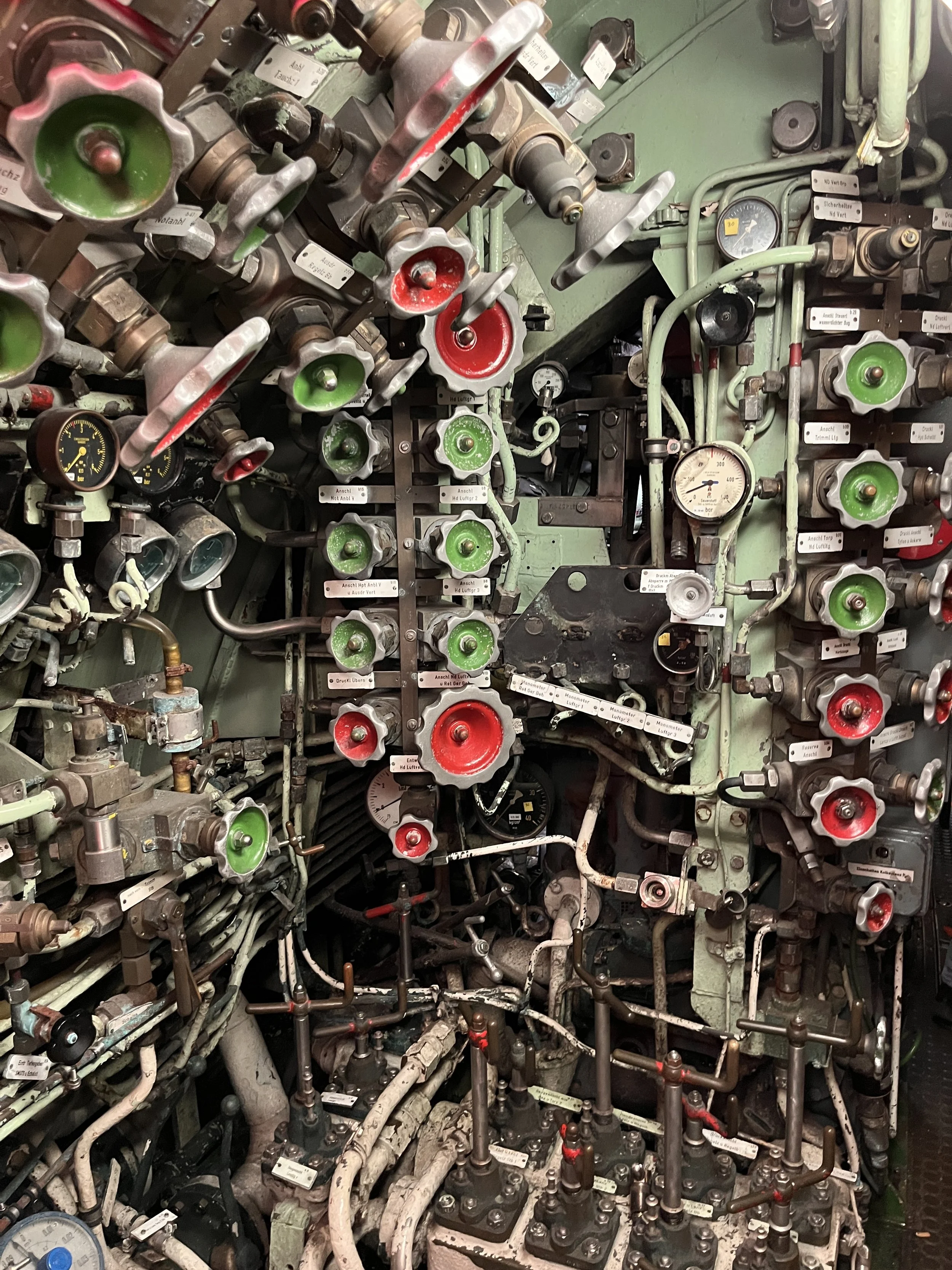 U-Boot näyttävä näky kuivalla maalla. Tämä malli ei ollut WWW II tuotantoa, mutta tarjosi kuitenkin hinon näkymän sukellusvenemiehen elämästä, mihin laiva tarjosi varsin suppeat puitteet.