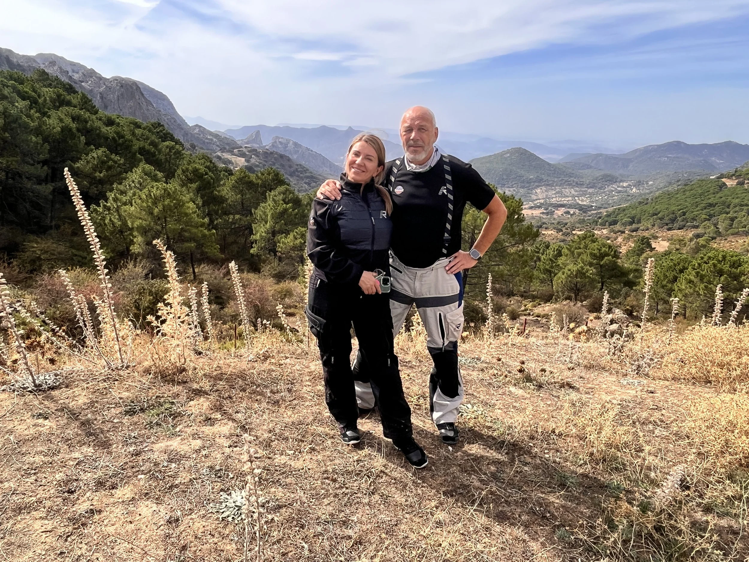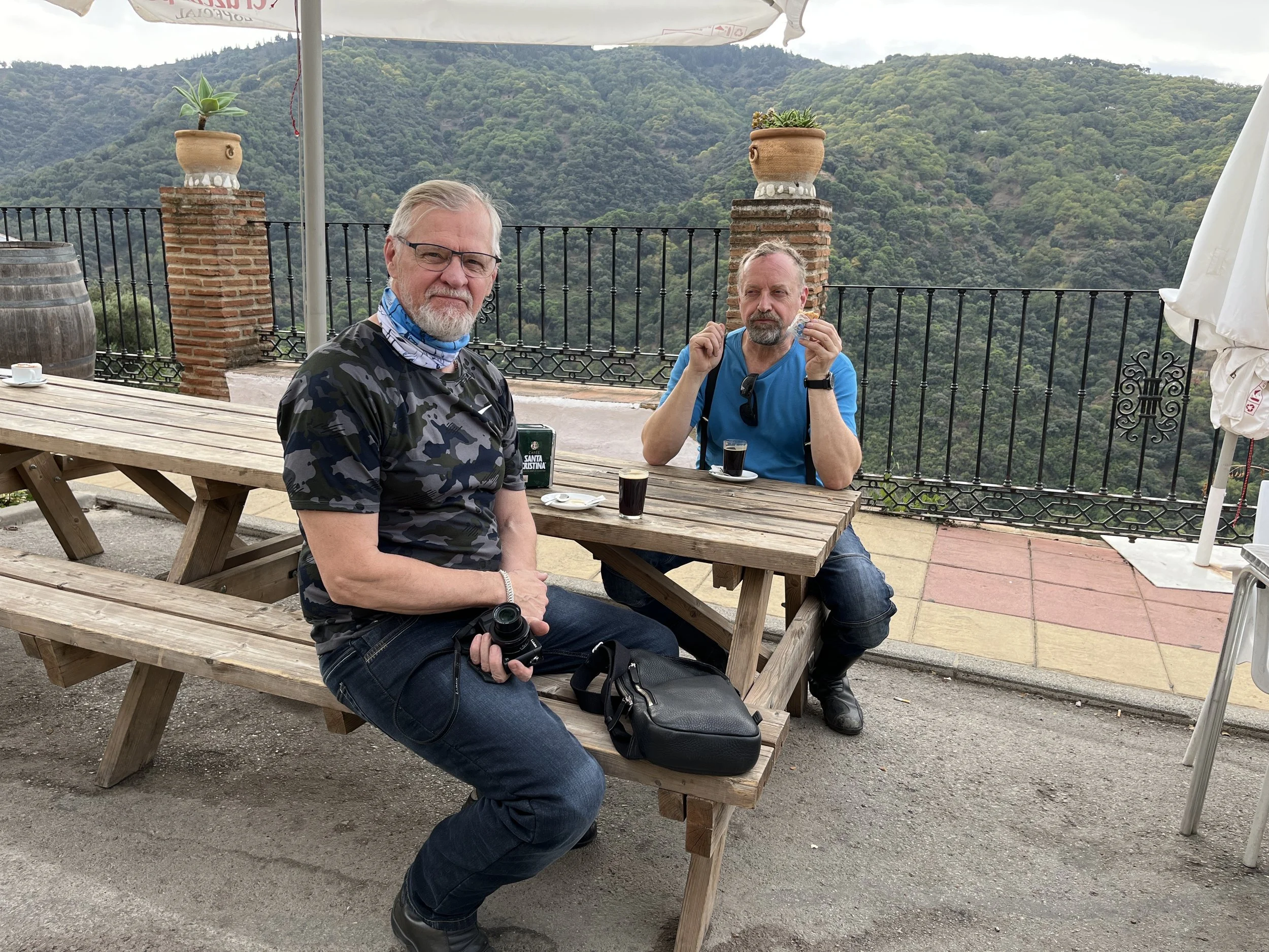 Ensimmäisen vuorten ylityksen jälkeen jo kelpasi kahvitella, kuvassa Raimo ja Hannu Jubriquen maisemissa.