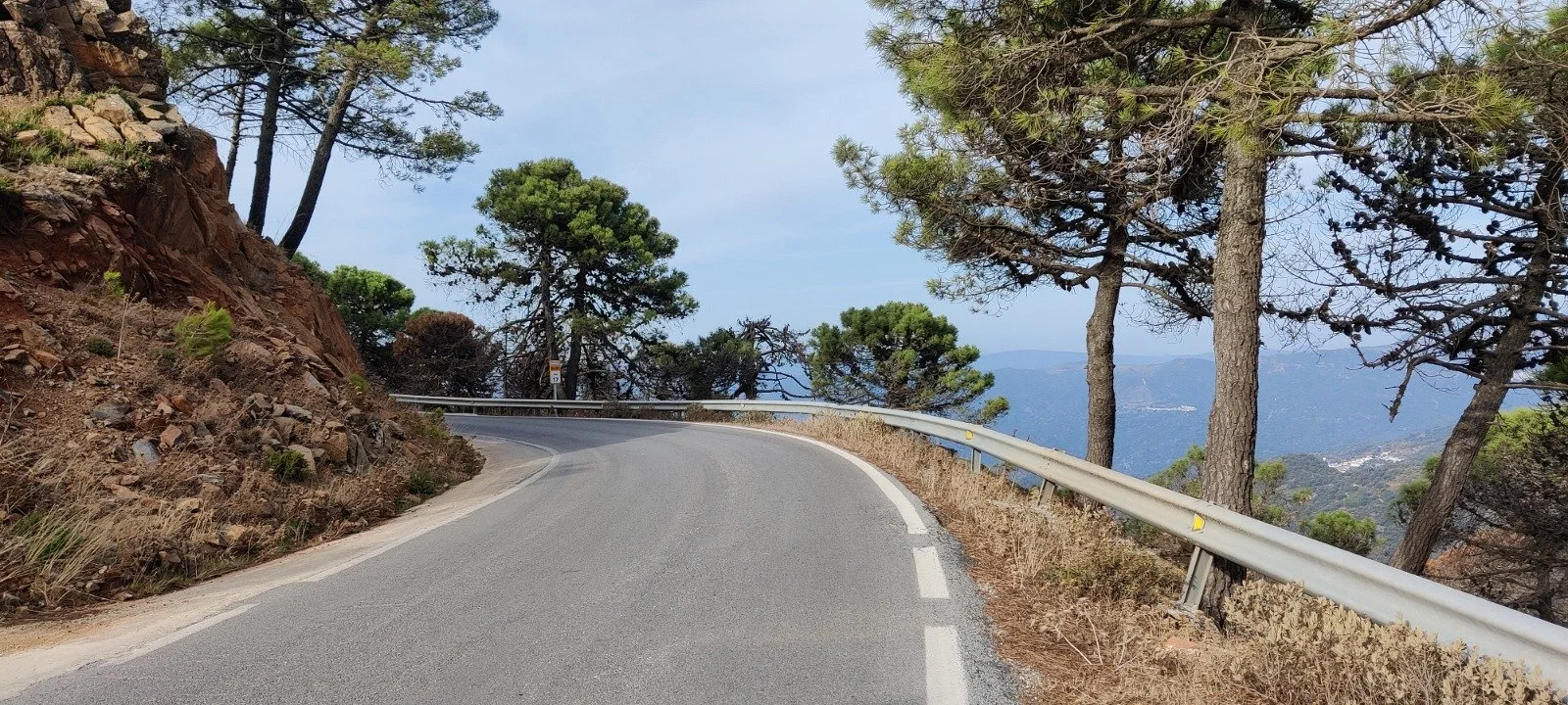 Esteponan kohdalla tehtiin tuikka 90 asteen käännös oikealle, eli sisämaan suuntaan, ja se vei meidät suoraan Sierra Bermejan luonnon puiston maisemiin. Tie sinne vei tuhannen mutkan kautta, kunnes oltiin melkein tuhannen metrin korkeudessa. Pari vuotta sitten raivonneen metsäpalon jälkiä korjattiin vieläkin, tien varsi oli paikka paikoin täynnään pinnaltaan hiiltyneitä tukkeja ja mustuneessa maastossa saattoi vieläkin haistaa savun hajun; ainakin kuvitella sen.