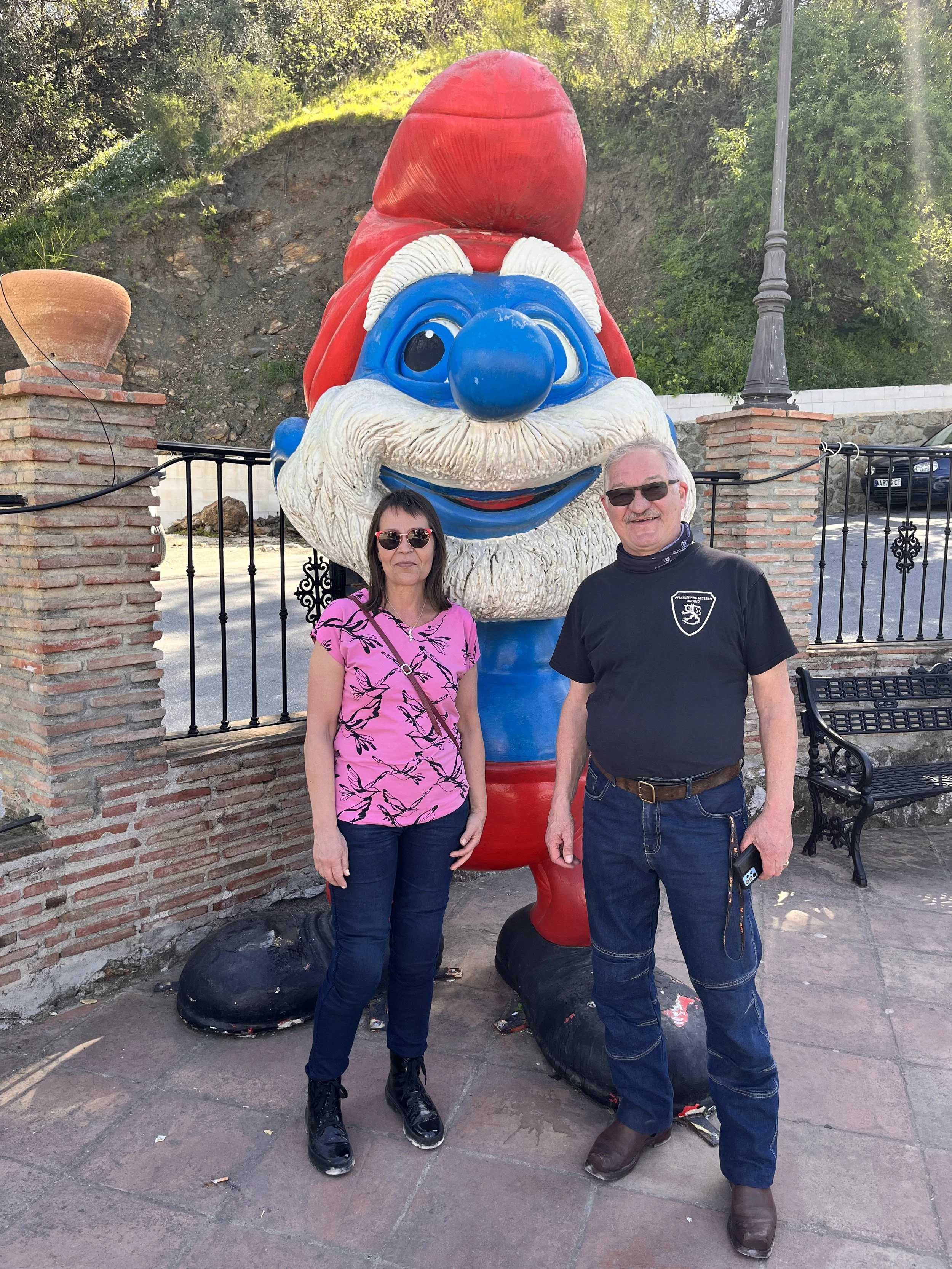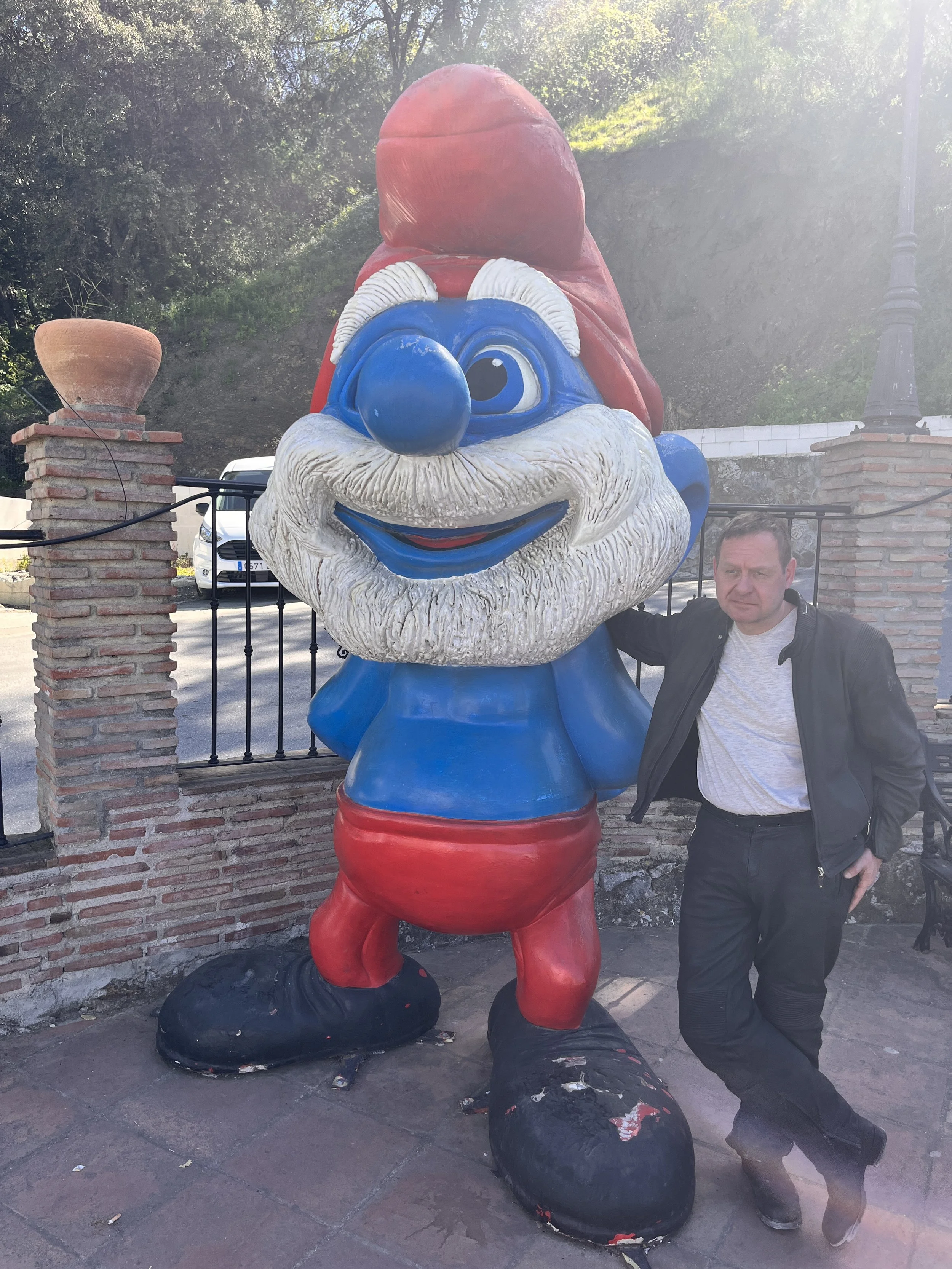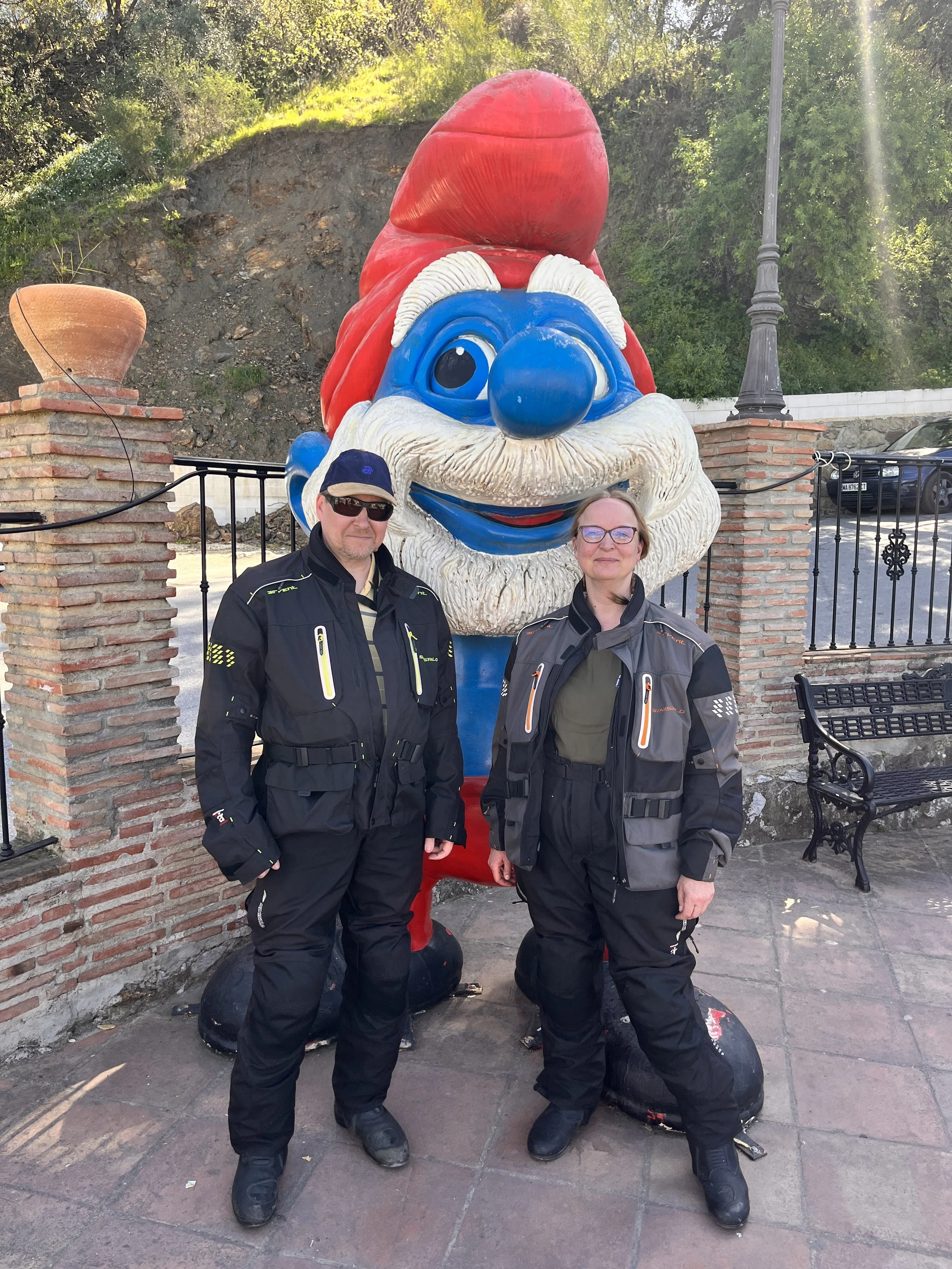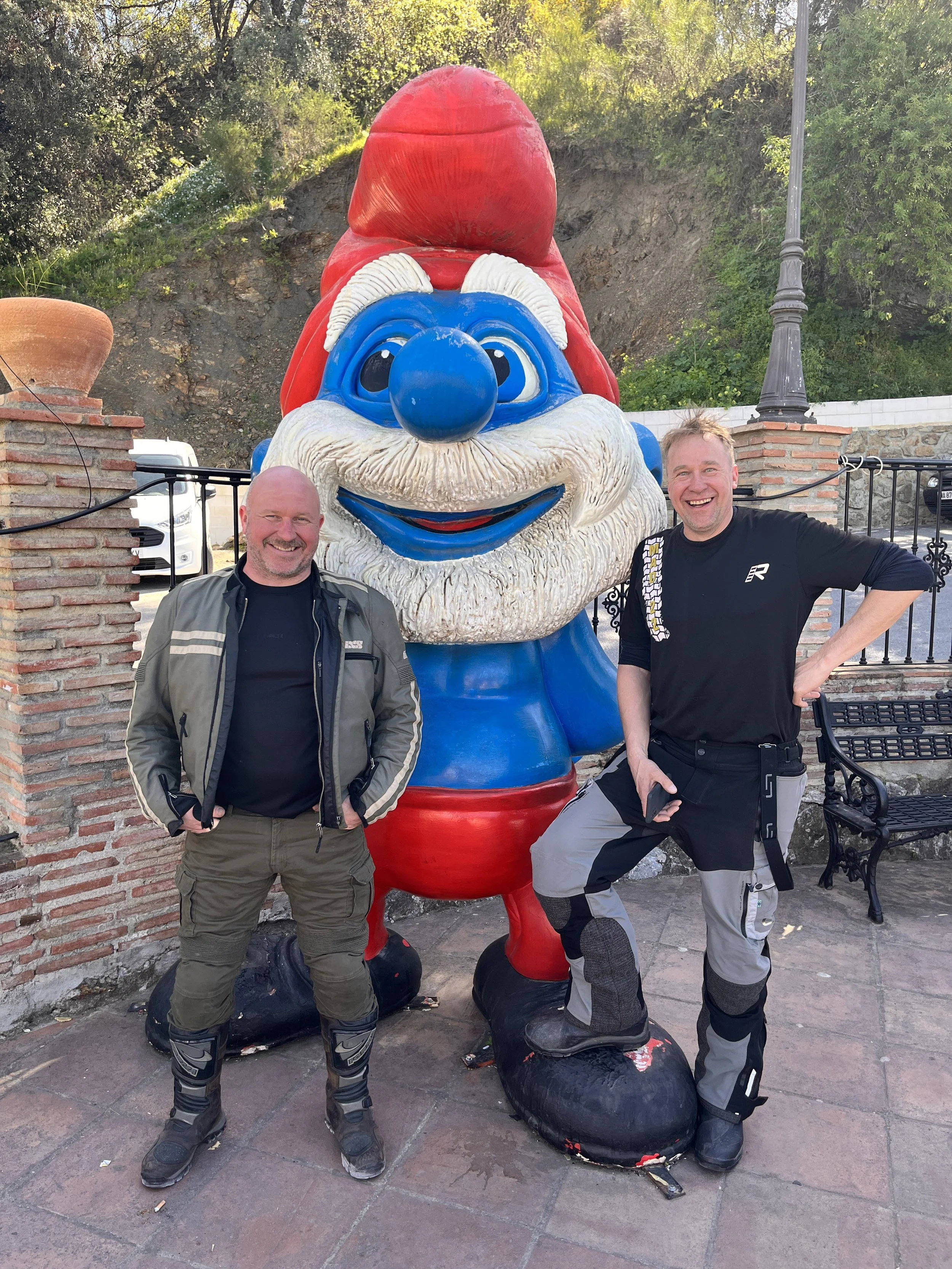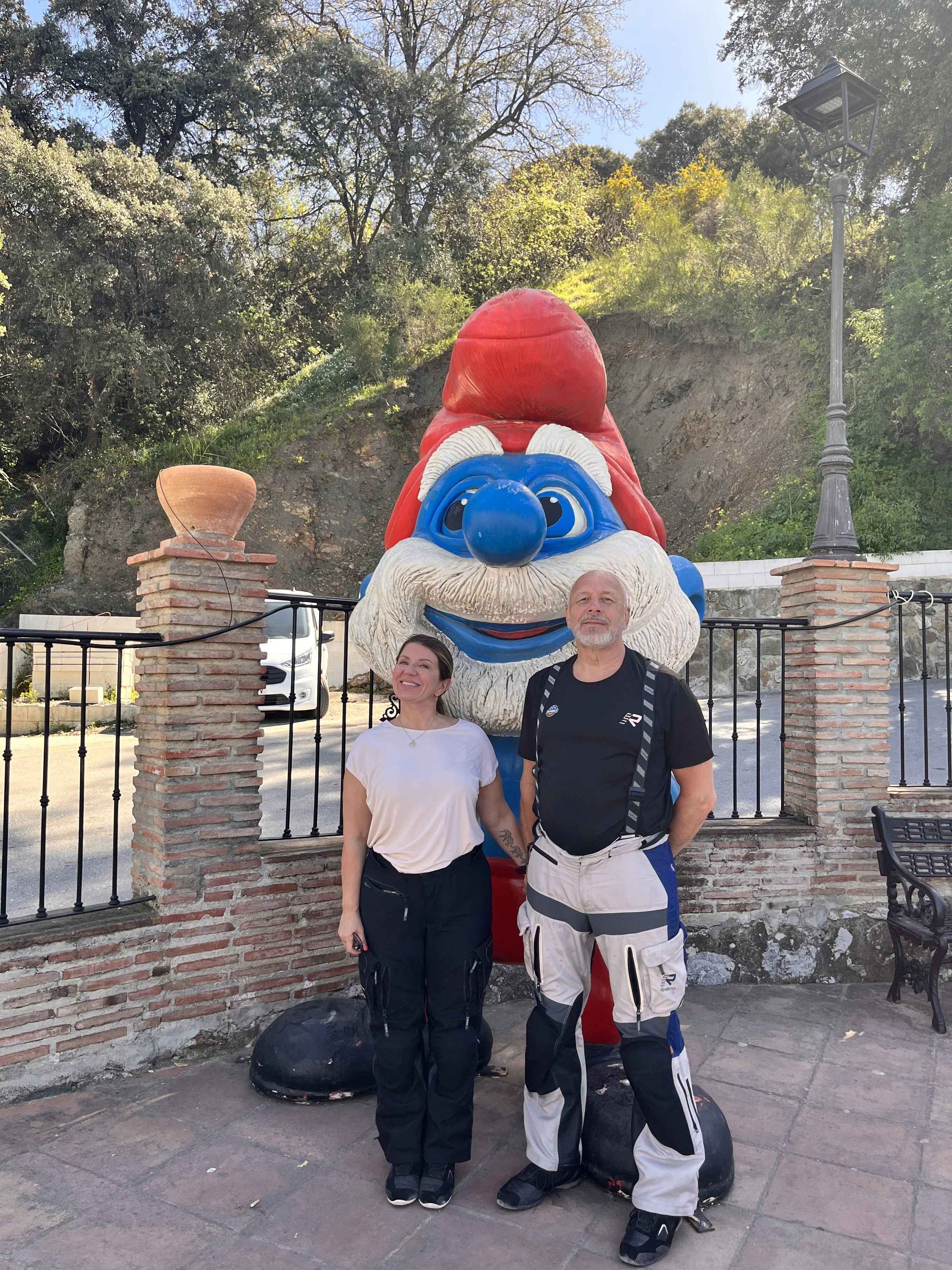 Suunta otettiin kohti Smurffikylää ja samalla otettiin pakolliset yhteiskuvat Smurffin kanssa. Jäi ehkä mainitsematta, että matkan varrelle sattui mutka jos toinenkin, joista nautittiin täysin siemauksin. Näiden mutkien myötä lumikola-ote alkoi vaihtua jo luontevasti rentoon kahvasta puristamattomaan otteeseen ja näissä merkeissä matka jatkui kohti Rondaa.