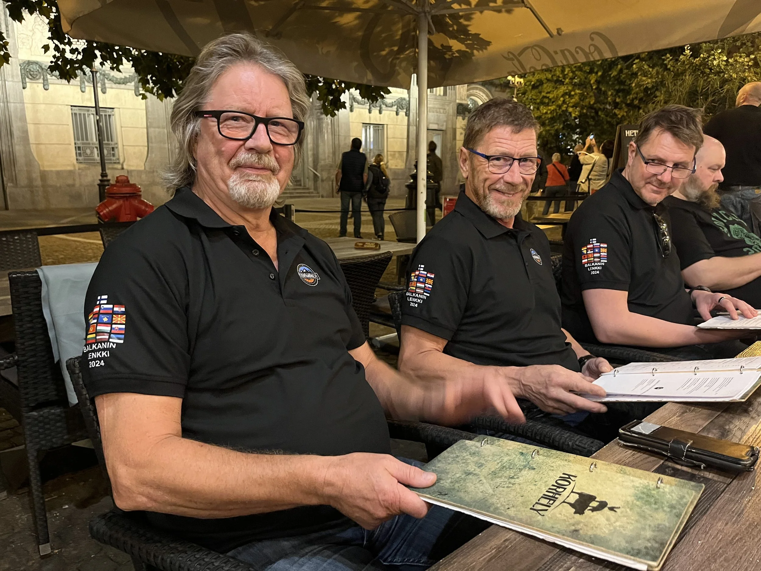 Jarmo Ami ja Pekka tilailevat virallista iltapalaa matkan virkapaita päällään.