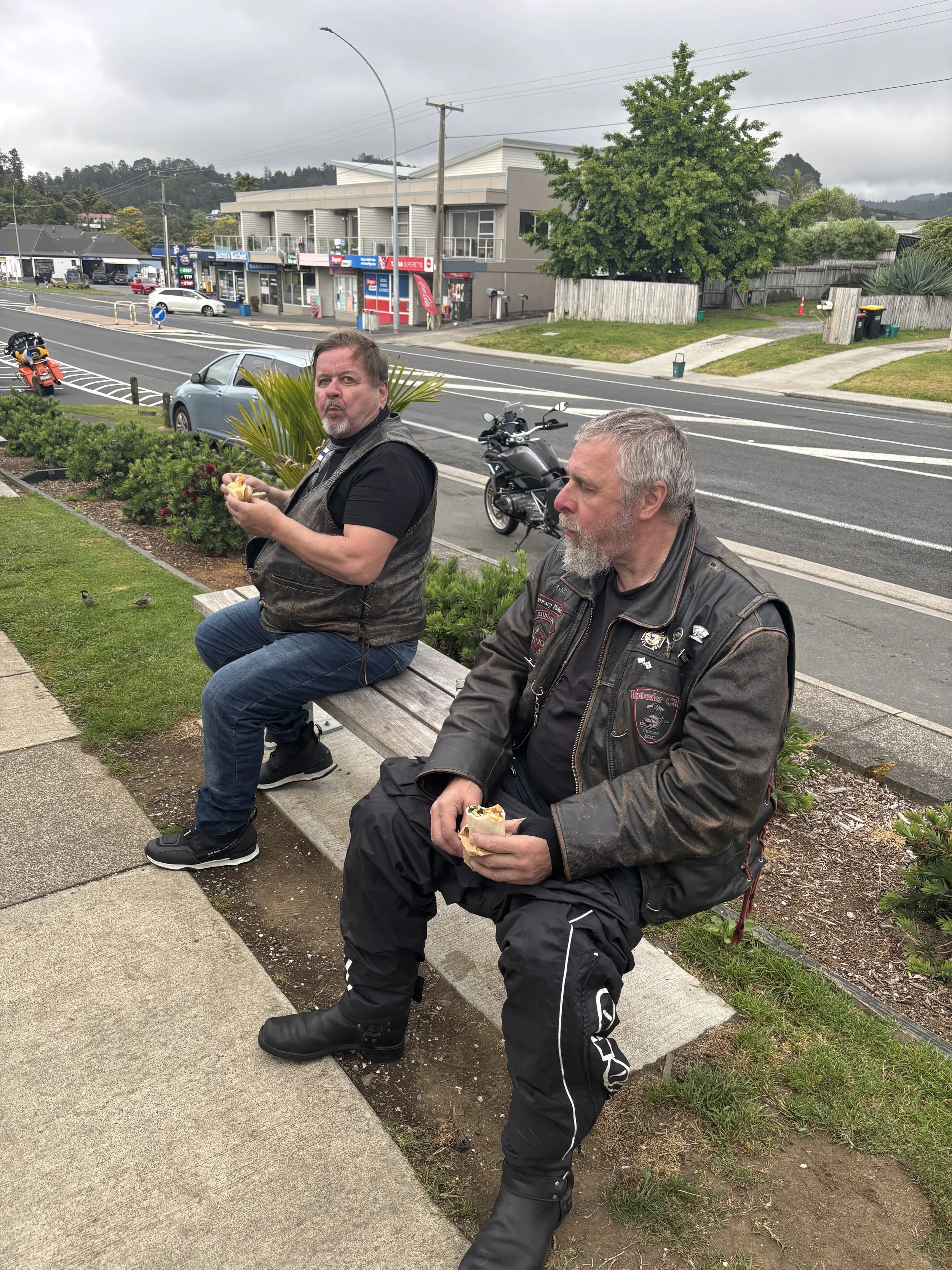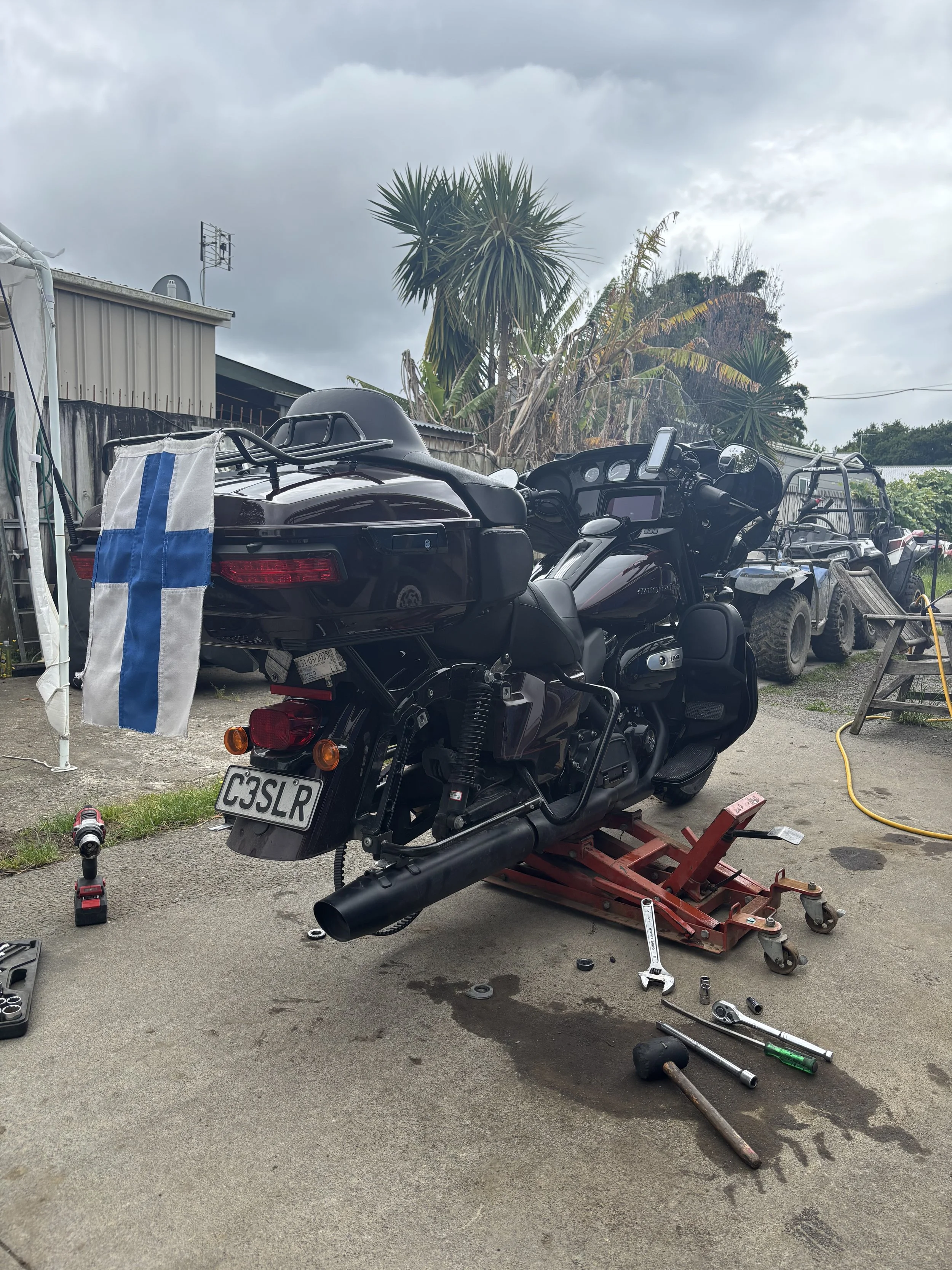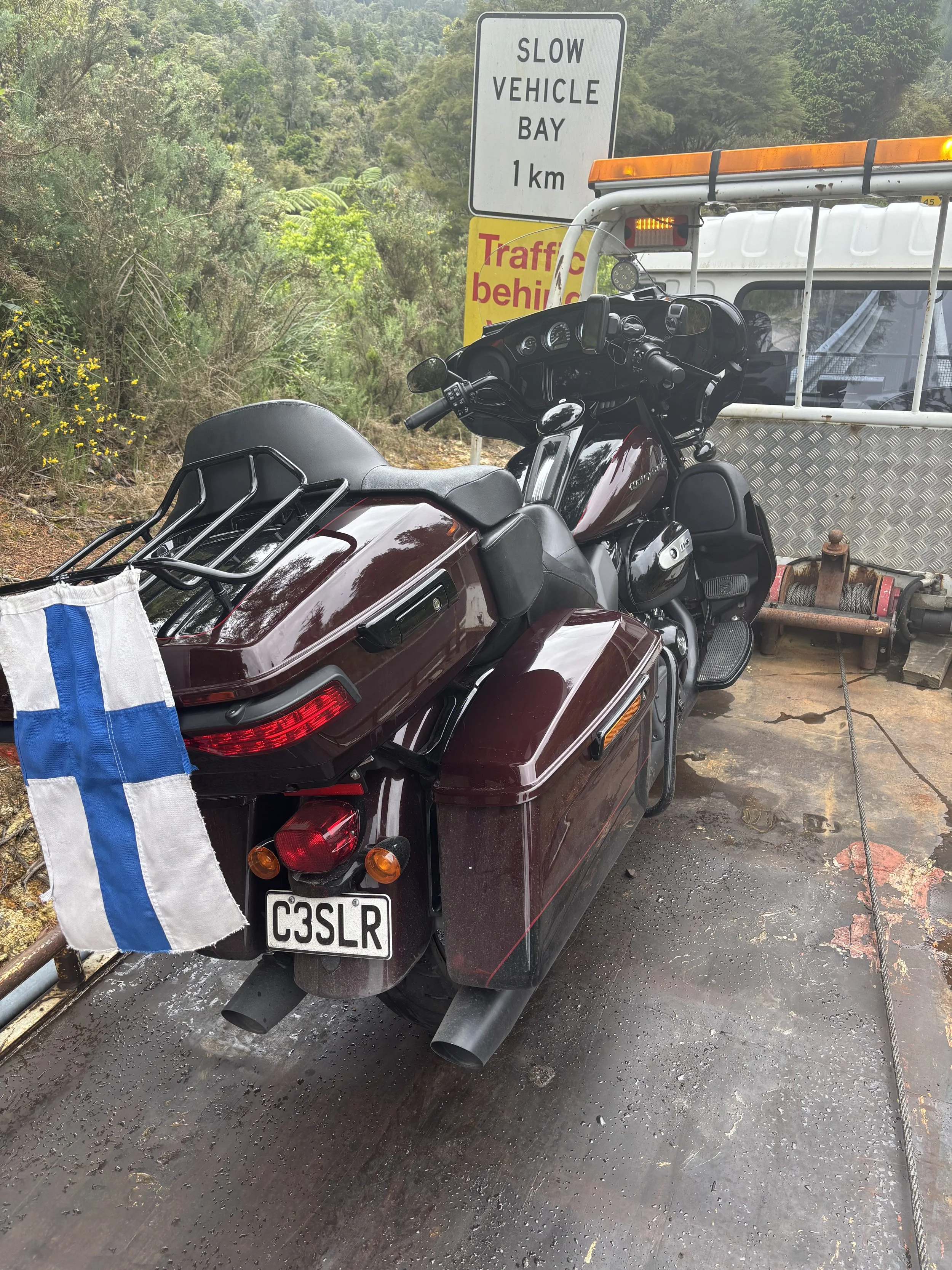 Ja sattuihan sitä. The Harhaanjohtajan harrikasta hajosi takarengas. Ja tietysti vuoristossa ilman kunnollista mobiili kenttää. No onneksi lähinpään kylään matkaa vain 10 km ja porukka sinne apua huutamaan. Sieltä saatiin hinausauto harrikkaan hakemaan ja vei minut MP korjaamolle. HD vuokraamo toi Auckandista uuden kumin ja asentaja pääsi hommiin. Meni siinä muutama tunti.