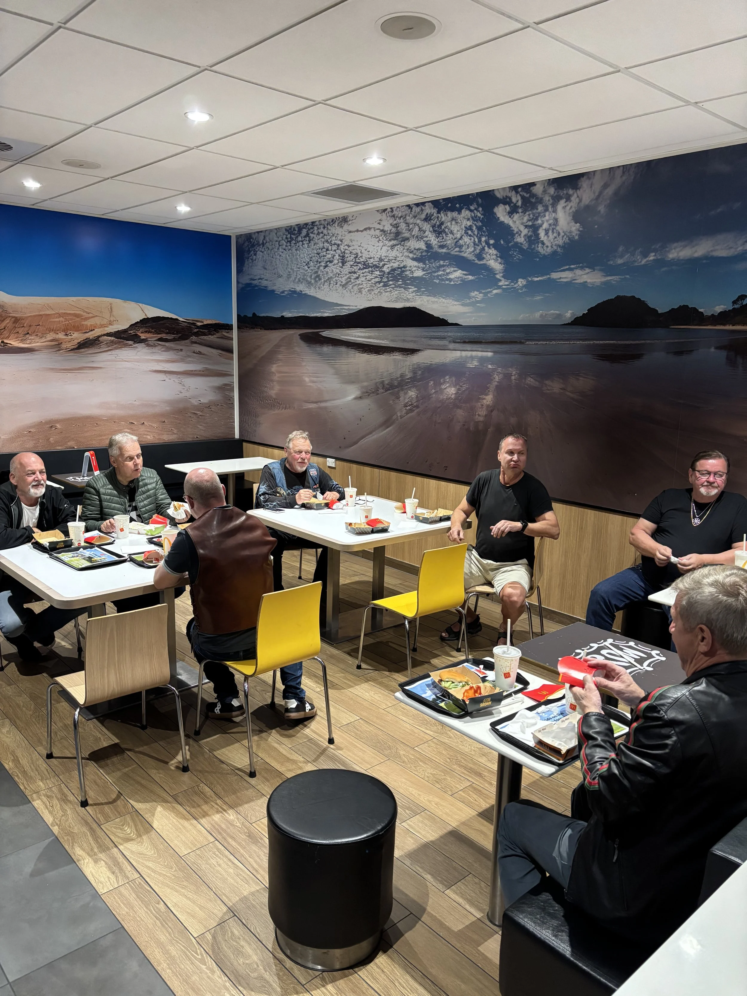 Muiden pyörien osalta paperi jne hommat olivat melko valmiina. Kamat kasaan, koneet käyntiin ja tien päälle. Ja ensimmäisenä etsimään aamiaista. Sellainen löytyi ja ihan amerikan malliin