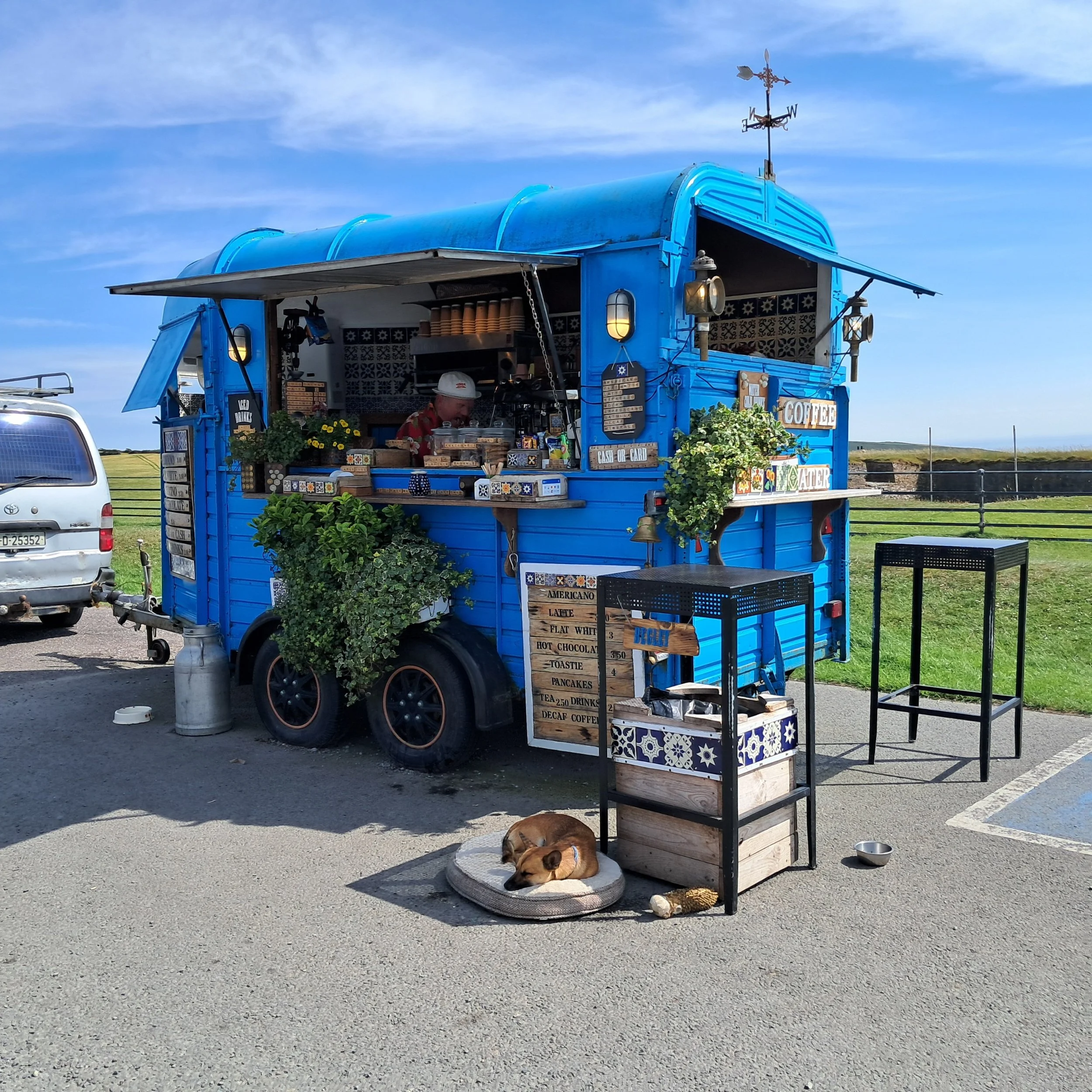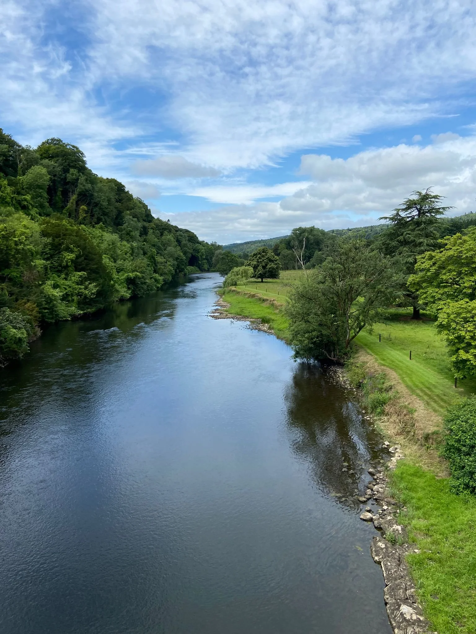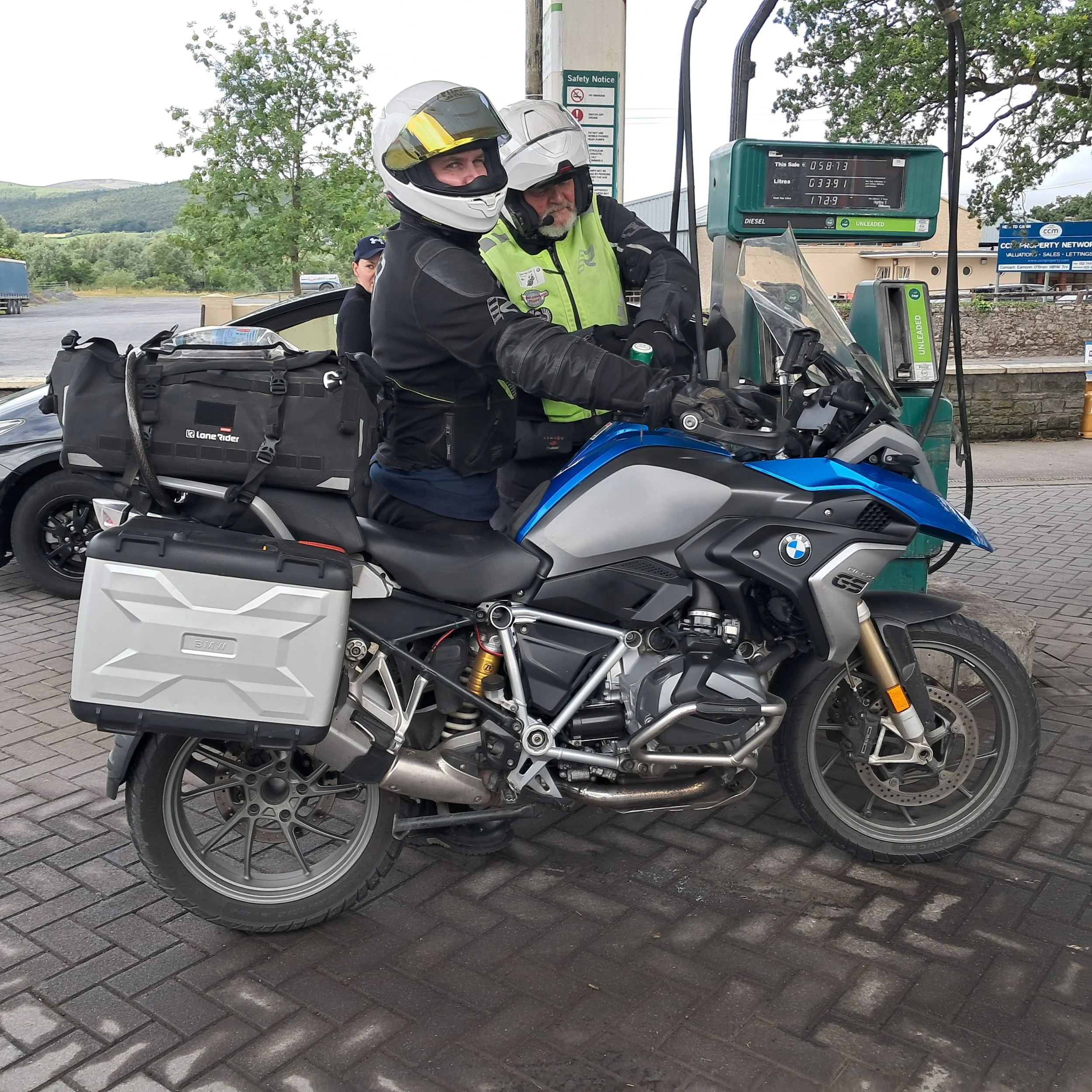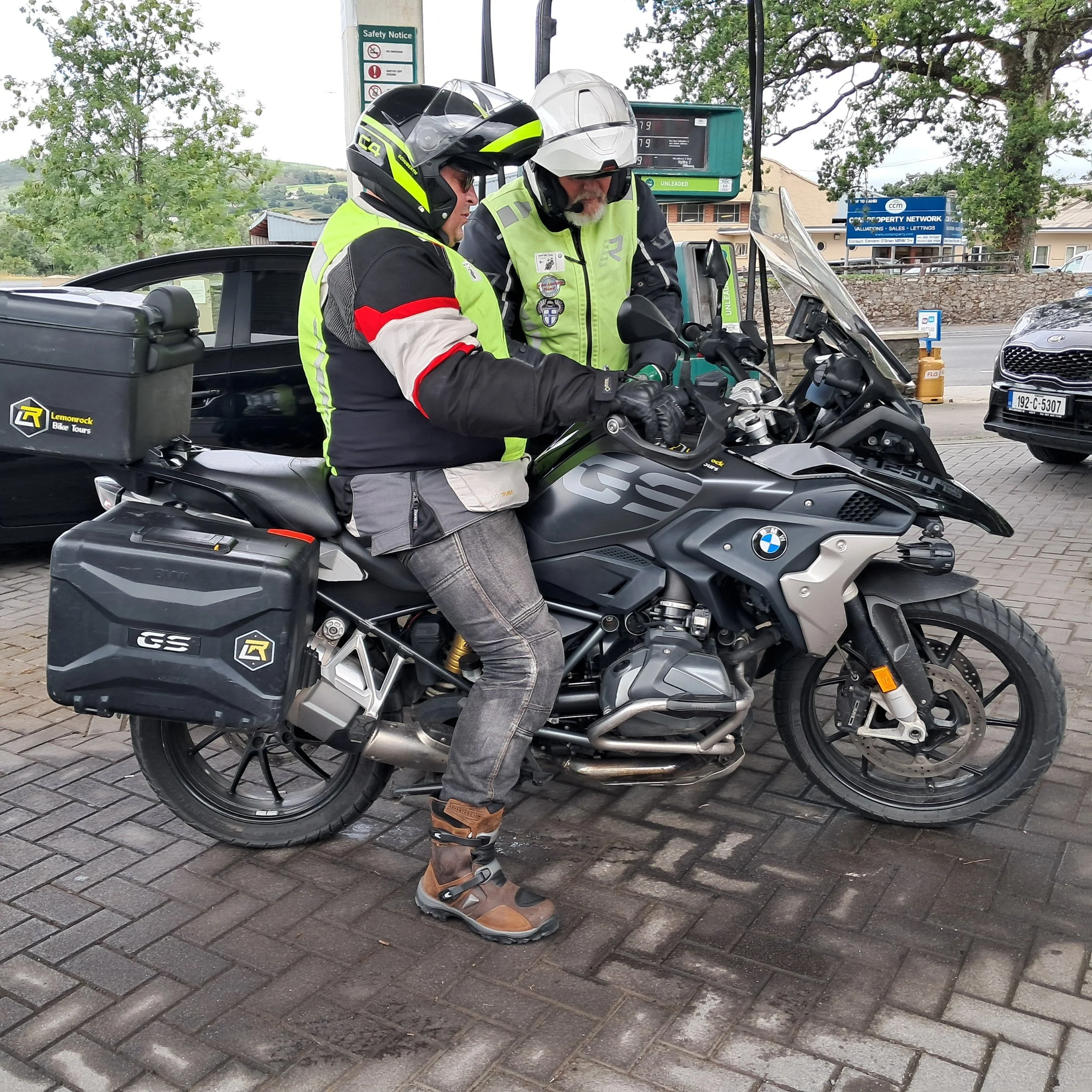 Tästä jälleen kohden etelää. Matkamme varrella pysähdymme Suir-joen saareen rakennetun Cahirin linnan edustalla. Kyseinen linna on yksi maan parhaiten säilyneitä normannilinnoja. Pian tämän jälkeen ajoimme tien R668 ja tätä voin todella suositella. Monin paikoin tosi mukavaa mopotietä hienoissa maisemissa. Lismoren linnan sivuitse Tallowiin, jossa tankkaus. Päivän hinta 95-oktaaniselle 1, 73 € per litra. Täällä myös lisättiin kaikkien pyörien renkaisiin ilmaa.