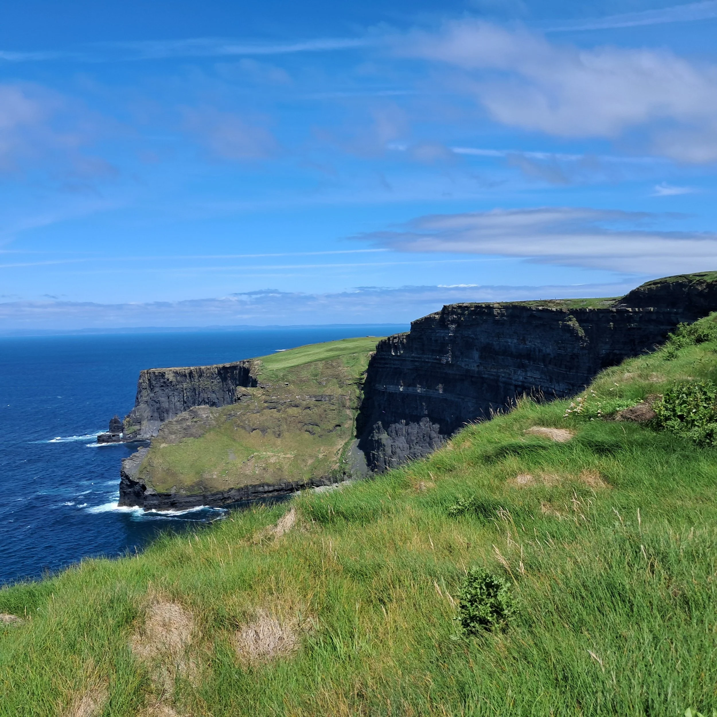 Iltapäivän aluksi saavuttiin Irlannin kuuluisalle nähtävyydelle, eli Cliff of Moherin lähes pystysuorille kallioille. Aivan ”jäätävä” turistirysä. Paljon on muuttunut sitten viime käyntini. Sisäänpääsy 15 € per nuppi ja kävellä sai tarpeeksi ylös ja alas. Ylhäältä huikeat näkymät, mutta erittäin voimakas ja puuskainen tuuli. Mikäli haluaa tällaisia kallioita bongata, niin rannikolta löytyy vastaavia paikkoja, joissa voi vierailla ilmaiseksi. Toki täältä ostettu magneetti tms. on monille se juttu.