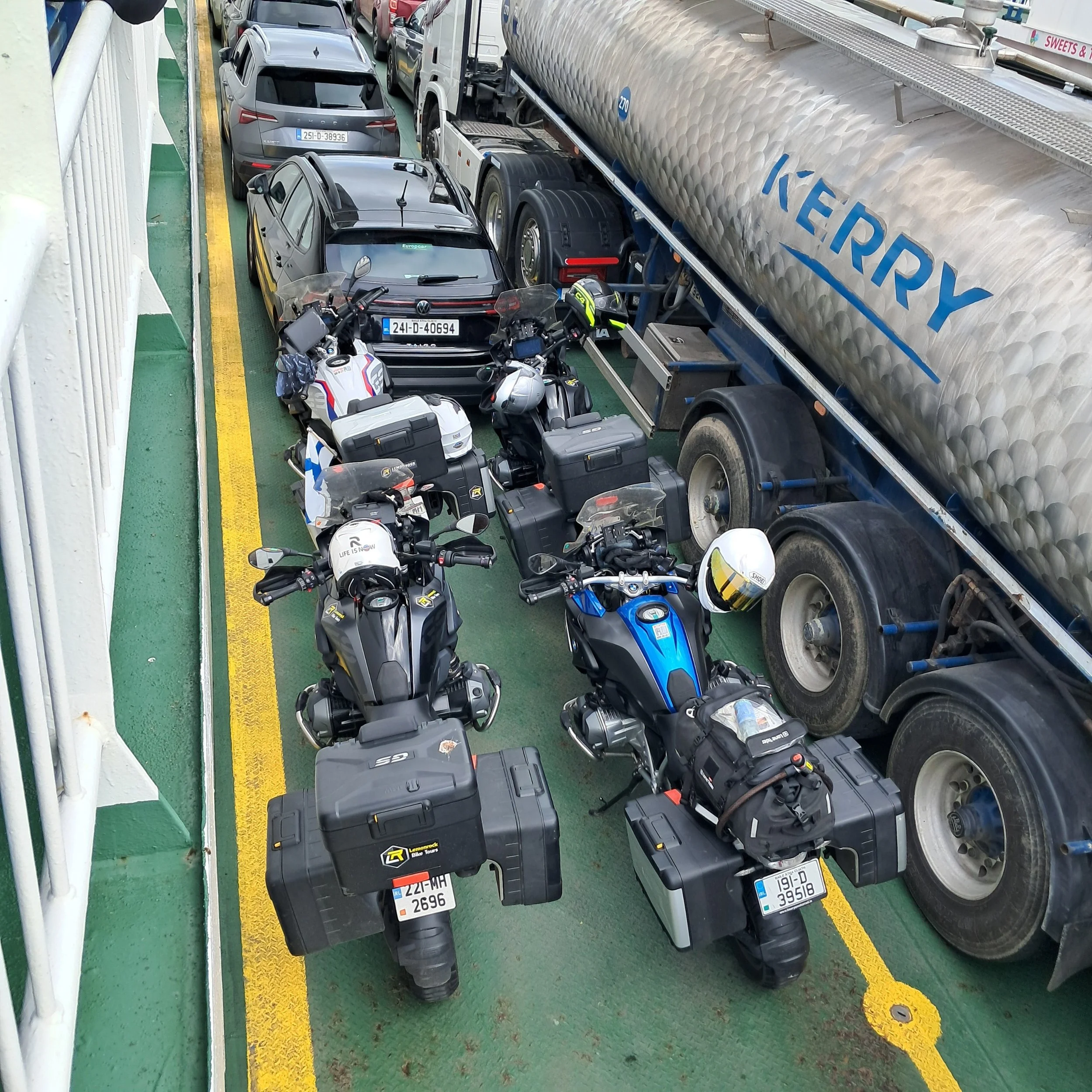 Ring of Kerrya eteenpäin. Vaihtelevia maisemia ja tienpintaa. Tralee - Listow välillä oikein isoakin baanaa. Tarbertissa kahvit ja sitten siirtyminen saman kylän pieneen satamaan, josta lautalla Shannonin joen ylitse Killimeriin. Samalla County vaihtui Kerrystä Clareen.