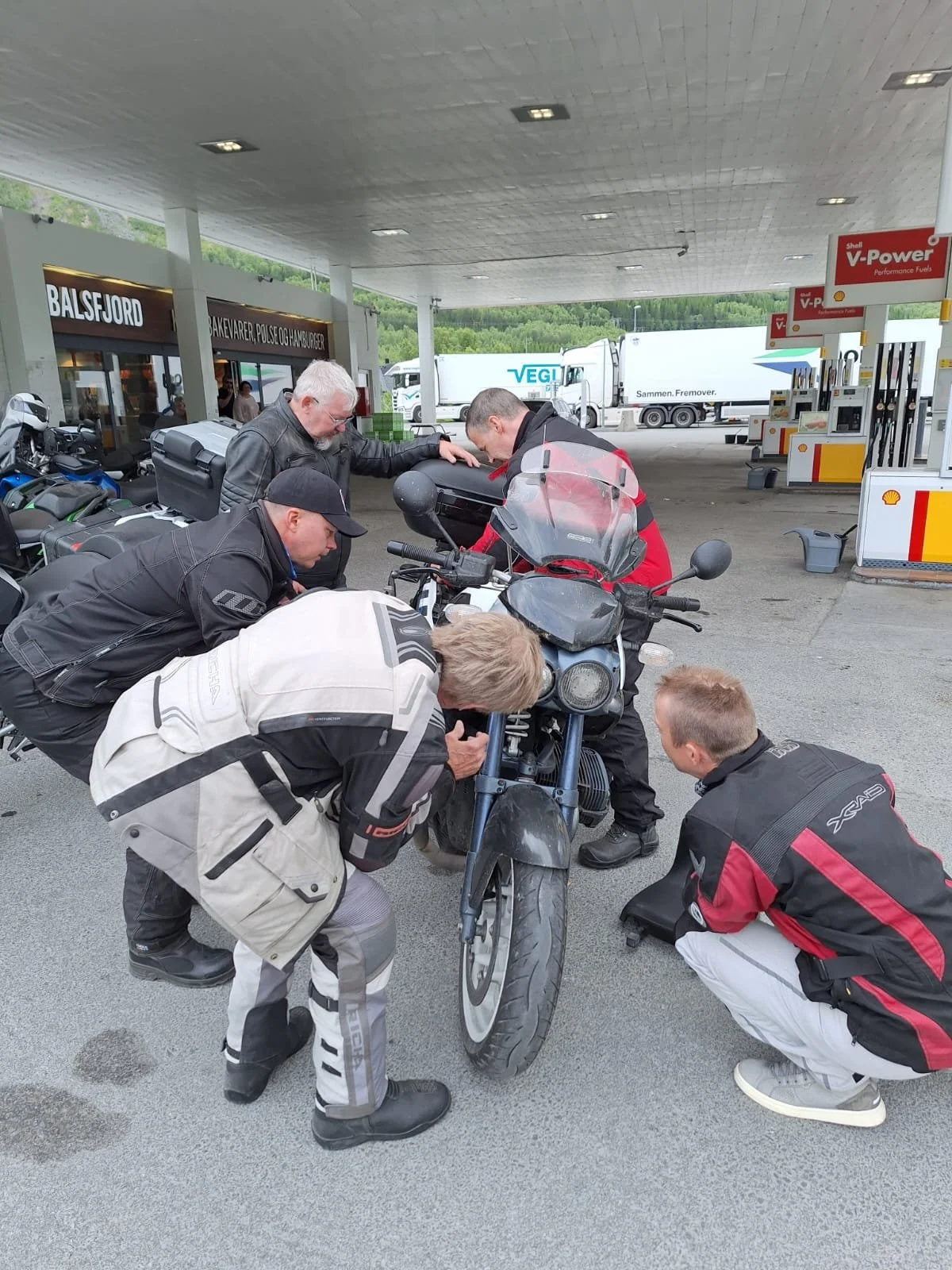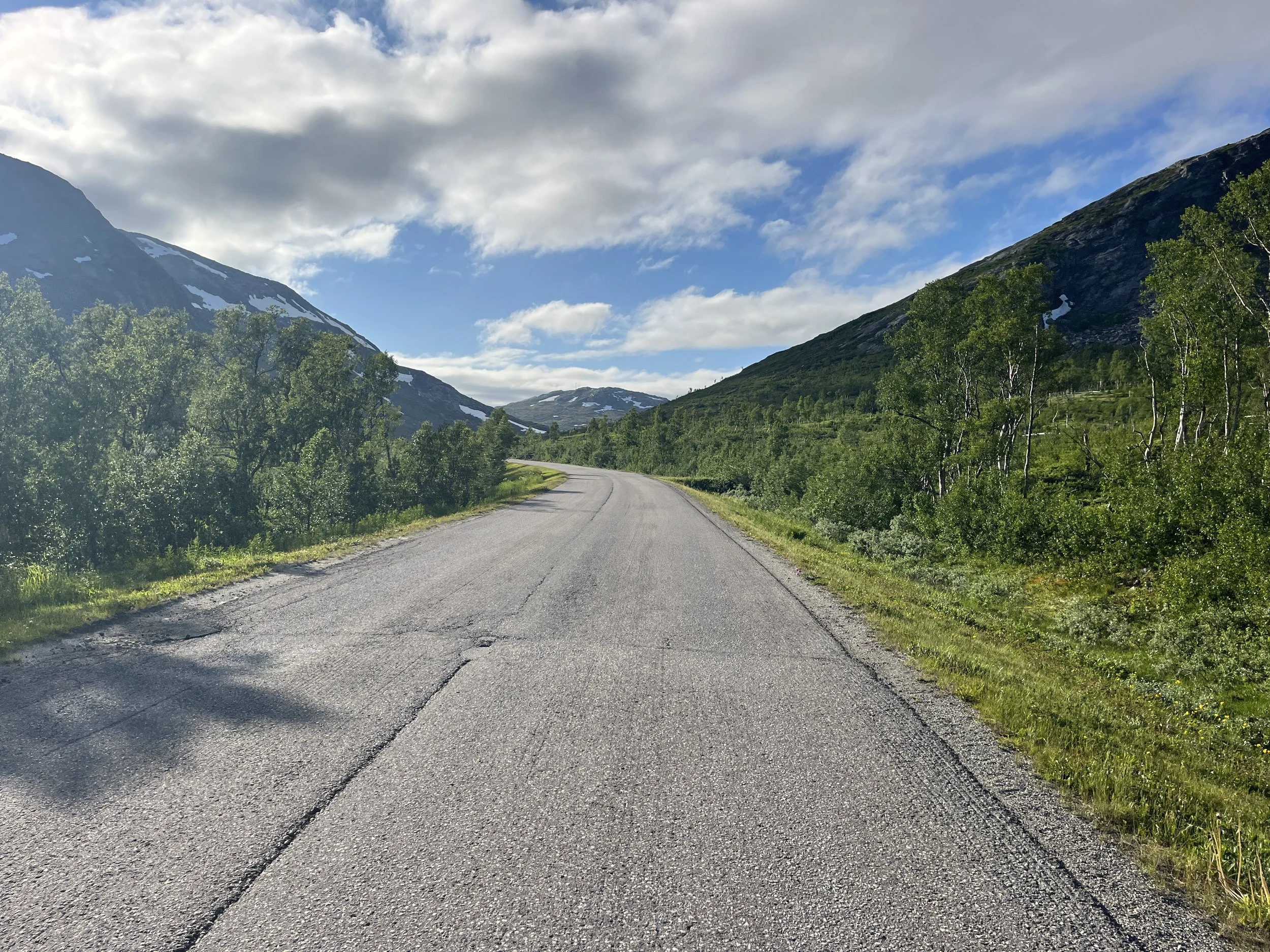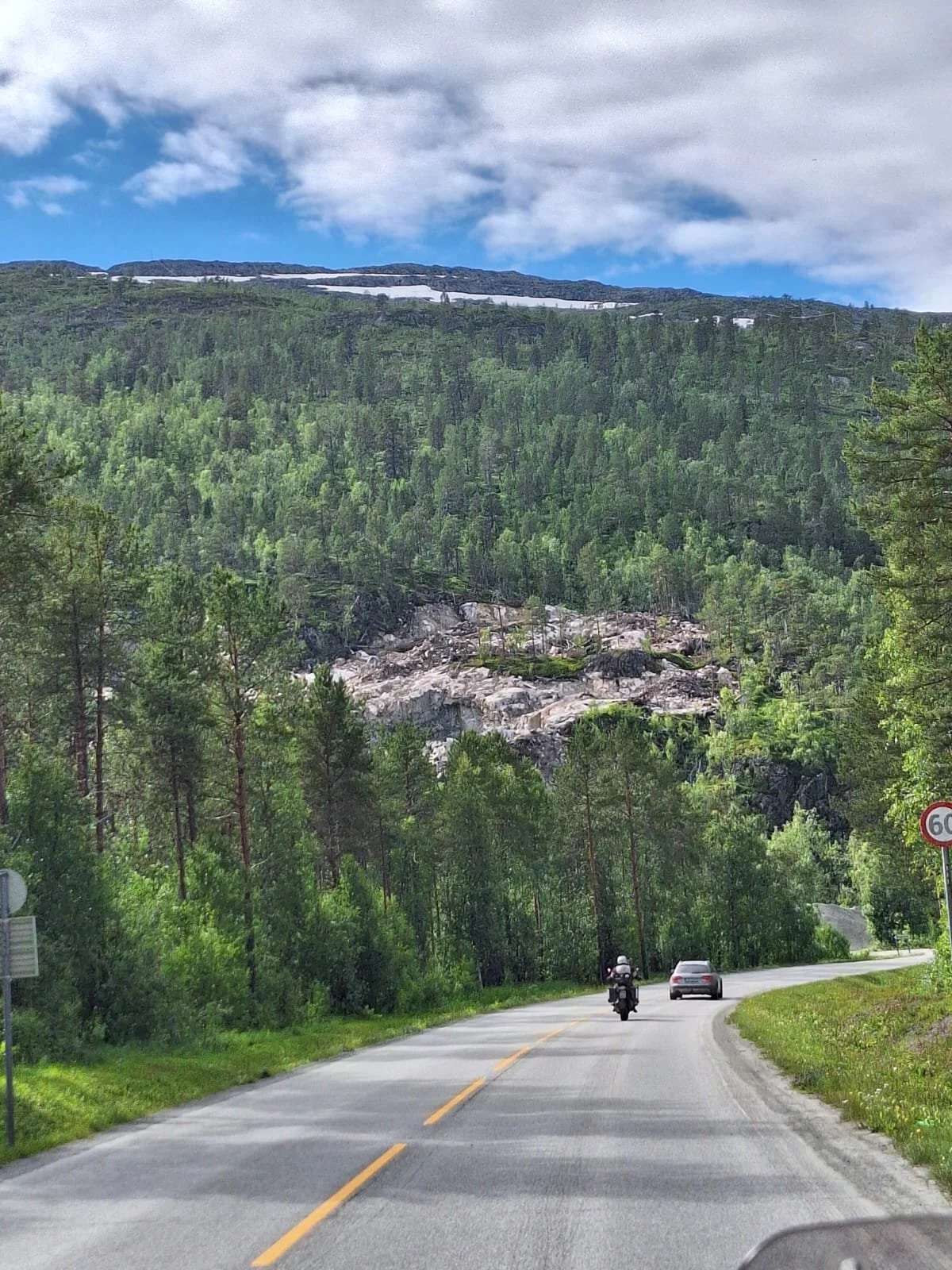 Koska oli sunnuntai ja Norja on sunnuntaisin suljettu, akkua ei saatu mistään. Akun voisi ehkä saada maanantaina Senjan pääkaupungin Biltemasta, Finnsnesistä, joka oli tämän ajopäivän etappi muutenkin. Lähdimme jatkamaan matkaa ja Jouko jäi odottamaan hinuria, jota ei muutamaan tuntiin lupauksista huolimatta kuulunut. Sitten Jokke hyppäsi taxiin ja ajoi sillä Finnsnesiin. Pyörä saisi tulla perässä, ja toivottavasti tulee myös…
