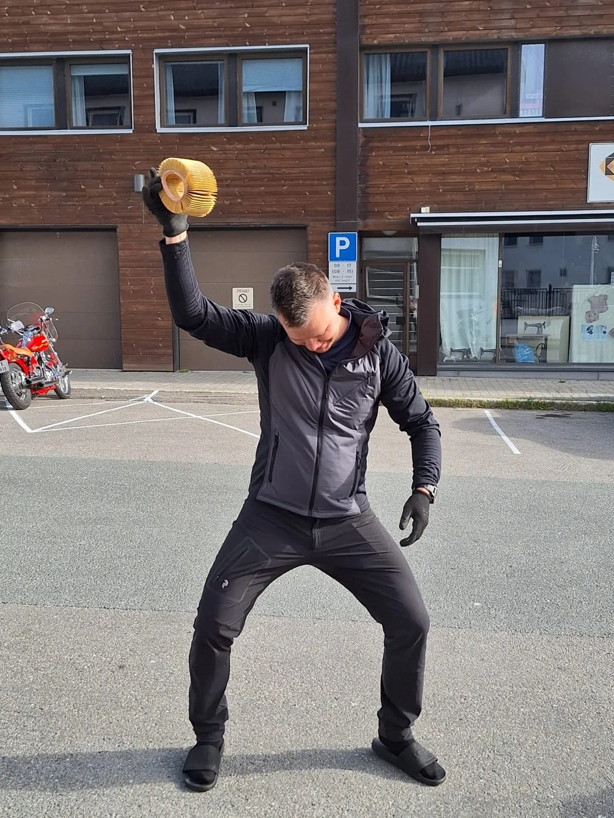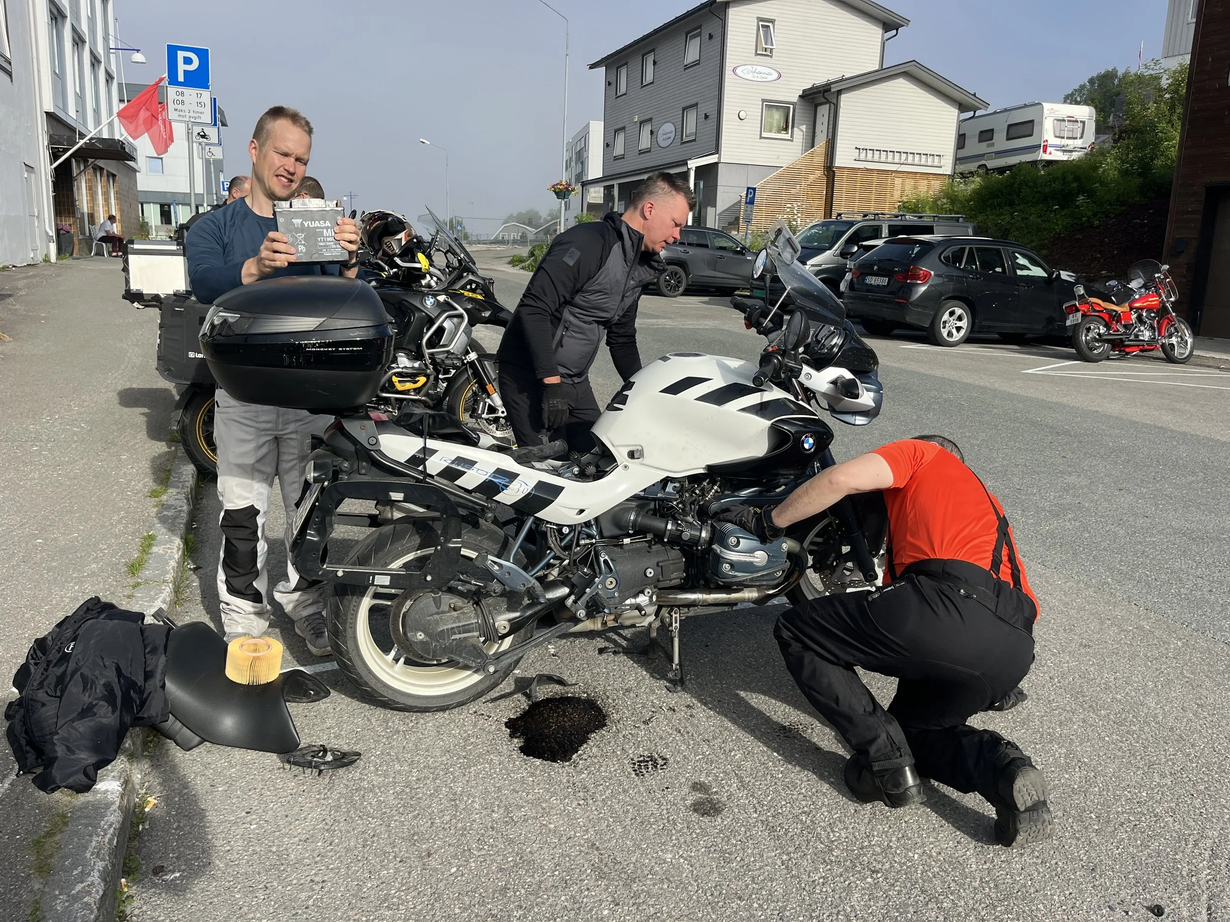 Klo 7.25 hinuri porhalsi sovitusti pihaan ja pian Bemmi laskettiin pihamaalle odottamaan jatkotoimia. Tekninen tiimi, eli Taito, Ville ja Mika alkoivat purkaa pyörää samaan aikaan, kuin Joukon ja Mikan kaupallinen tiimi singahti Biltemaan akkukaupoille klo 8.00:ksi.