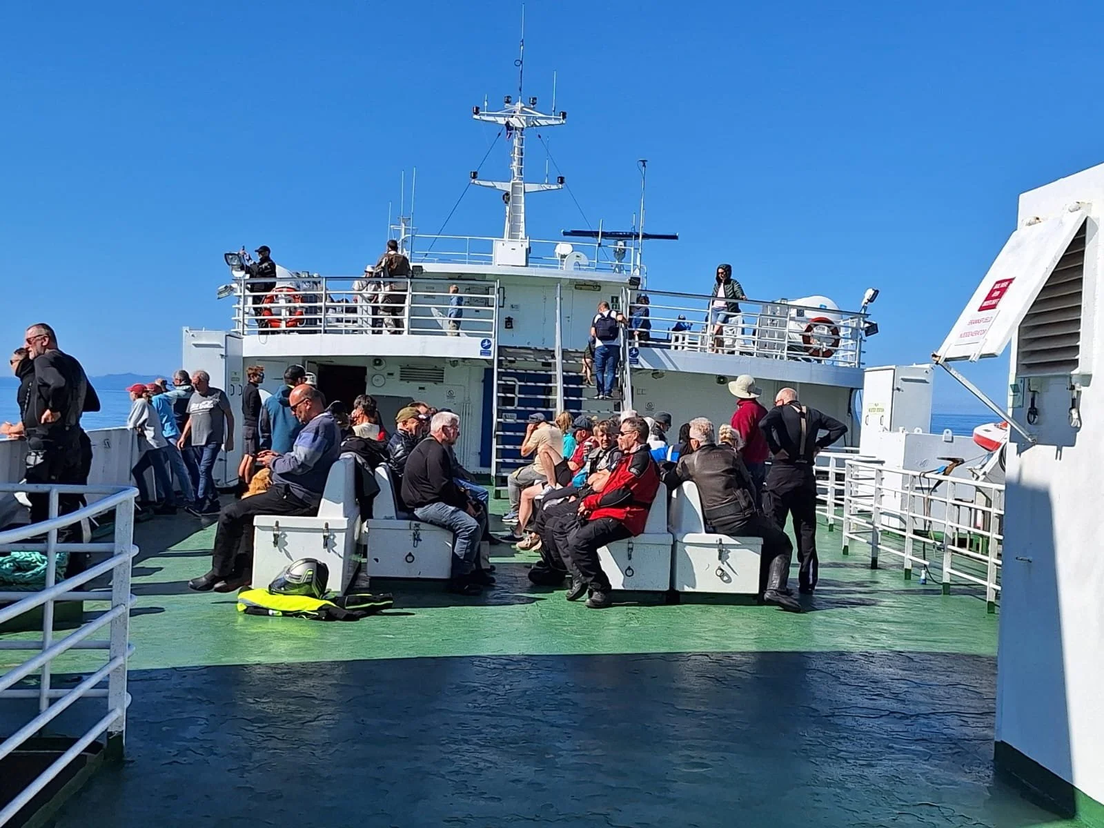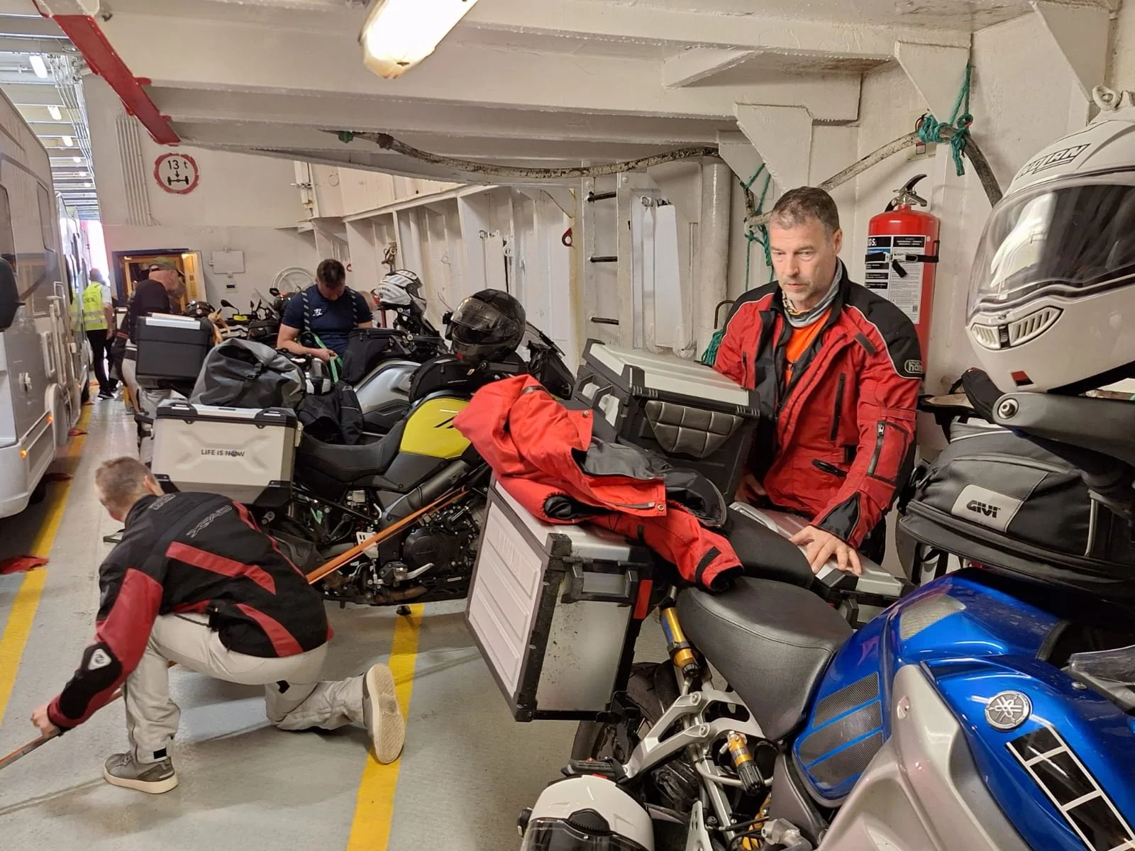 Lyhyen tiedustelu-operaation jälkeen päästelimme jonon ohi sen kärkeen tietoisina siitä, että jokaisessa laivassa on prätkäkiintiönsä ja erityiset paikat, minne autoja ei sijoitettaisi, mutta mopo mahtuu mukavasti.