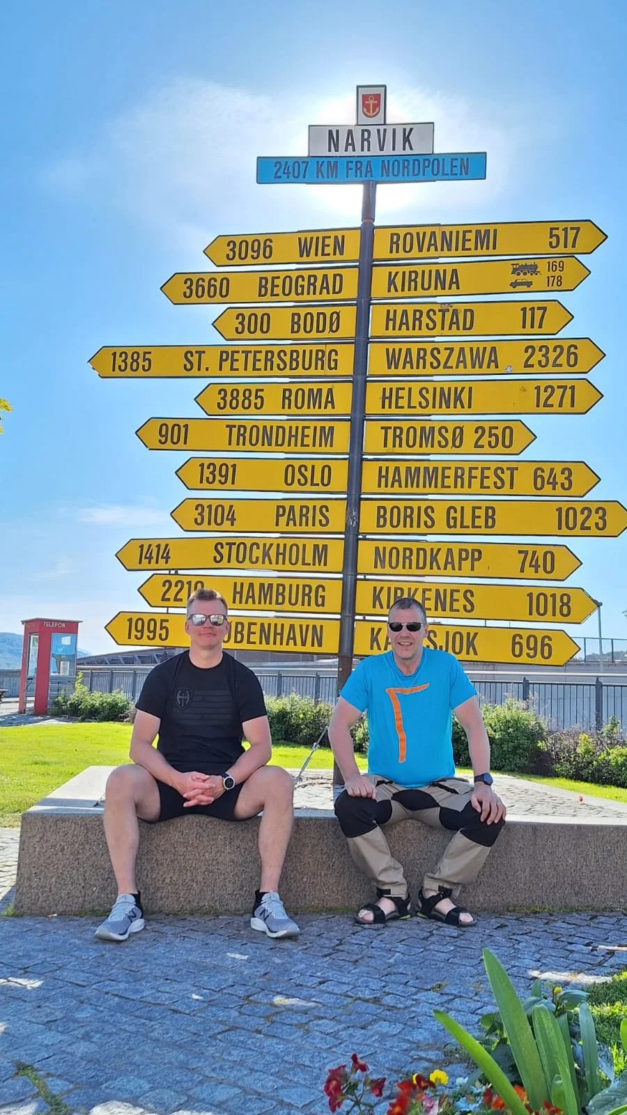 Mika ja Taito Narvikin risteyksessä. Jospa vaikka valitsisi huomenna tuon kolmas vasemmalta -suunnan ja ajeltaisiin aamulla Bodöön.
