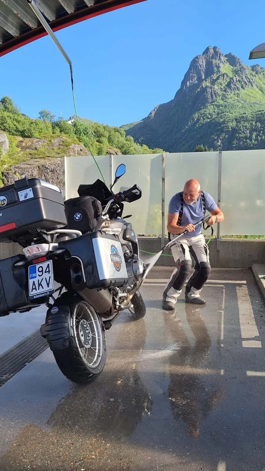 Pyörät tankattiin läheisellä huoltamolla päivän ajeluiden turvaamiseksi, sillä Svolverista Narvikiin ei juurikaan ole, tai ei siis ole lainkaan asutusta tai palveluita. Hyvä ruoka ja parempi mieli, joka on käännettynä ajan henkeen näin; mitä puhtaampi pyörä, sen hauskempi reissu. Itsepalveluna hoidettu pyörien pesu vei turhat hyttyset ja kurat pyöriemme päältä, joten matka sai alkaa puhtain pyörin ja raikkain mielin.