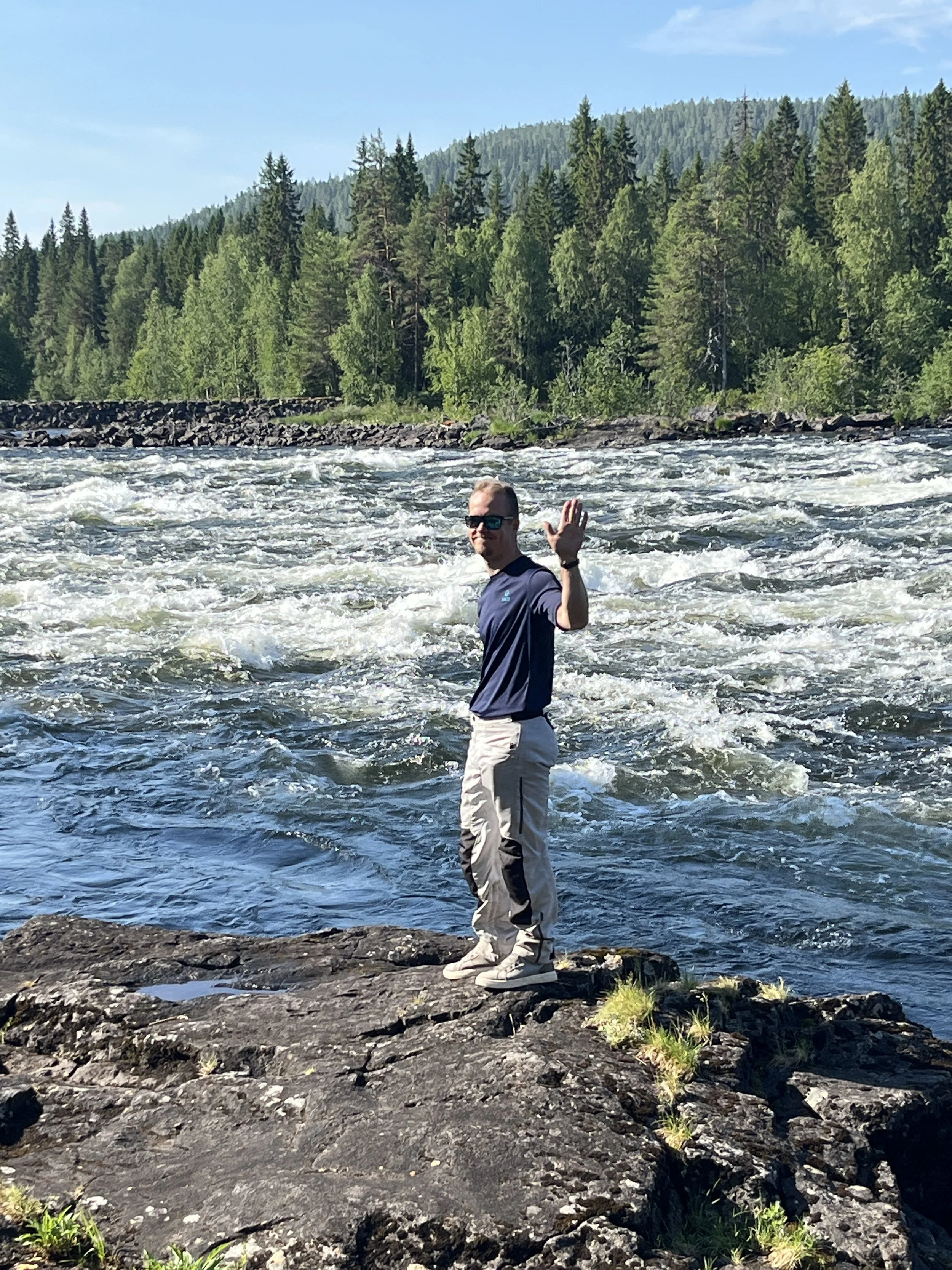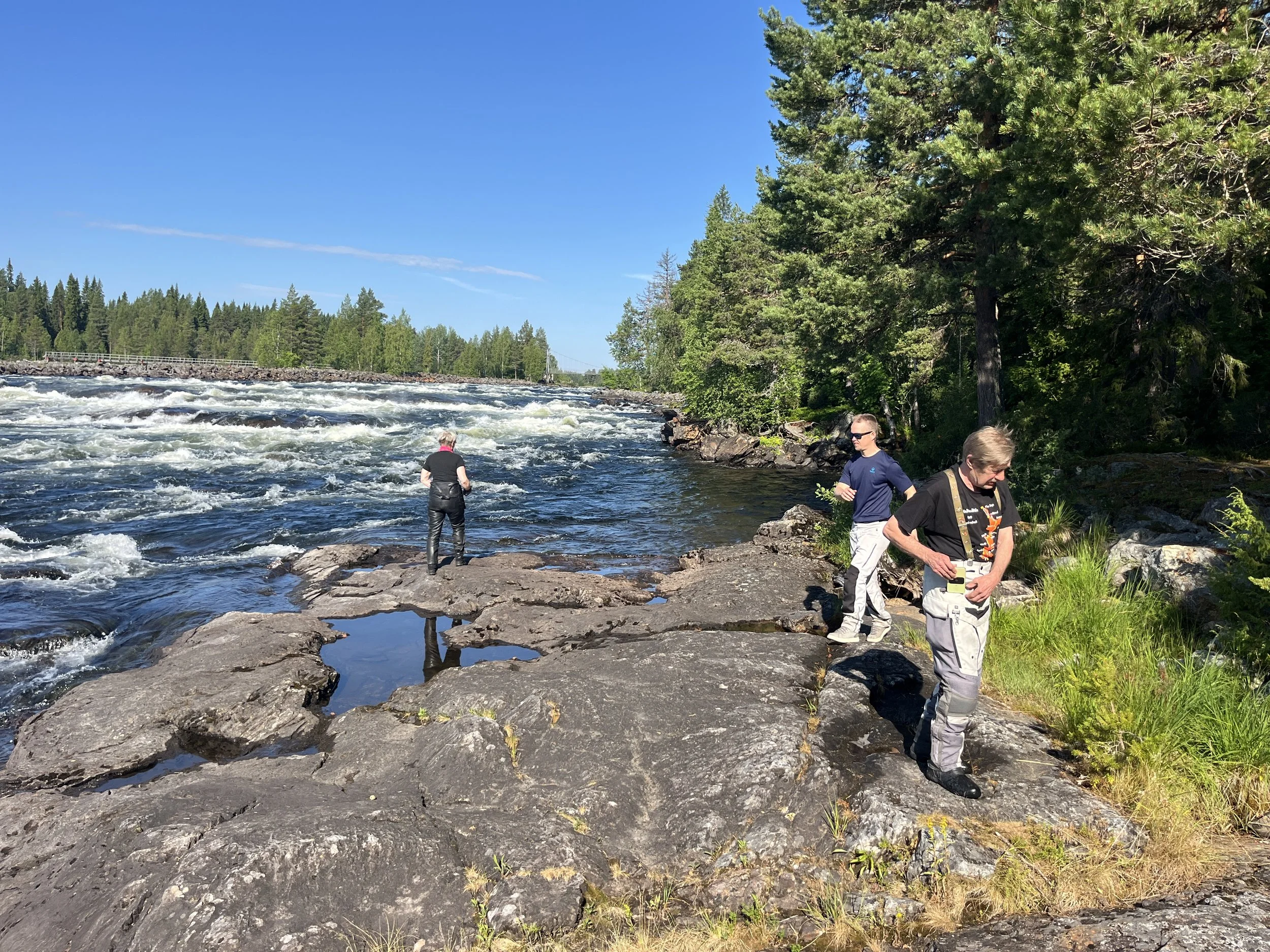Ruotsin Lapissa koskia ja puroja riittää. Taito arvailee kuinka monta kuutiota virtaa tunnissa, ainakin virtaussuunta on jo selvillä. Taustalla Ville.