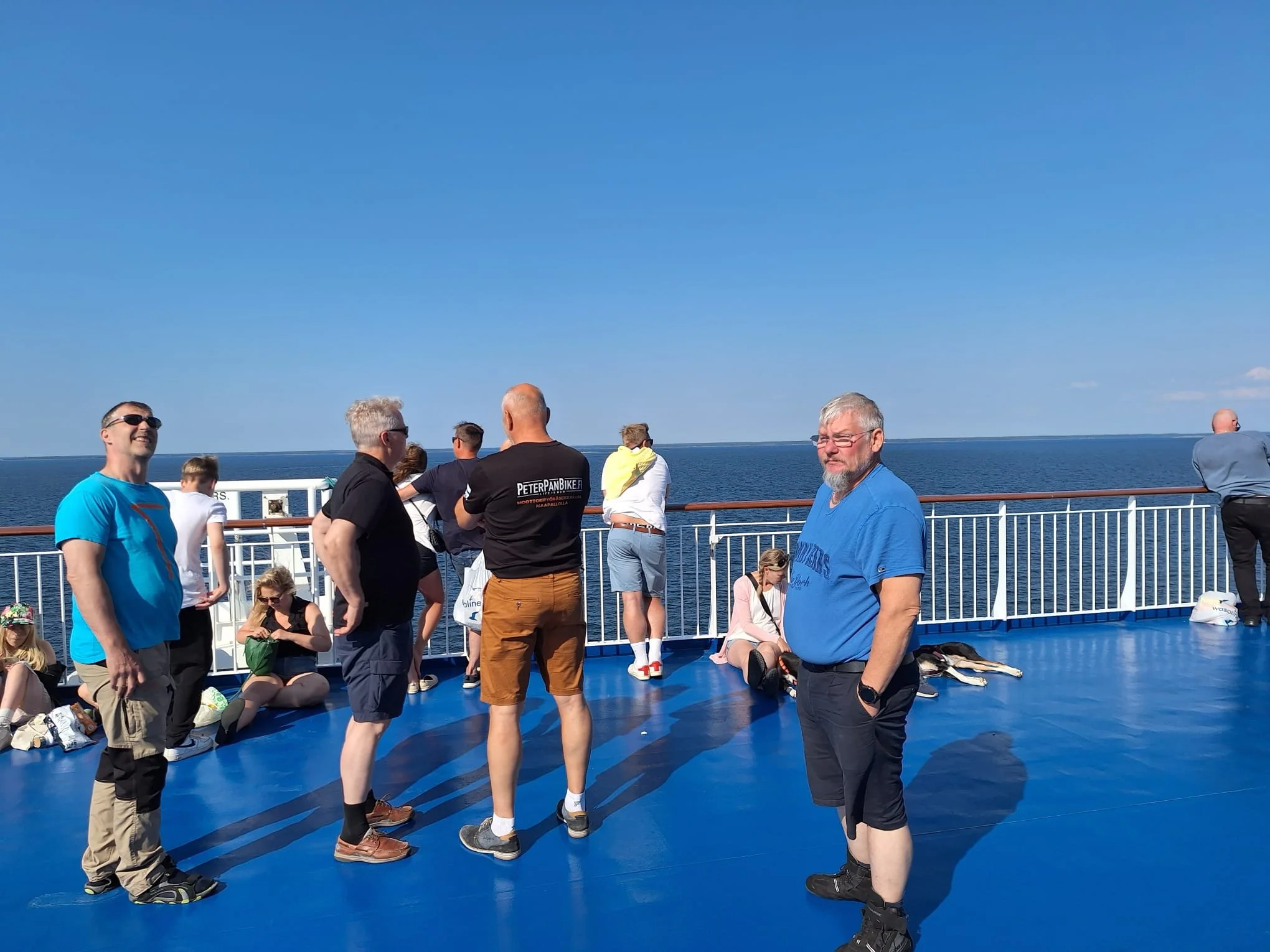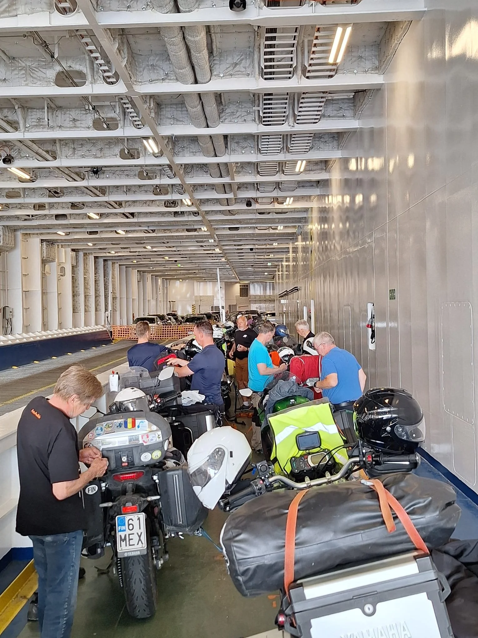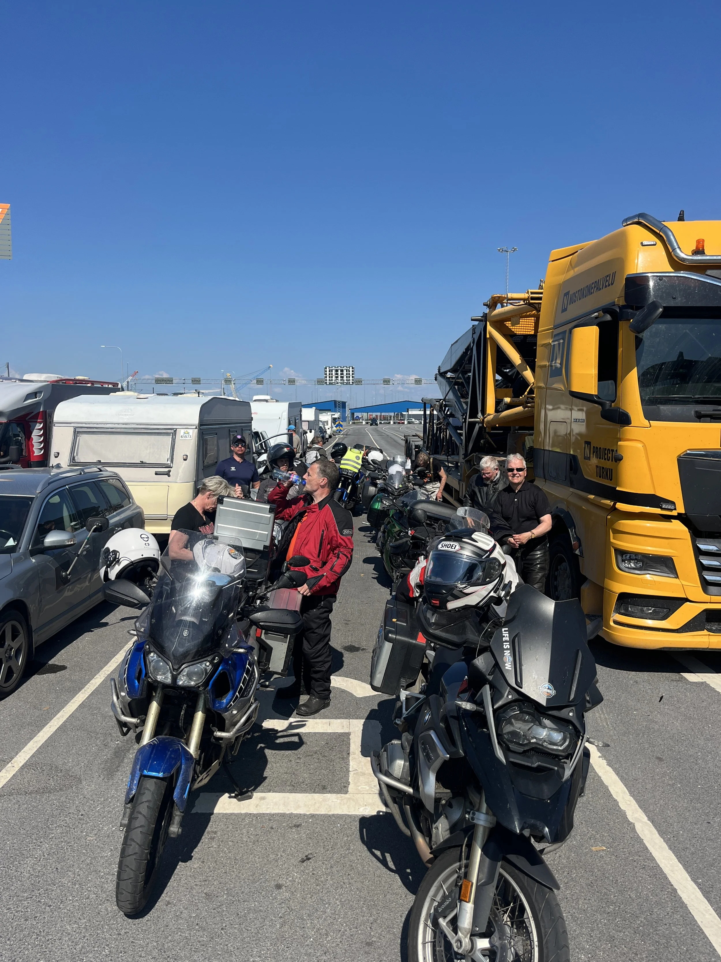 Hieman ennen Holmsundia tankattiin lopputankkaukset, ja ajettiin lauttasatamaan odottamaan pääsyä Wasa Linen laivaan, jota jo sopivasti lastattiin. Ja jälleen kerran, niin kuin oli tullut tavaksi, laivaan päästiin minimi jonotusajalla. Pyörät sidottiin laivan autokannelle, ja siirryimme lounaalle noin 12.00 jälkeen.