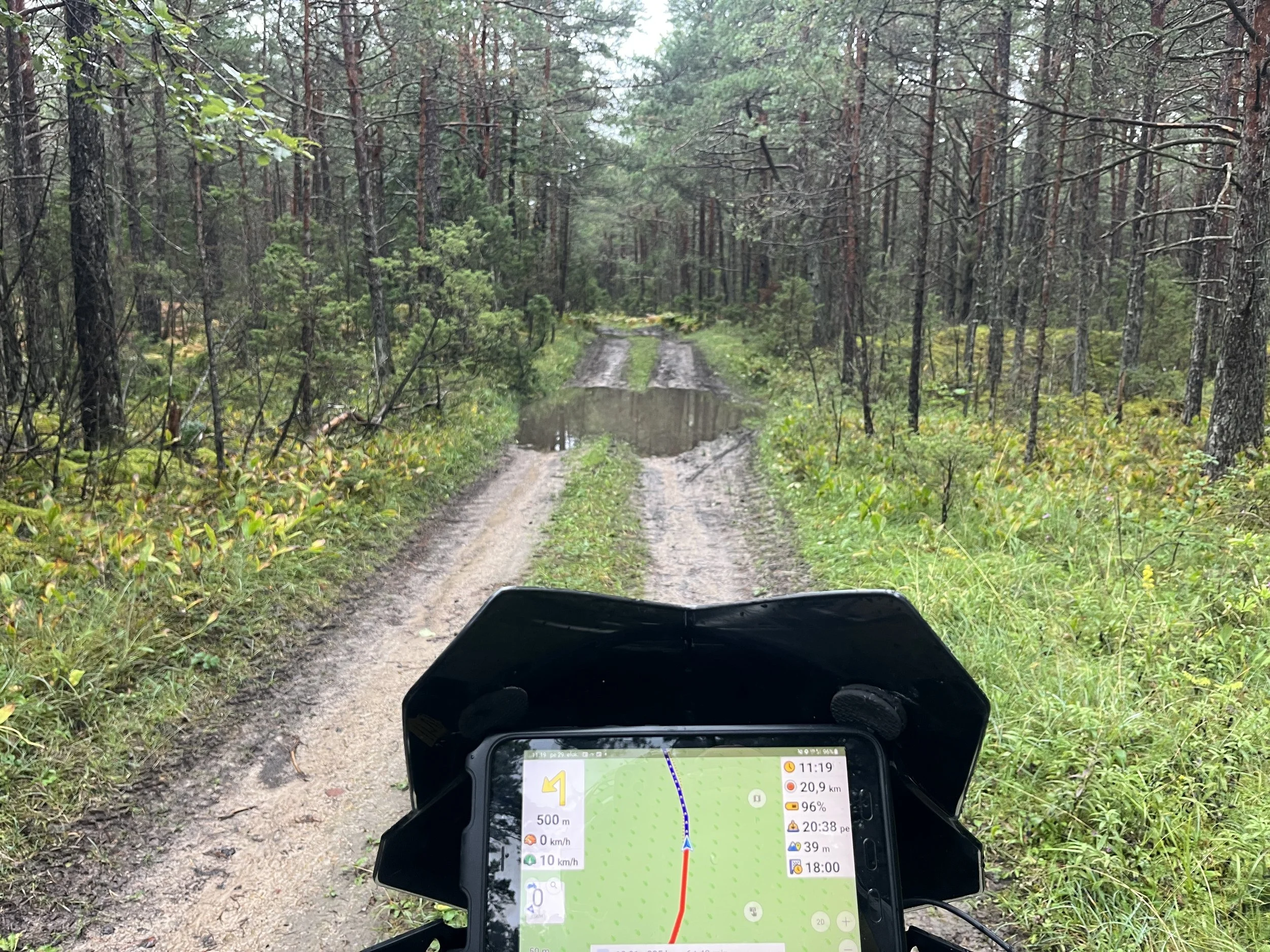 Parin ajokilometrin jälkeen päästiin taas pikkuteille ja poluille. Yön sateen jäljiltä metsätiet olivat märkiä ja liukkaita. Eilisen päivän hiekkalaatikkoleikki alkoi tuntua poikasten puuhastelulta verrattuna tämän päivän kuralätäkköleikkeihin. Reitin kaikki kuralammikot ja montut olivat ääriään myöten veden täyttämiä ja maa-aines niiden reunoilla oli muuttunut liukkaaksi kurakoksi. No nyt alkoi kiinnostamaan, juuri tätä oltiin tultu hakemaan!