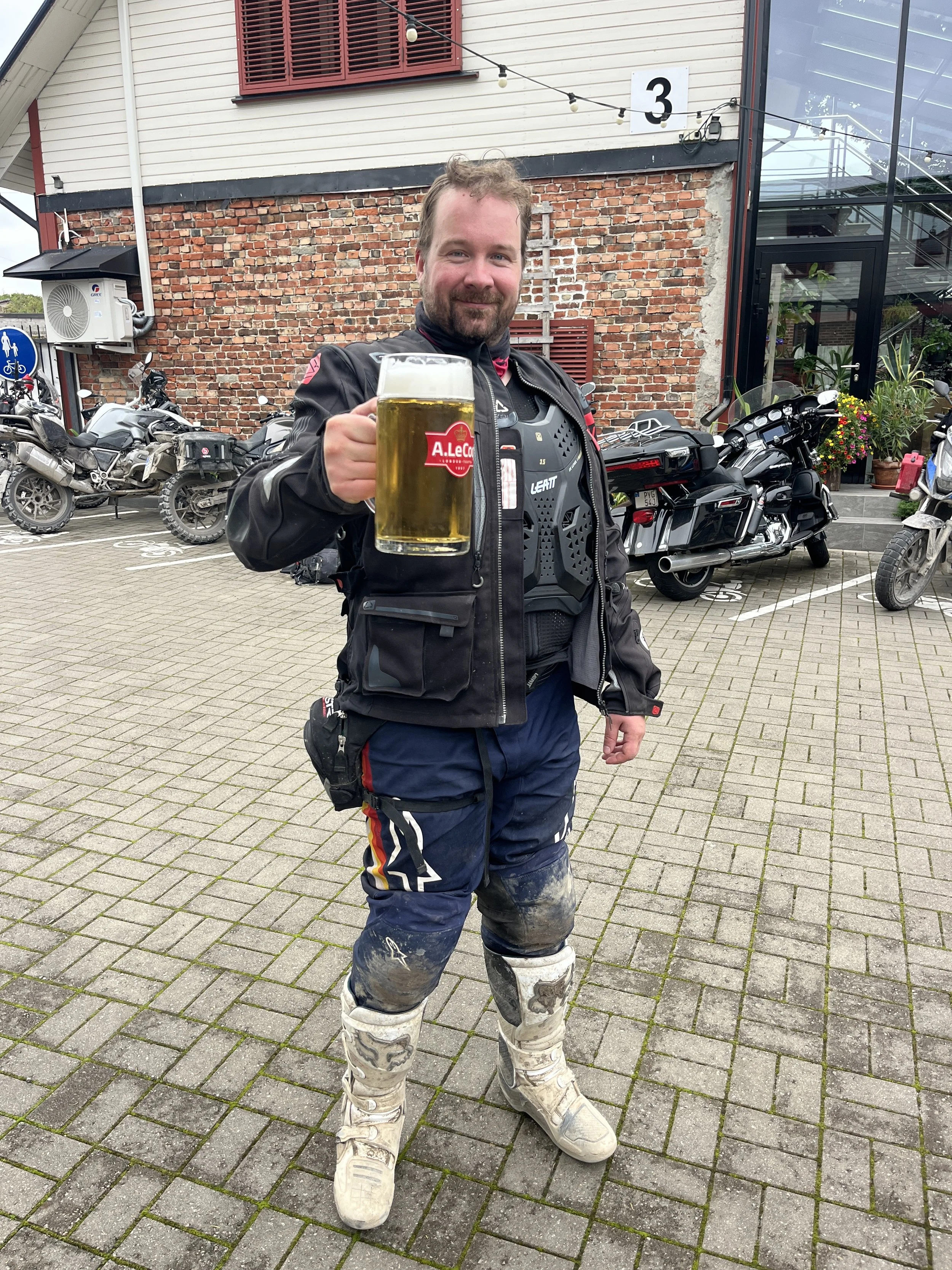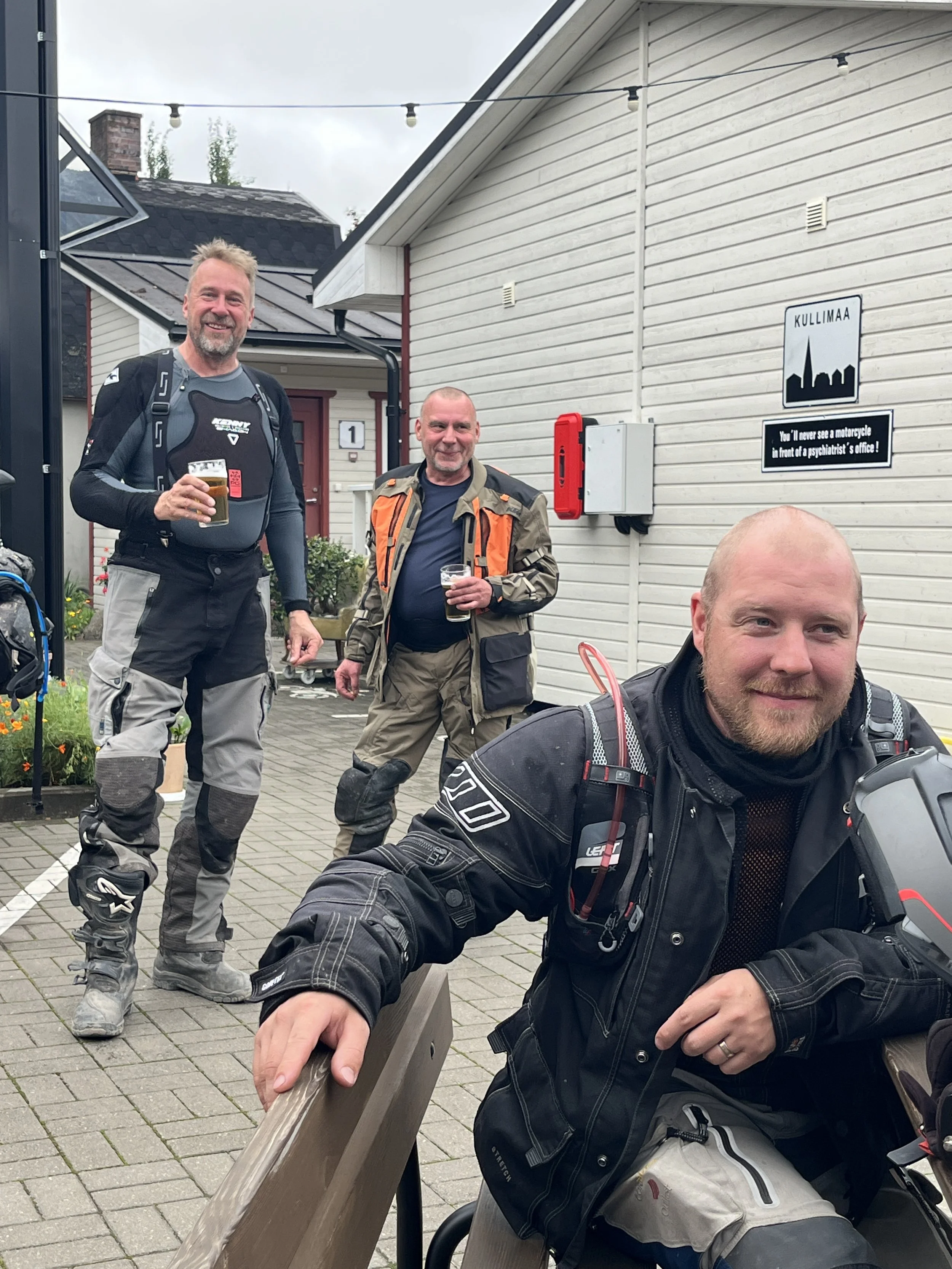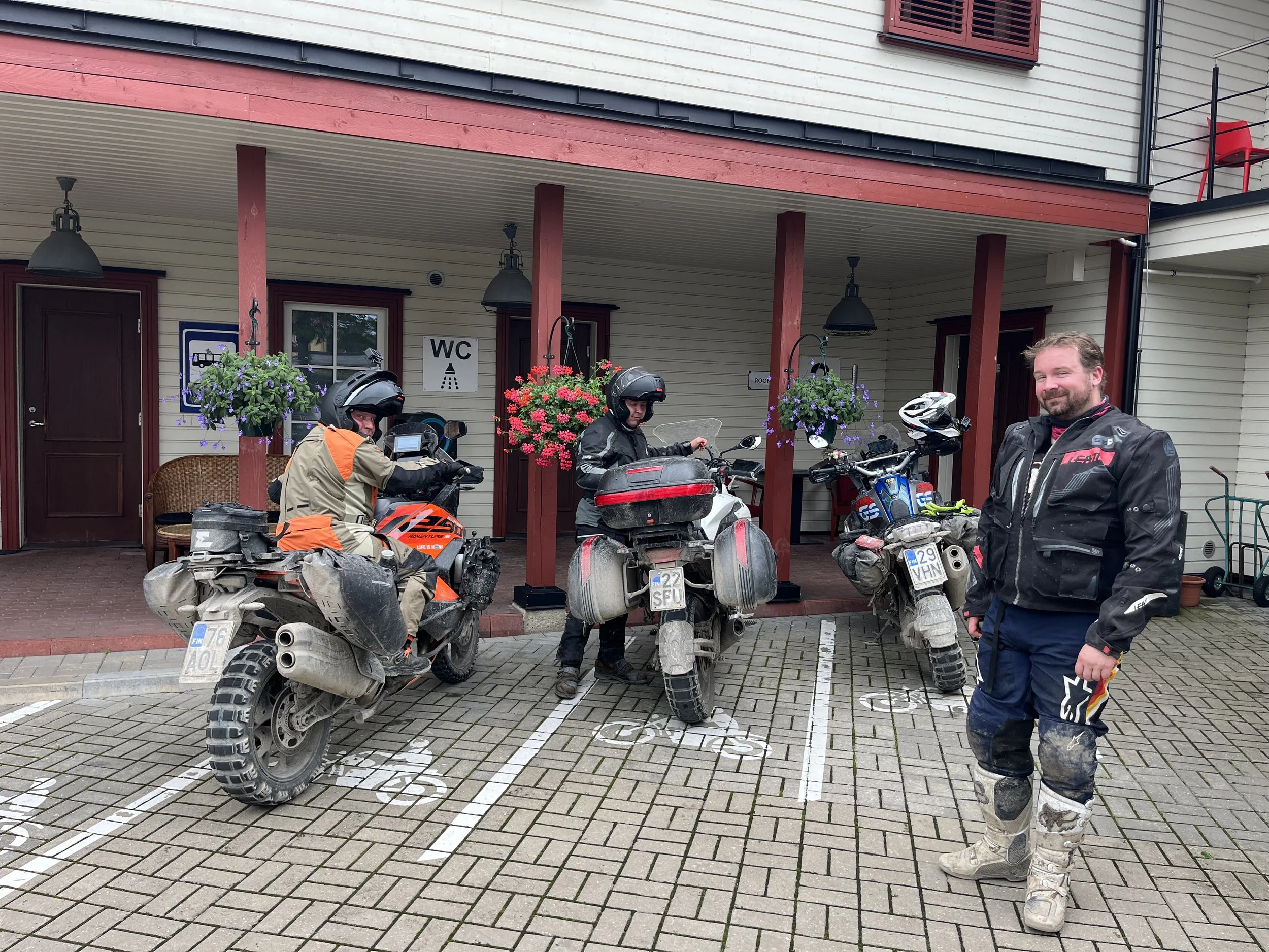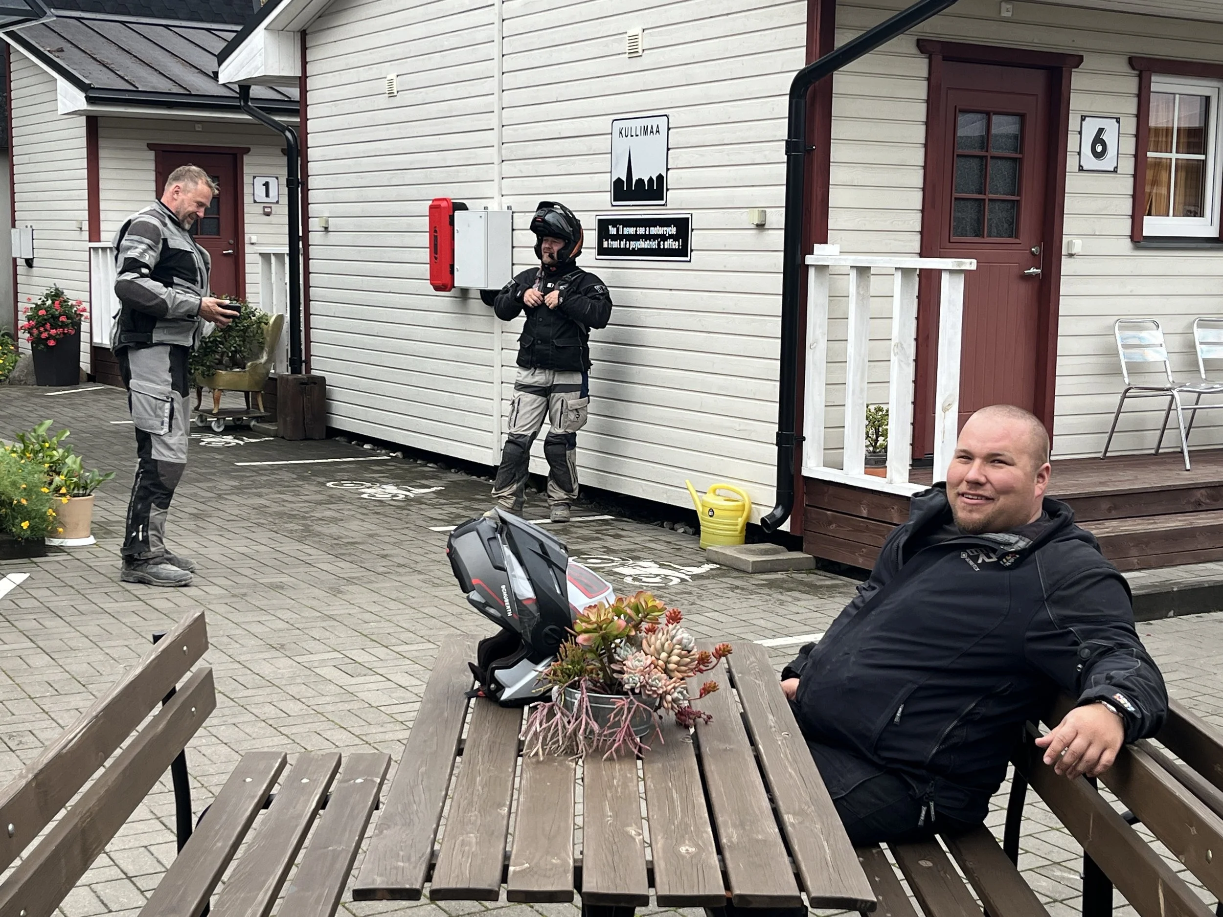 Lopputankkaukset suoritettiin ja ajettiin viimeiset pari sataa metriä Aleksandrin suuntaan, jonka portista sujahdettiin sisään. Aleksandri edustaa motoristihenkistä majoittautumista parhaimmillaan, kannattaa yöpyä kokeeksi jos niillä kulmilla liikkuu. Pyörä parkkeerattiin omaan ruutuunsa ja pian pubin puolelta noudettiin kylmät kypäräjuomat, jotka kaadettiin kurkusta alas; -saunan lämpiämistä odottaessa.