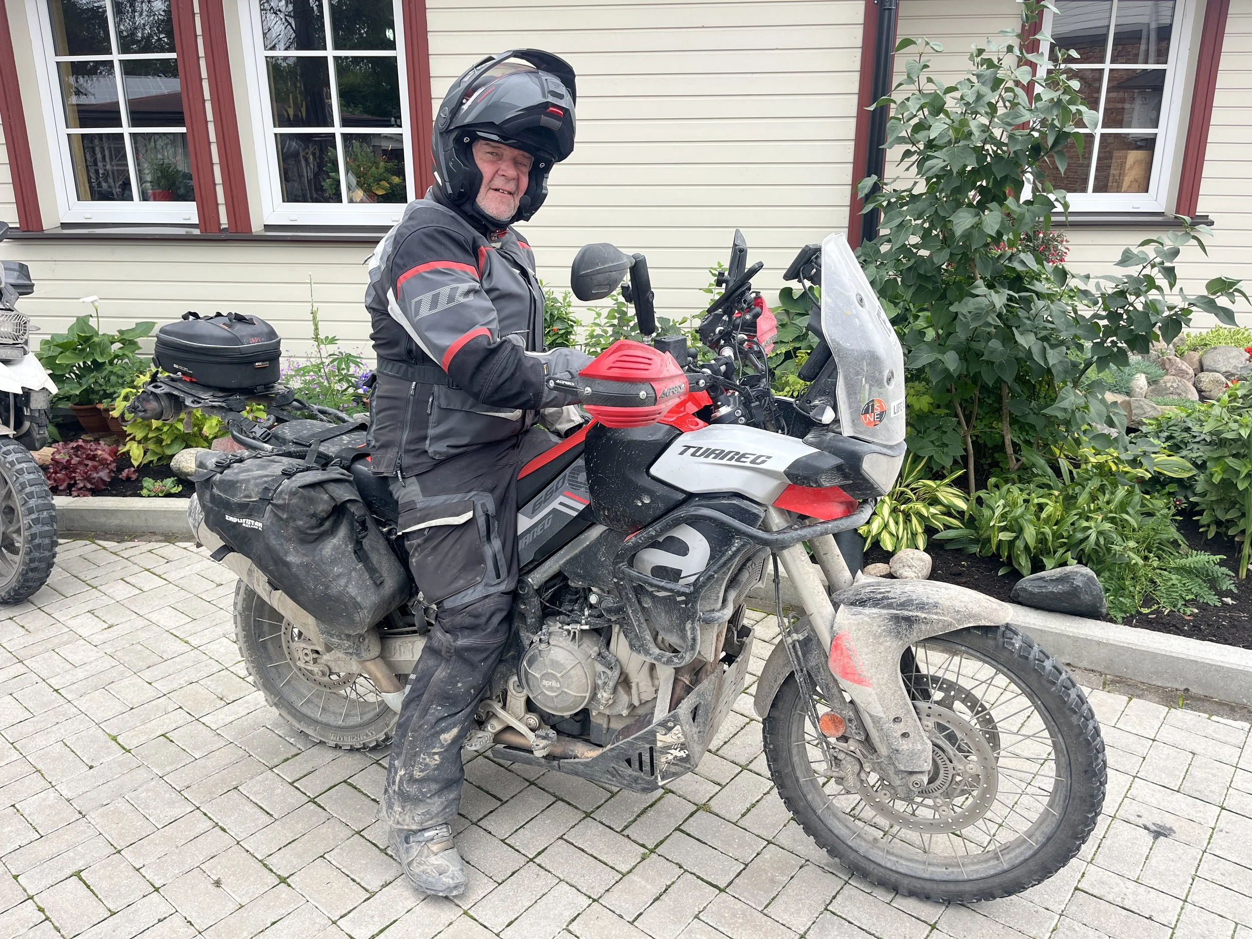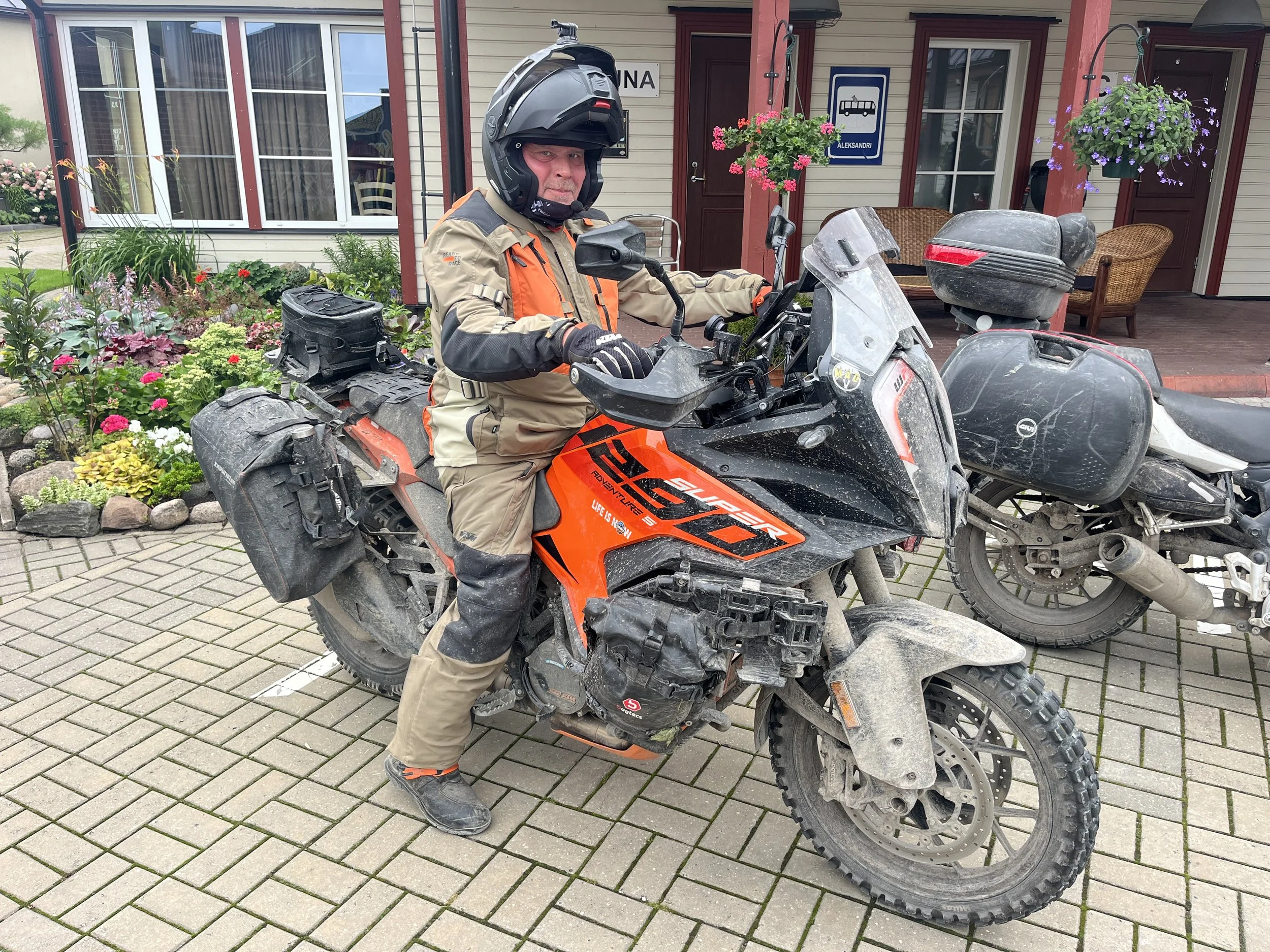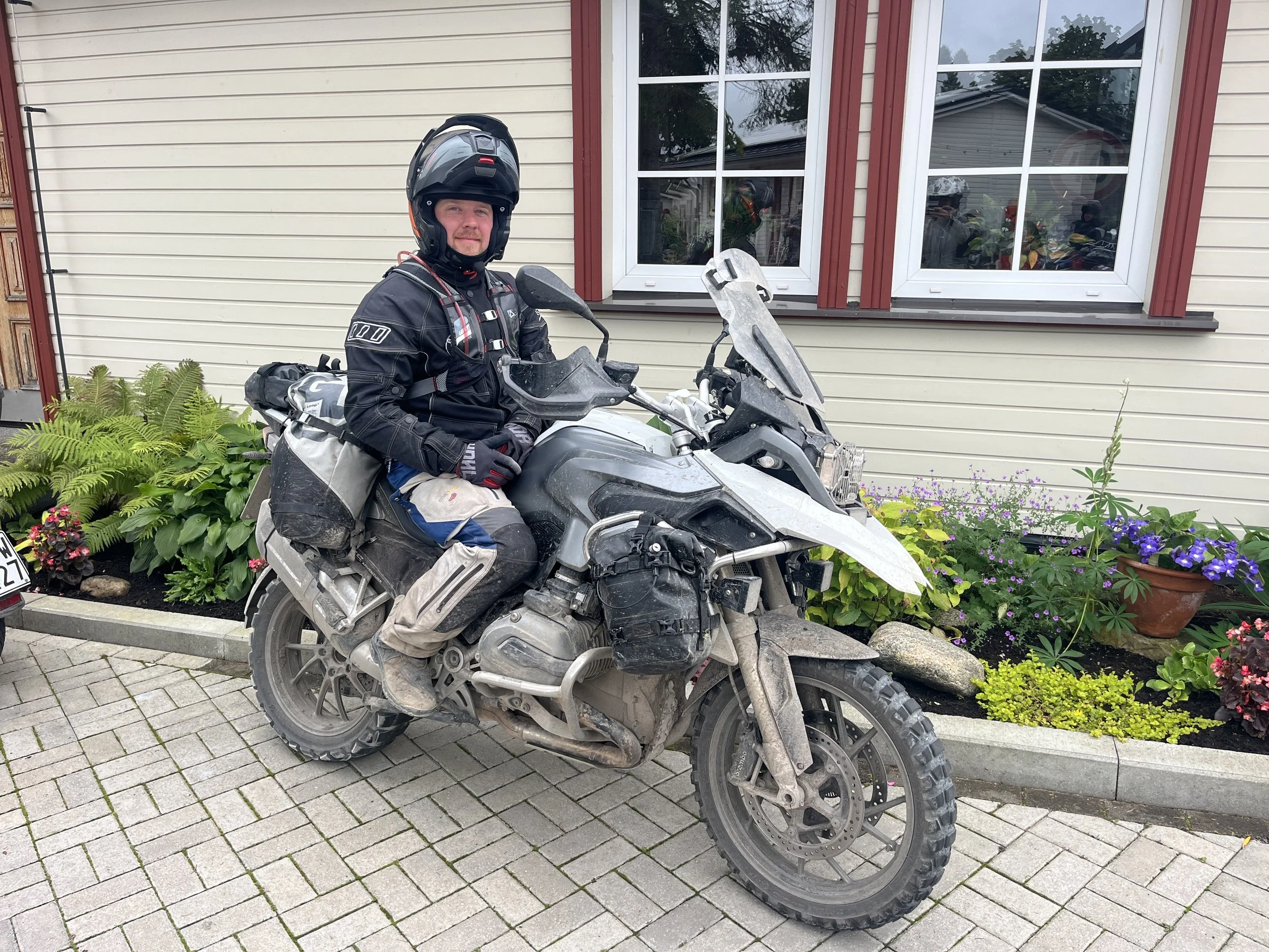 Markus, matkan kuutiotilavuuskuningas isolla Kotari 1290 Super Adventurellaan. Mies vei pyörää eikä päin vastoin.