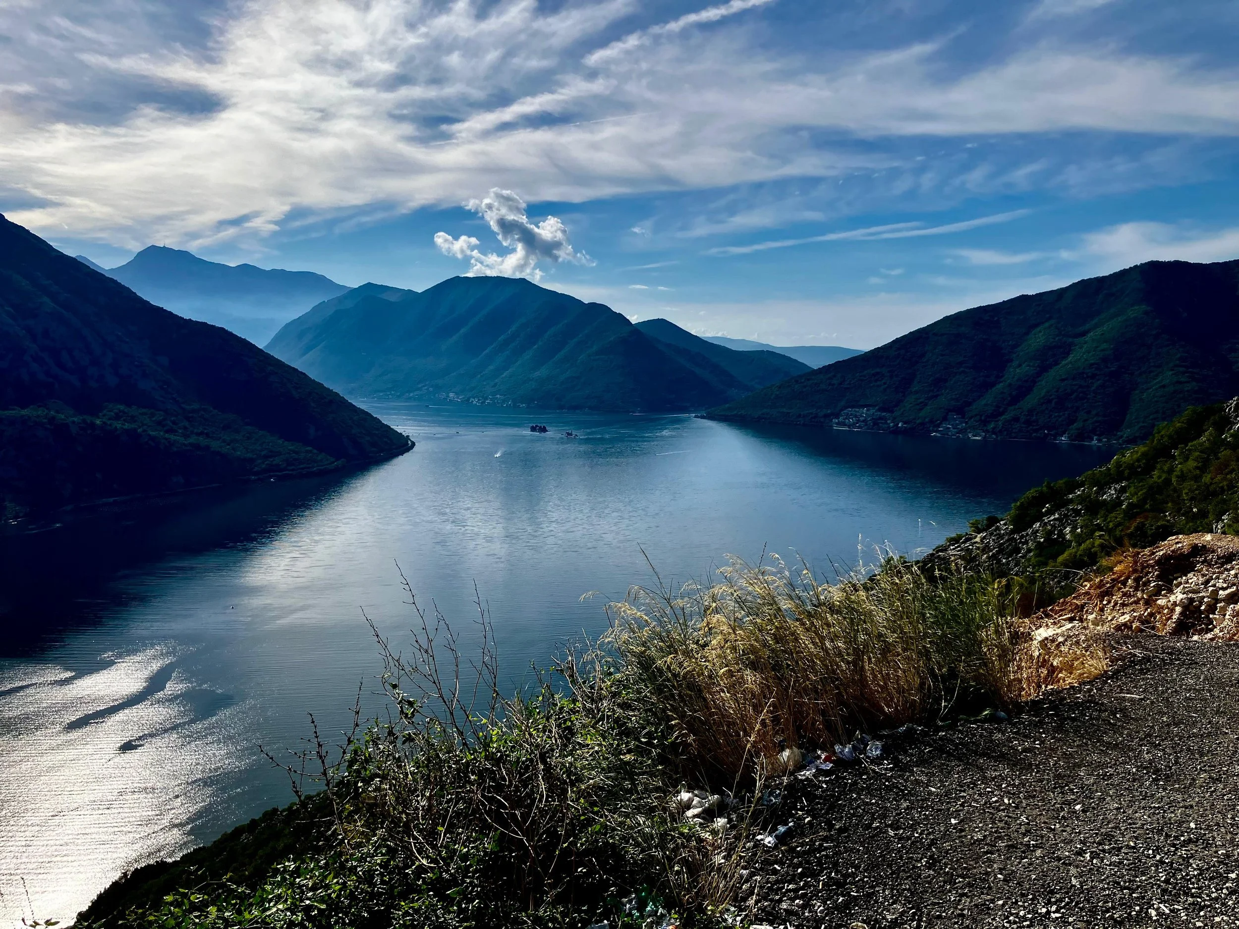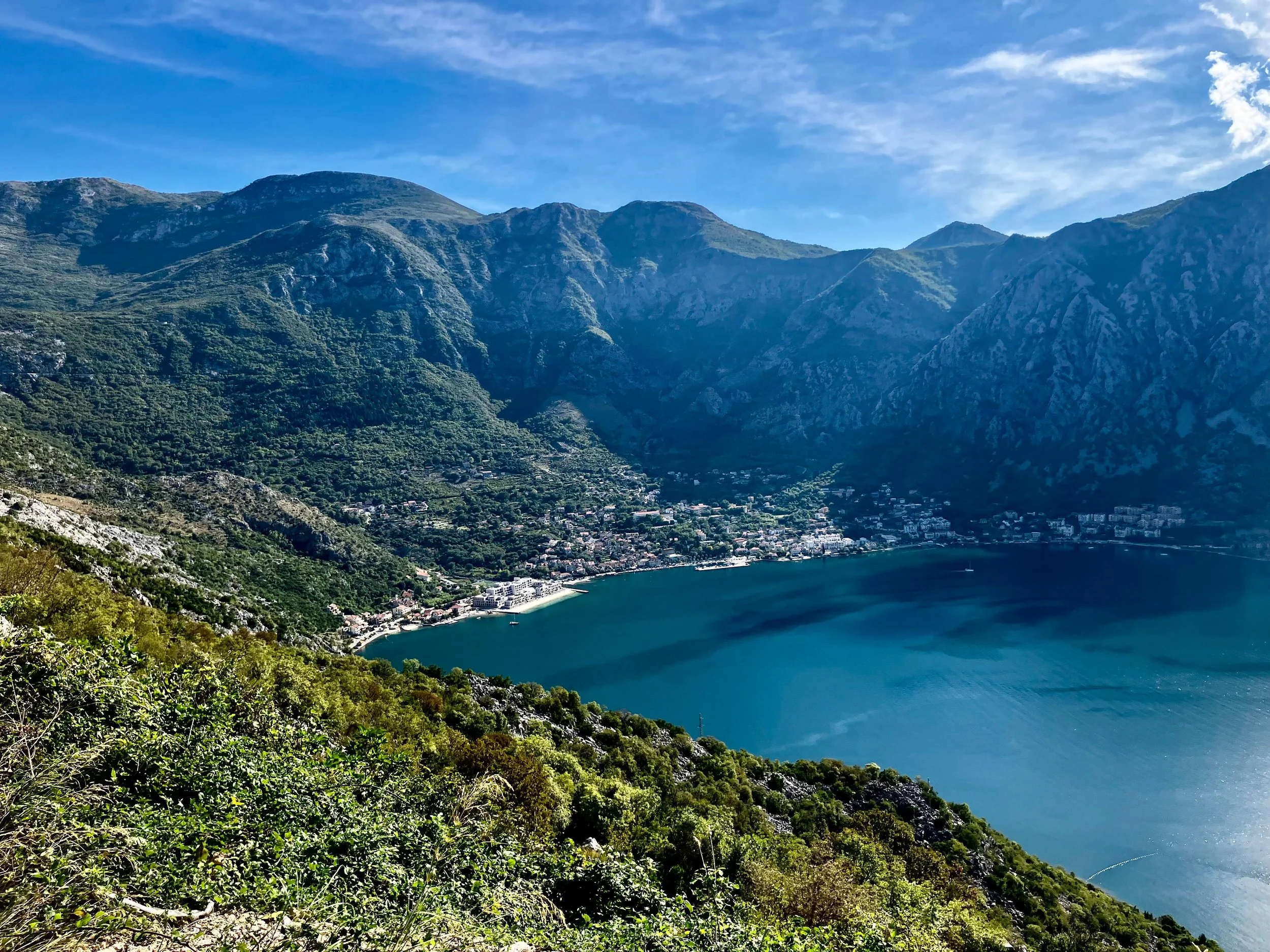 Aamulla Kotorinlahdella liikenne oli rauhallista ja ilma vähitellen lämpenemässä. Lahdelta noustiin ylös vuorille – viimeiset maisemavalokuvat tallennettiin muistikortille ennen kuin käännettiin selkä Adrianmerelle. Tie jatkui vuoriston halki: serpentiiniä, vehreitä rinteitä, metsäpalon jälkiä ja yksi iso tekojärvi, jonka pinta oli selvästi tavallista matalammalla.