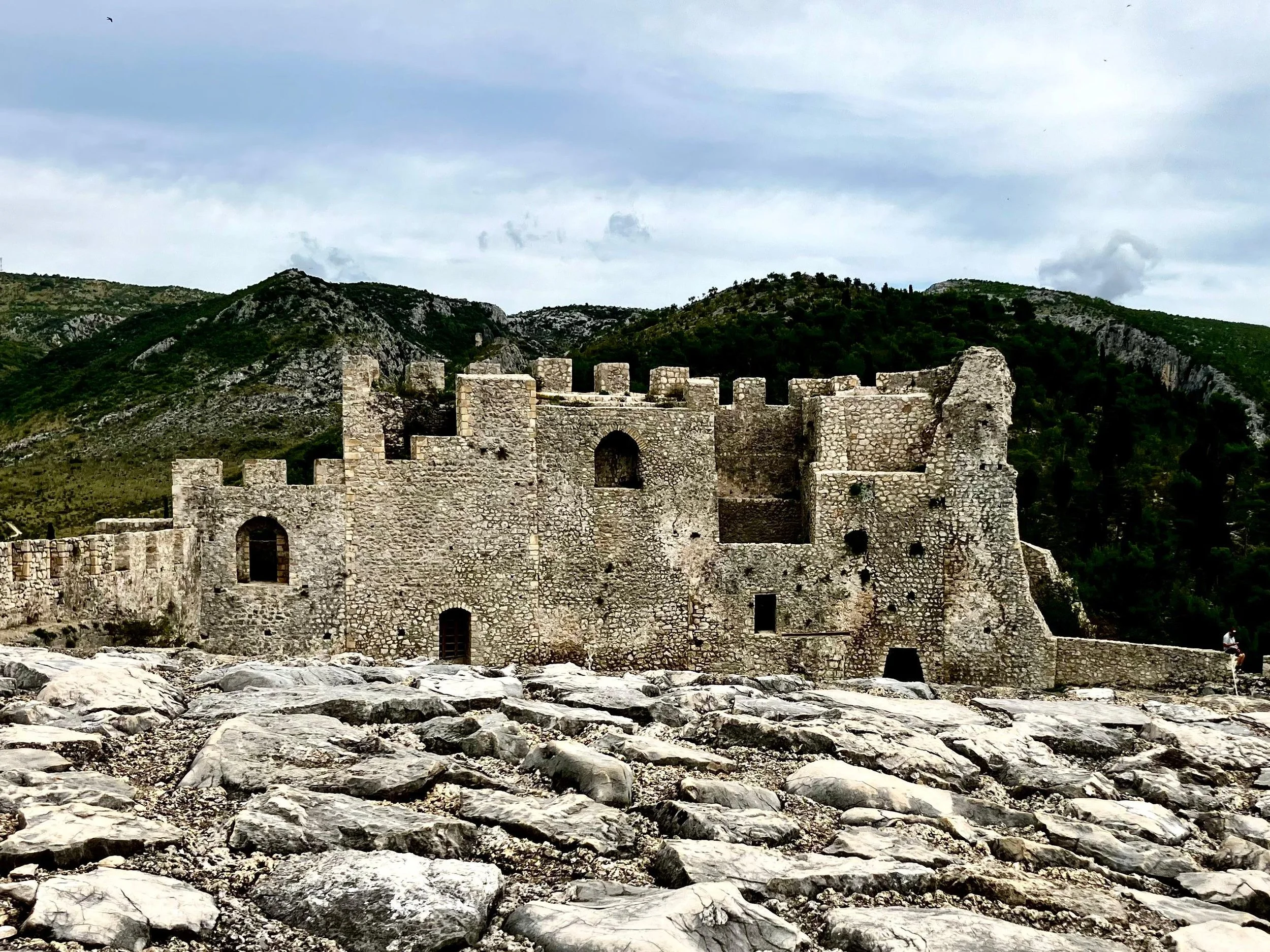 Seuraava pysähdys oli Blagaj’n linna (Stjepan grad). Tämä keskiaikainen linnoitus kohoaa korkealla kallion päällä ja on ollut tärkeä tukikohta alueen hallitsijoille aina 1400-luvulle asti. Linnan muureilta avautuu maisema alas Blagaj’n kylään ja Buna-joen laaksoon. Paikalle pääsee jyrkkää polkua pitkin, ja meidän ryhmästä 62,5 % jaksoi kavuta raunioille asti. Loput tyytyivät katselemaan näkymiä alhaalta käsin.