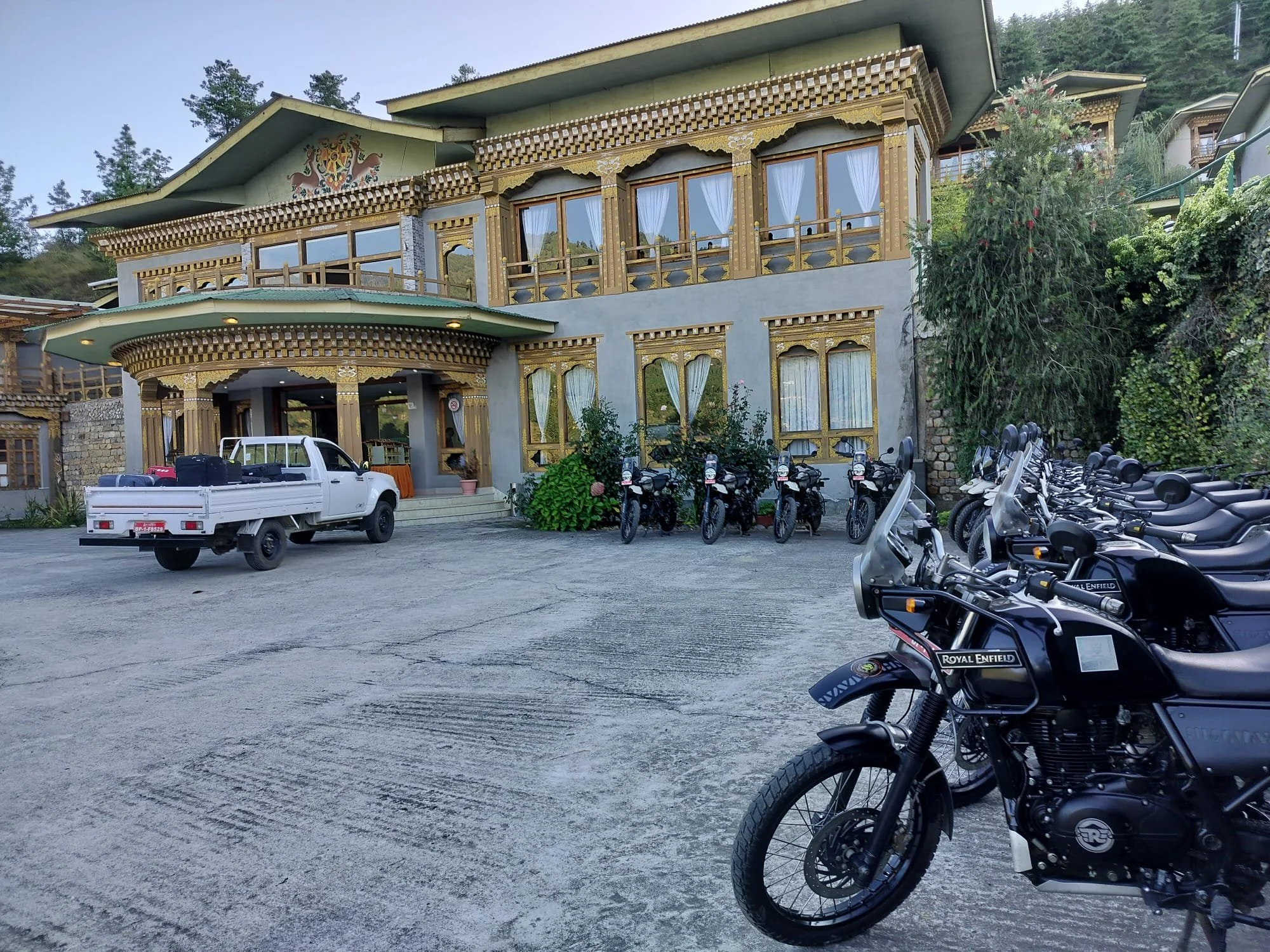 Matkalaukut huoneisiin, ajokamat päälle ja pienelle testilenkille. Ennen sitä Khandu piti lyhyen kertauksen Bhutanissa ajamisen erityispiirteistä. Oli ilo nähdä, että porukka on pro! Ajoetäisyydet kohdallaan, vilkut toimi kuten olis sovittu ja koiratkin väistettiin huolella. Illalla vielä kerrattiin, että elukat kierretään hännän puolelta ja riittävän kaukaa.