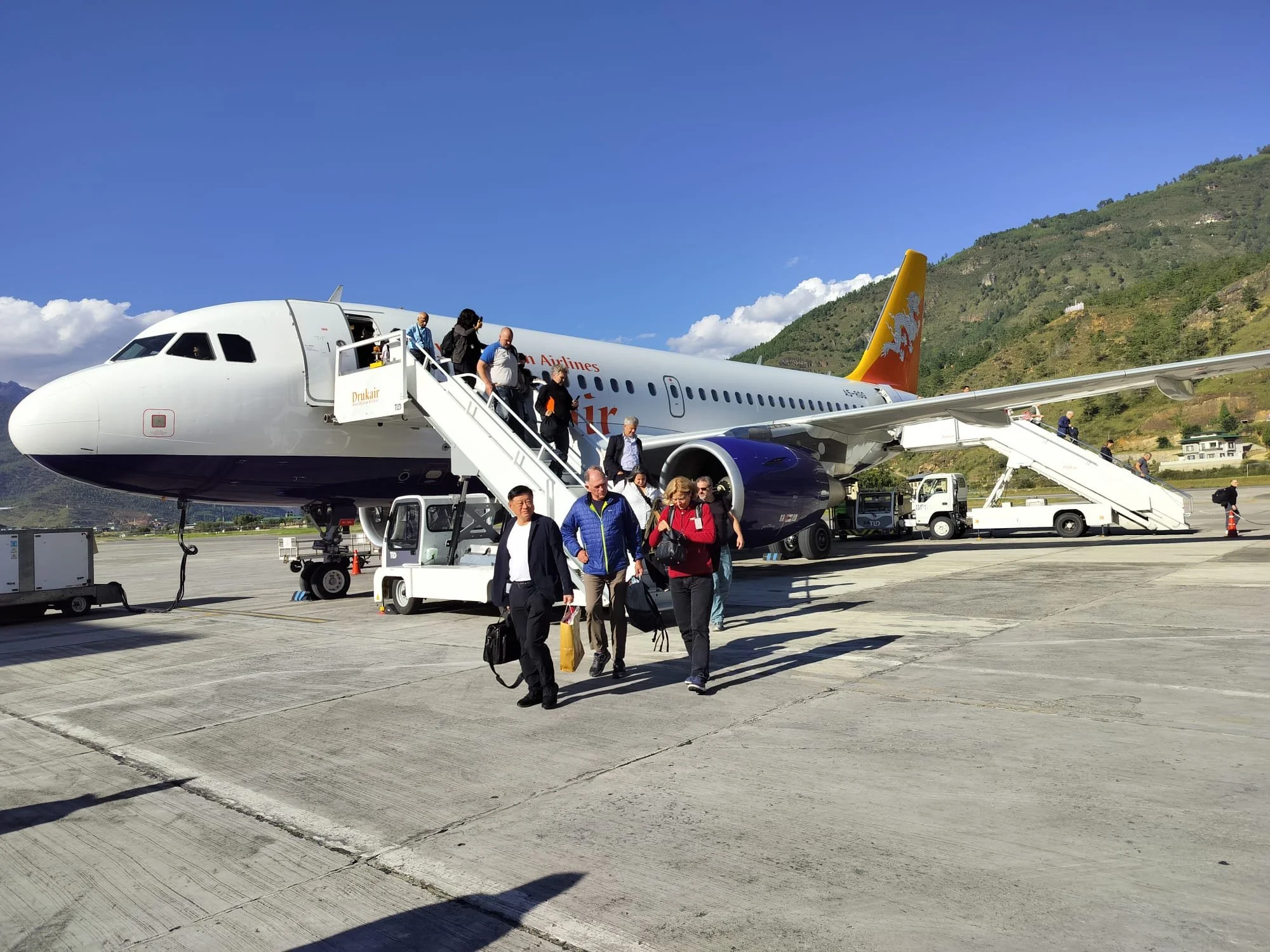 Bhutaniin lentää vain pari lentoyhtiötä, valtion omistama Druckair ja yksityinen Bhutan air. Jos tuuri käy, pääsee koneen vasemmalle puolelle ihailemaan Himalajan lumihuippuisia vuoria. Monet pilotit eivät oikein välitä lentää täällä kovin matalalla, kun pilvien seassa on kiviä kuten Everest, Loptse, Nuptse, Katsenzunga, Makalu jne.