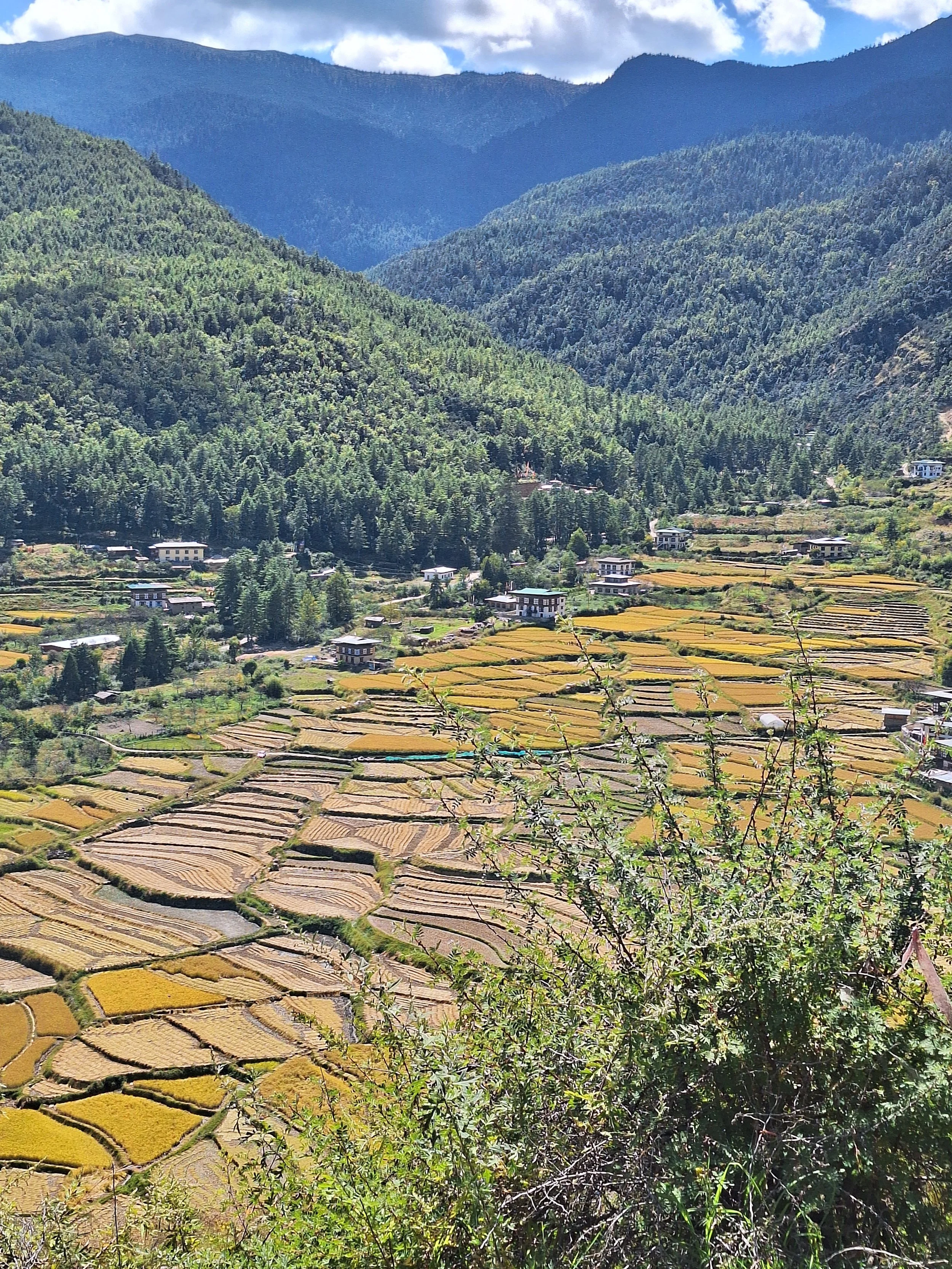 Porukat pysähtelivät ihailemaan maisemia ja ihmettelemään mitäköhän tuosta kaikesta riisi.-oljesta värkätään, kun sitä tulee aika tuhottomasti nyt sadonkorjuun aikaan. Bumtangtissa näöhtiin myös riisin puintia pellon reunassa polttomottoripuimurilla.