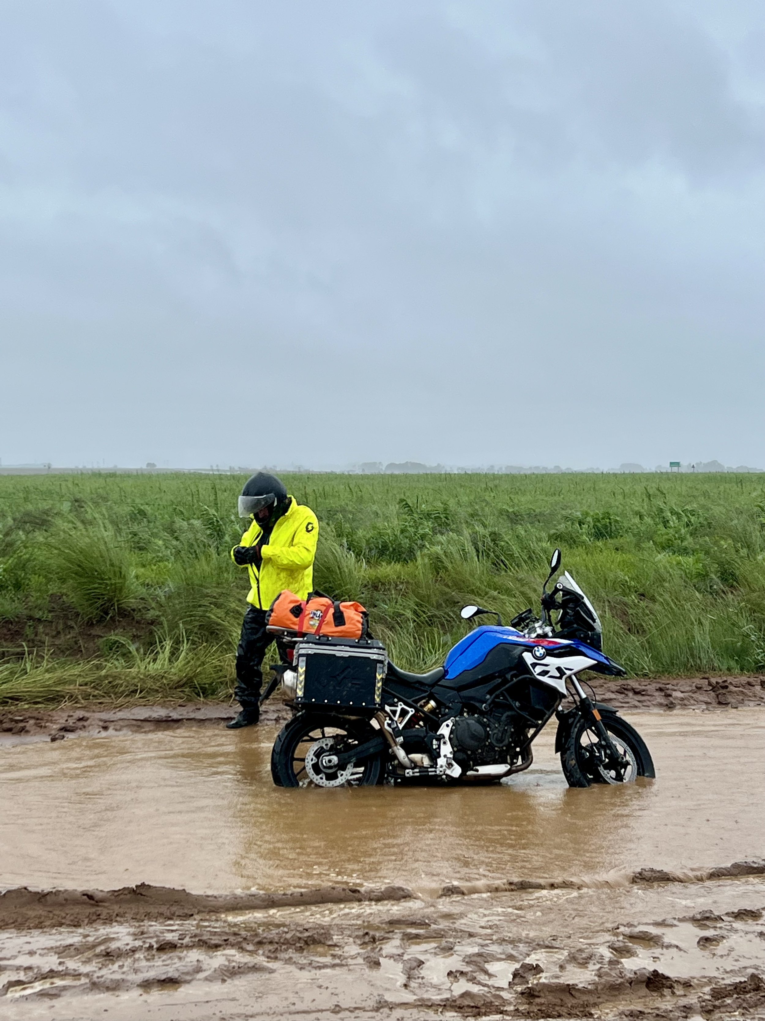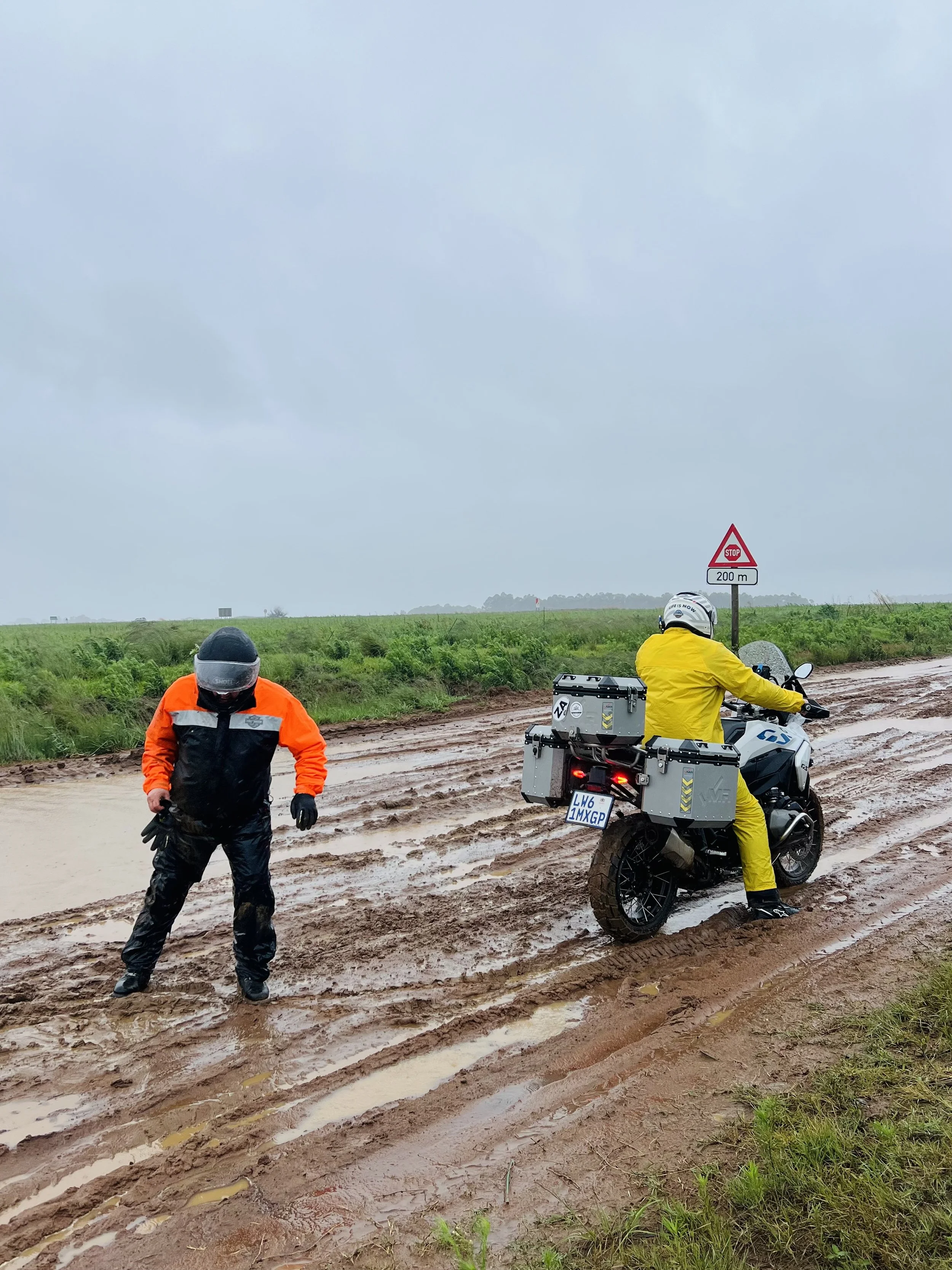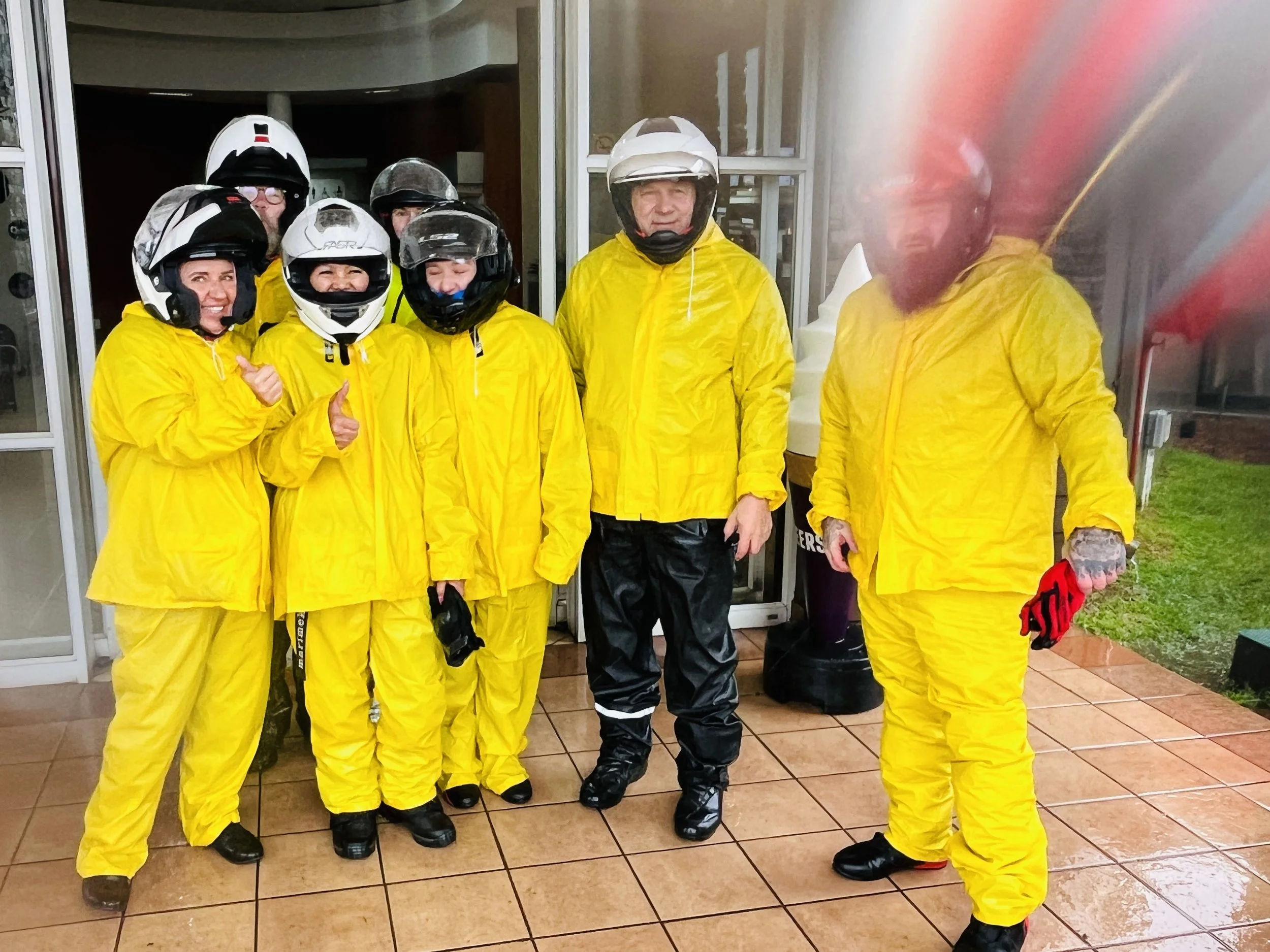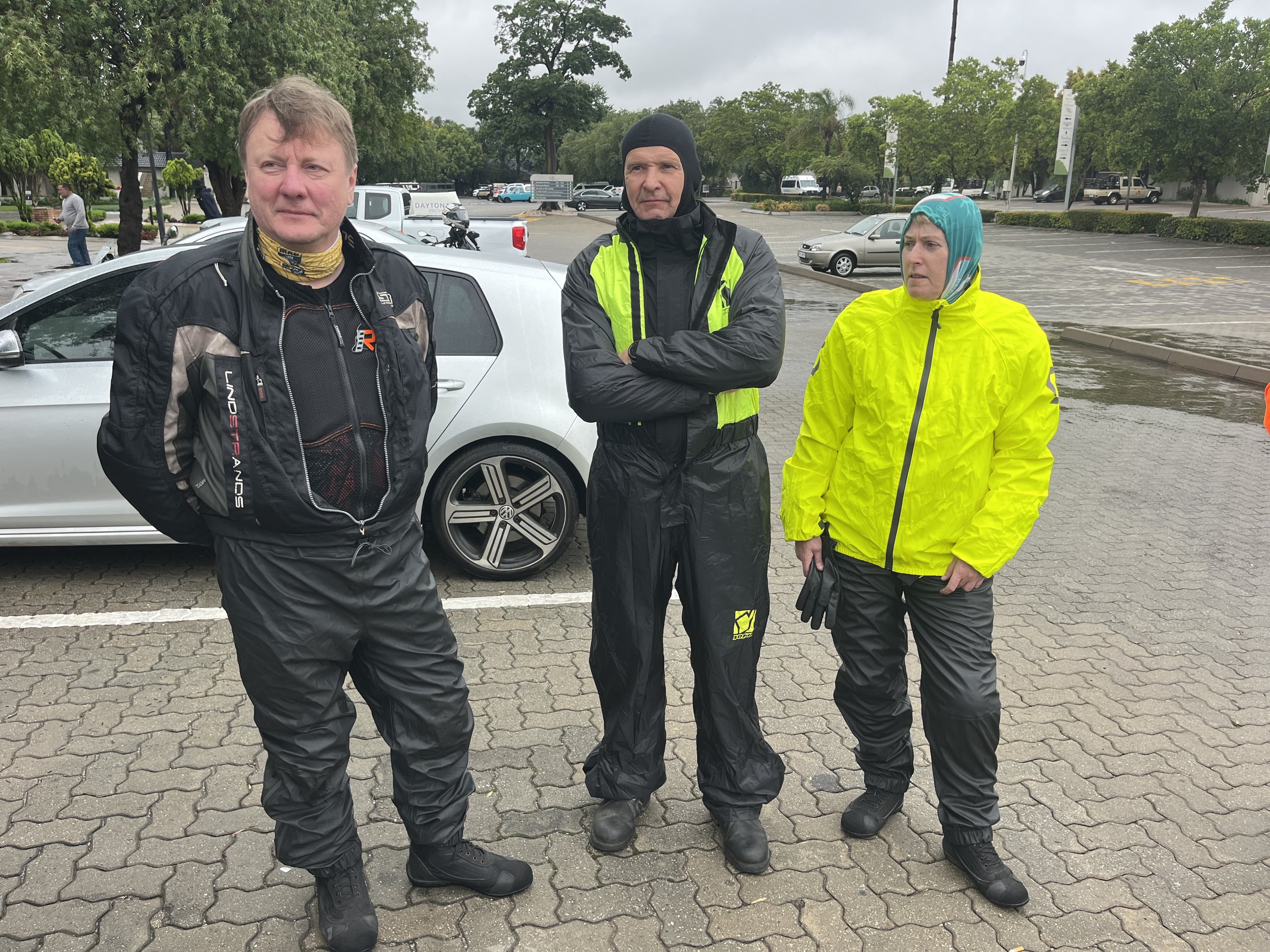 Läheinen rautakauppa sai heti aamulla avattuaan ovensa vastaanottaa ensimmäiset asiakkaansa, jotka suunnistivat suoraan työvaateosaston sadeasuhyllylle. Hetken aikaa sadeasukauppa riehui samaan malliin kuin hirmumyrsy ulkona, ja kohta ryhmämme esiintyikin iloisesti pukeutuneena kirkkaan keltaisiin sade-asuihin. Olimme kun lauma ankan poikasia, kun lopulta suuntasimme rankkasateessa Boksburgista kohti päivän etappia, White Riveriä.