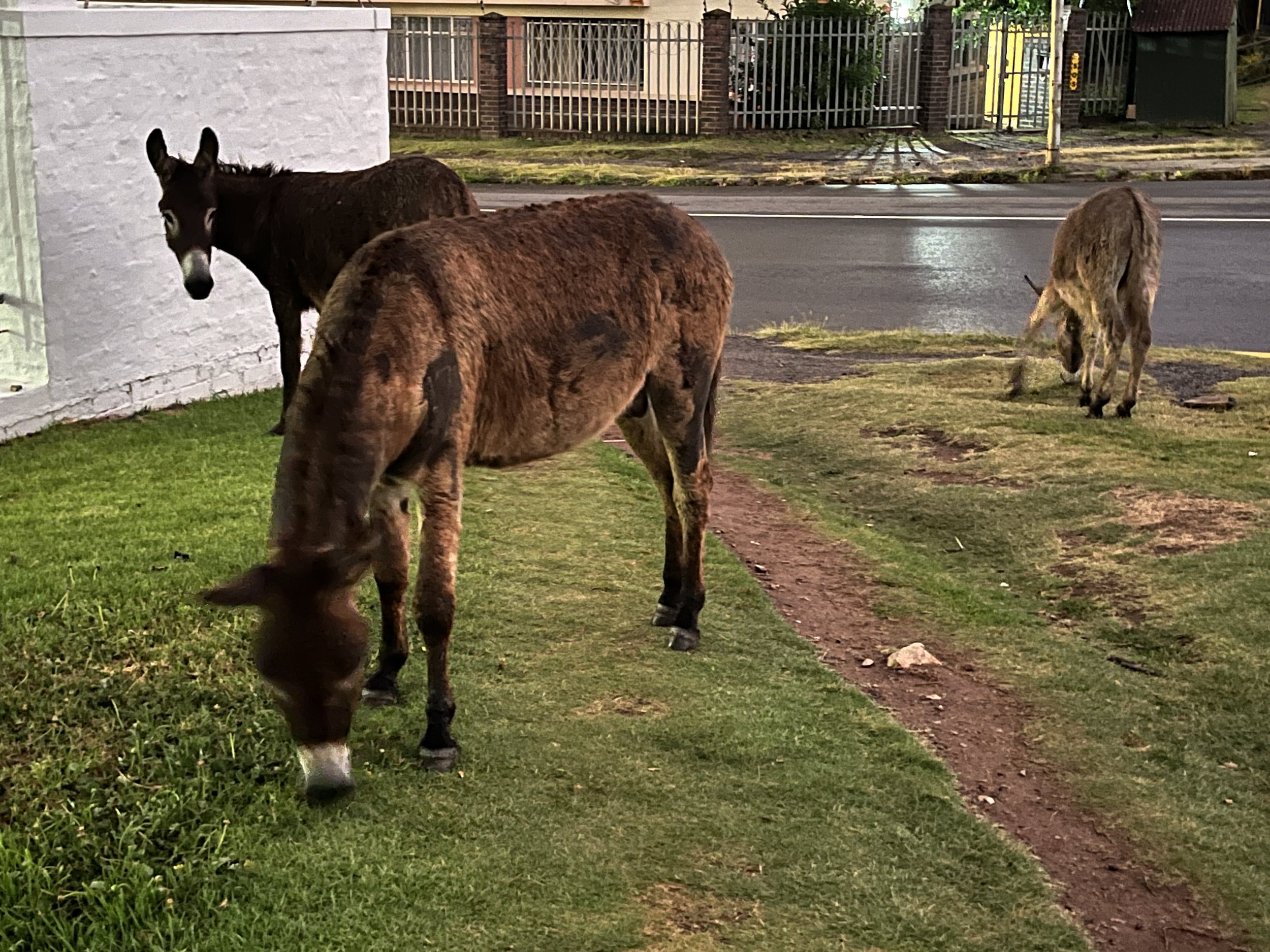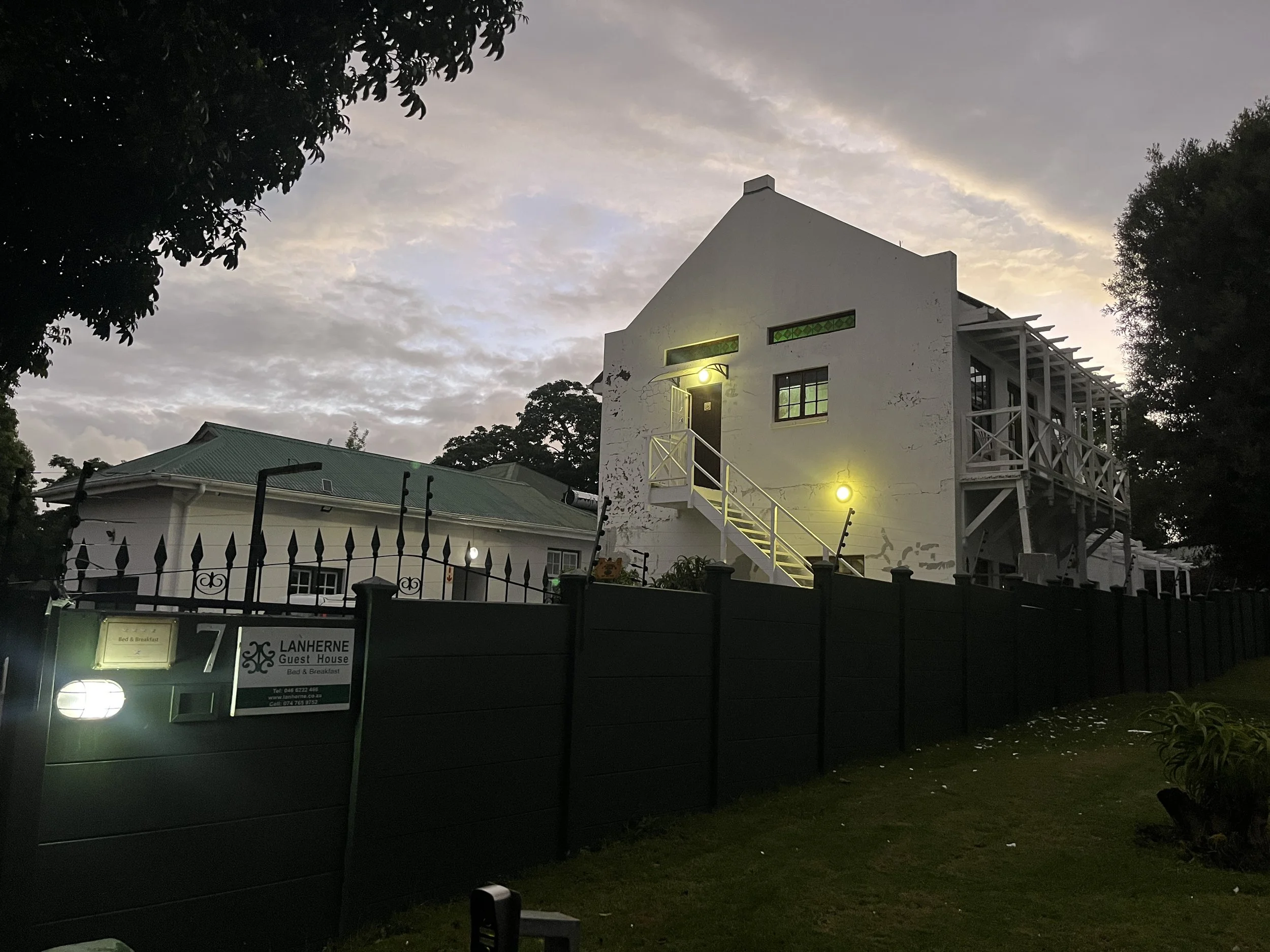 Grahamstownissa majoituttiin kahdessa eri Lodgessa, sillä majoituksia ei saatu saman katon alle tilan puutteen vuoksi. Isommissa kylissä ja kaupungeissa majapaikat pitää valita pienistä yksiköistä, joilla on oma, aidattu ja usein sähköistetyin langoin ja piikkilangoin rajattu piha-alue. Ihan varmuuden vuoksi vaan, niin on sitten aamulla ajopelit tallessa joilla jatkaa matkaa.:)