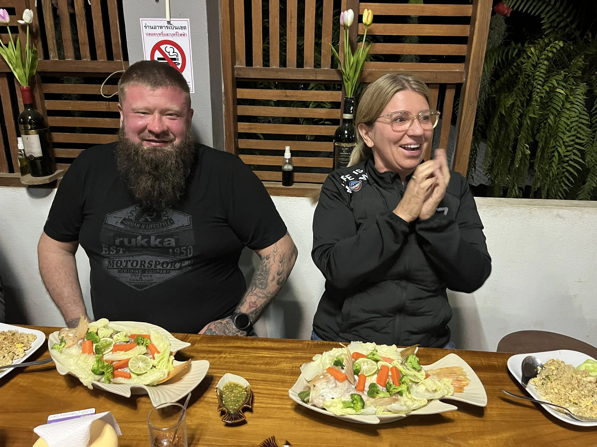 Illalliseksi oli muun muassa kalaa ja lisäksi vähän sitä sun tätä. Kuvassa Pekka ja Jaana.