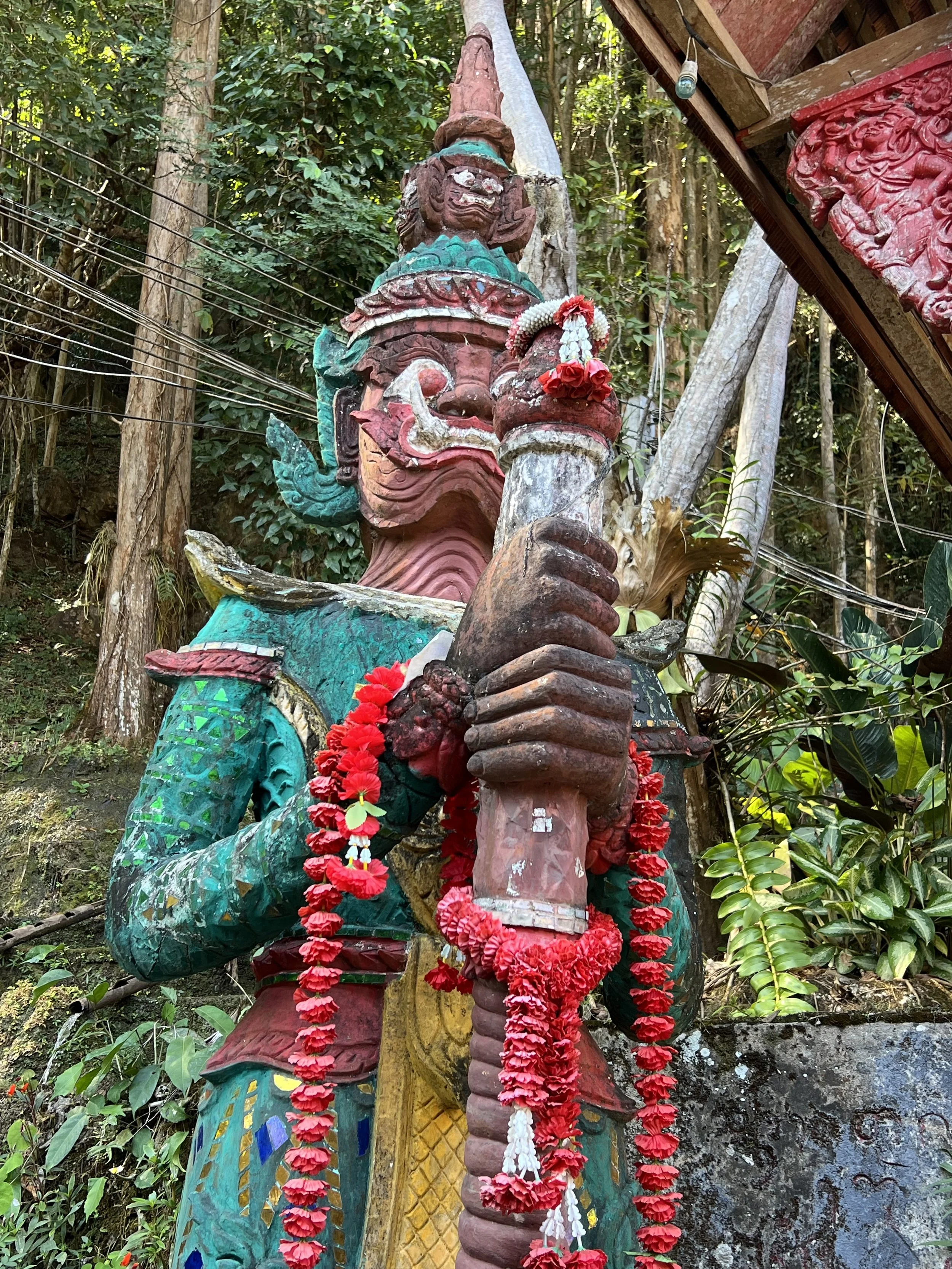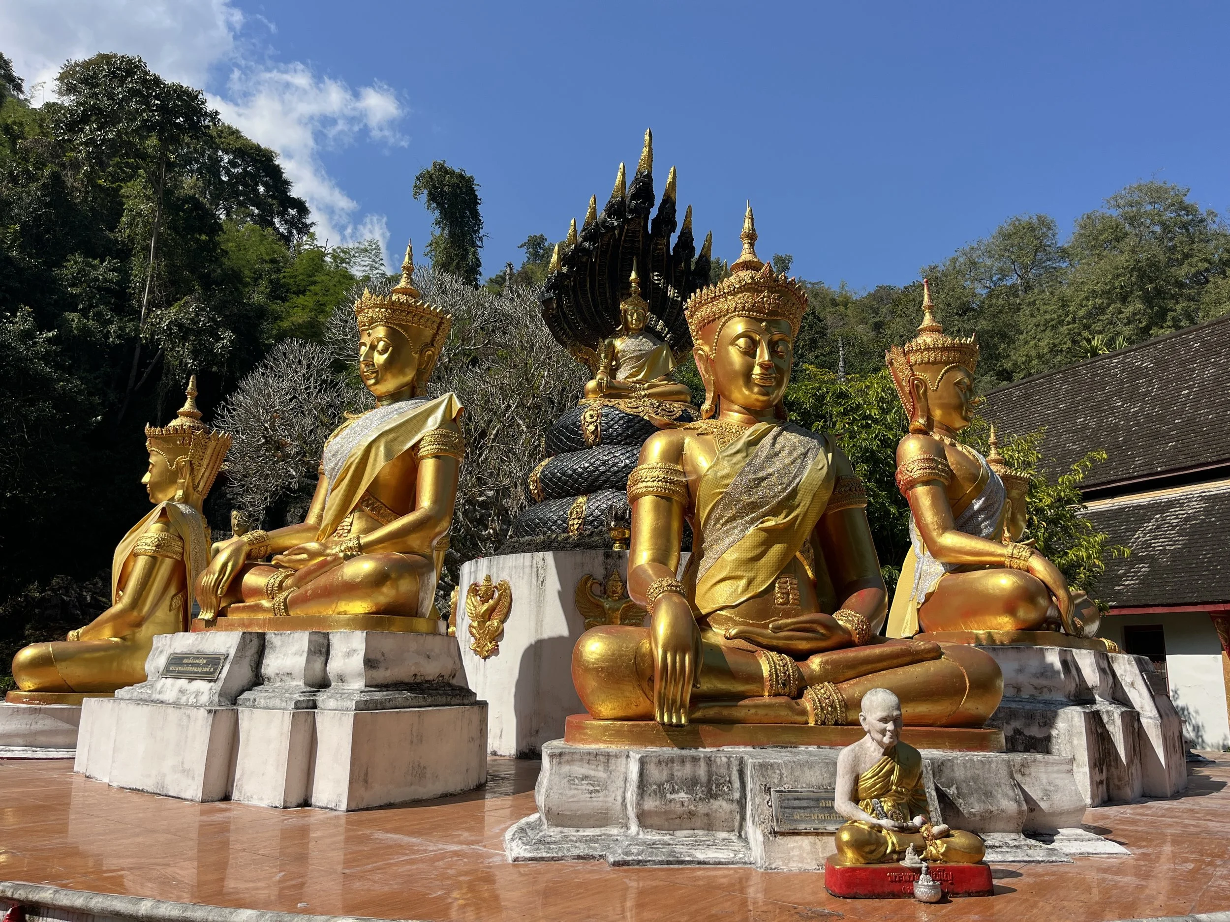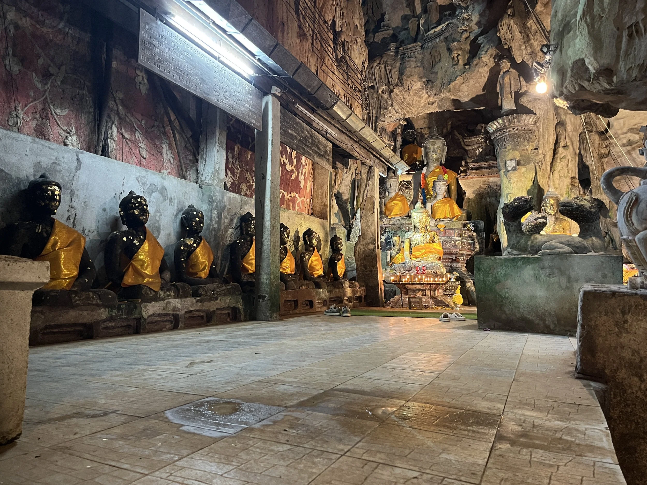 Päivän ensimmäinen nähtävyys oli ja samalla lounaspaikka, klo 12.00 aikaan tietenkin, oli What Dam Chiang Dao, luolassa sijaitseva Budhalaistemppeli.
