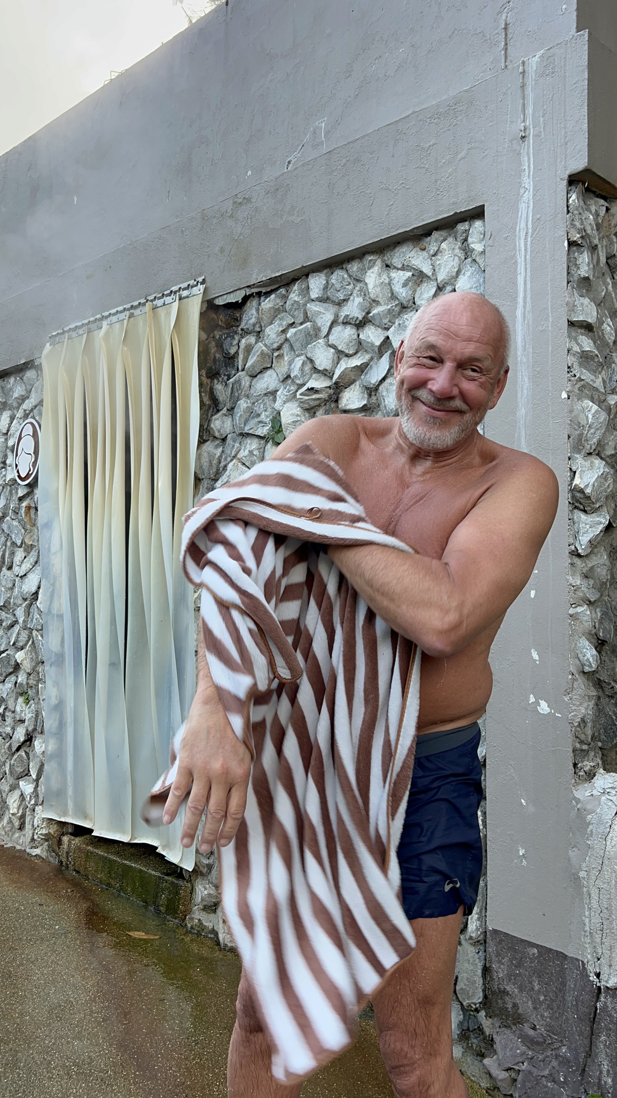 Koska Kuokka-Pekka on myös Sauna-Pekka, niin 35 km ennen majapaikkaamme poikkesimme Fangin Hot Spring & Saunaan. Täällä saunoteltiin uudella tavalla, istumalla kiukaan päällä, eli takapuoli tukevasti kivipenkissä. Maaperästä nouseva, rikintuoksuinen kuuma höyry lämmitti saunaa niin, että siellä tarkeni mukavasti. vaikka löylyä ei päästy heittämään ollenkaan.