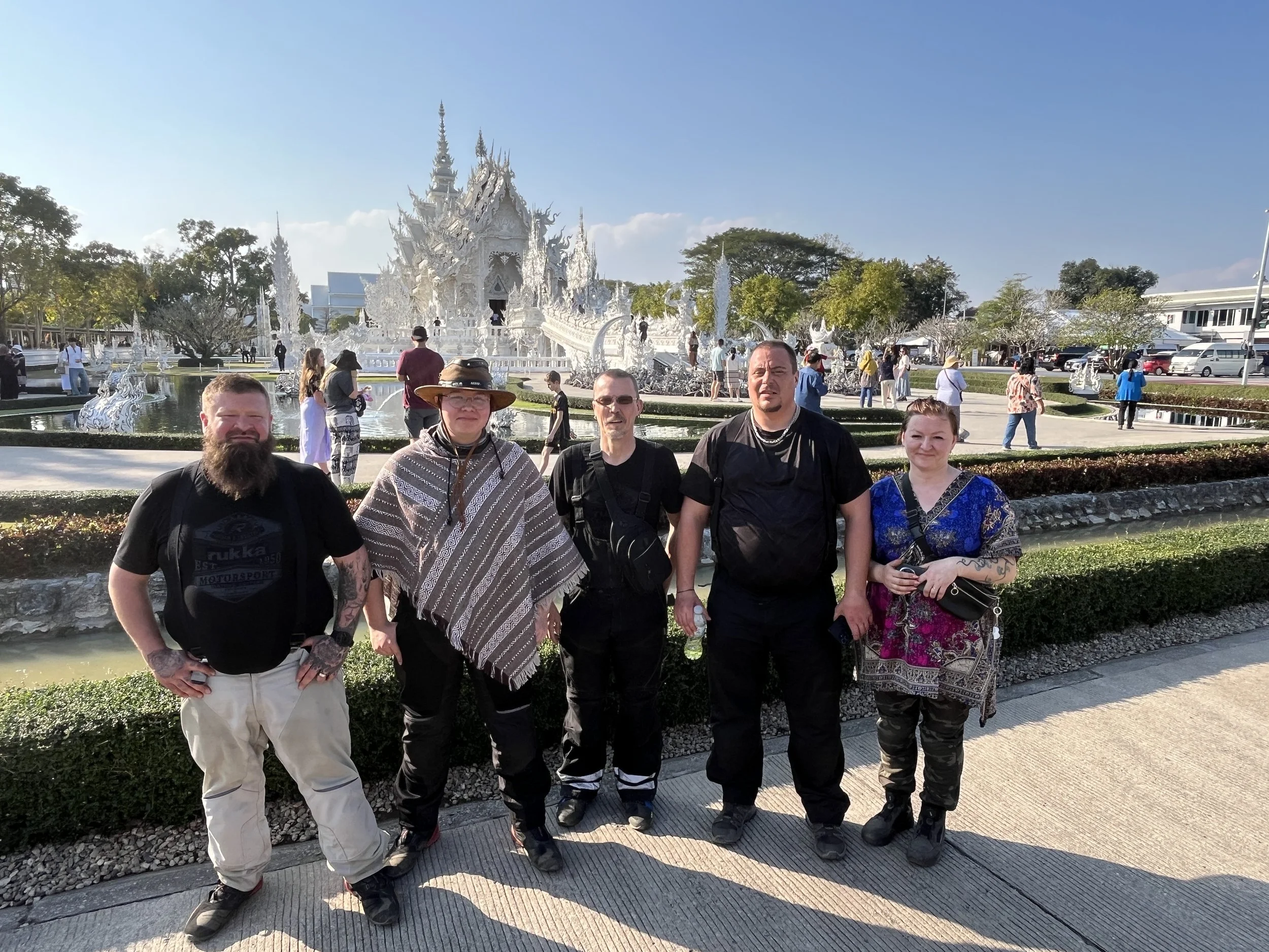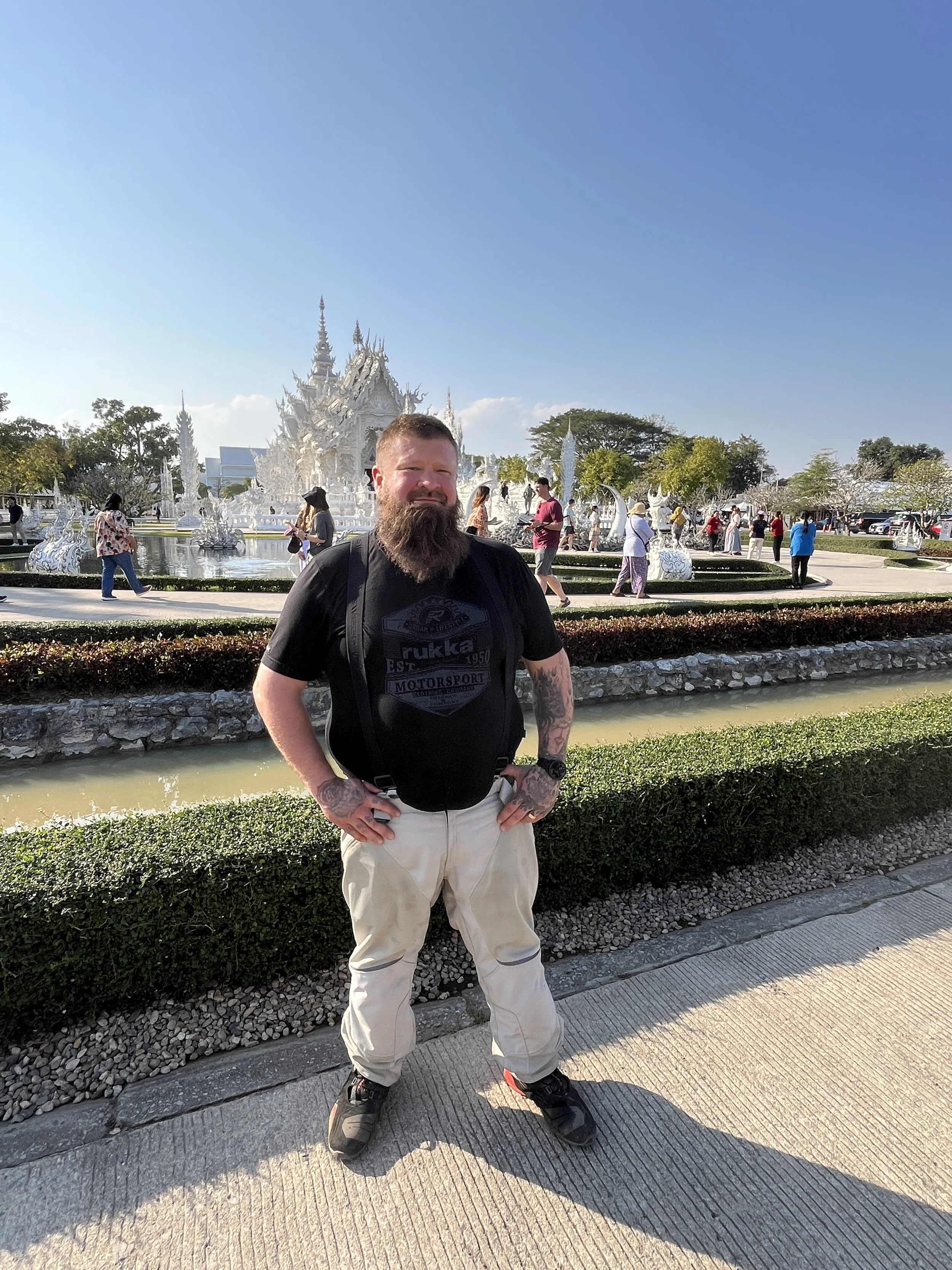 Matka sujui joutuisasti halki kumipuumetsien kohti Chiang Rain maailmanperintökohdelistalla olevaa valkoista temppeliä, Wat Rong Khunia. Ajoitus oli loistava, olimme perillä klo 16.00 tietämillä ja meille jäi tunti aikaa tutustua temppeliin. Tunnissa sen ehtii nähdä, mutta usempikin tunti voi vierähtää helpostikin jos oikein näkemäänsä paneutuu.