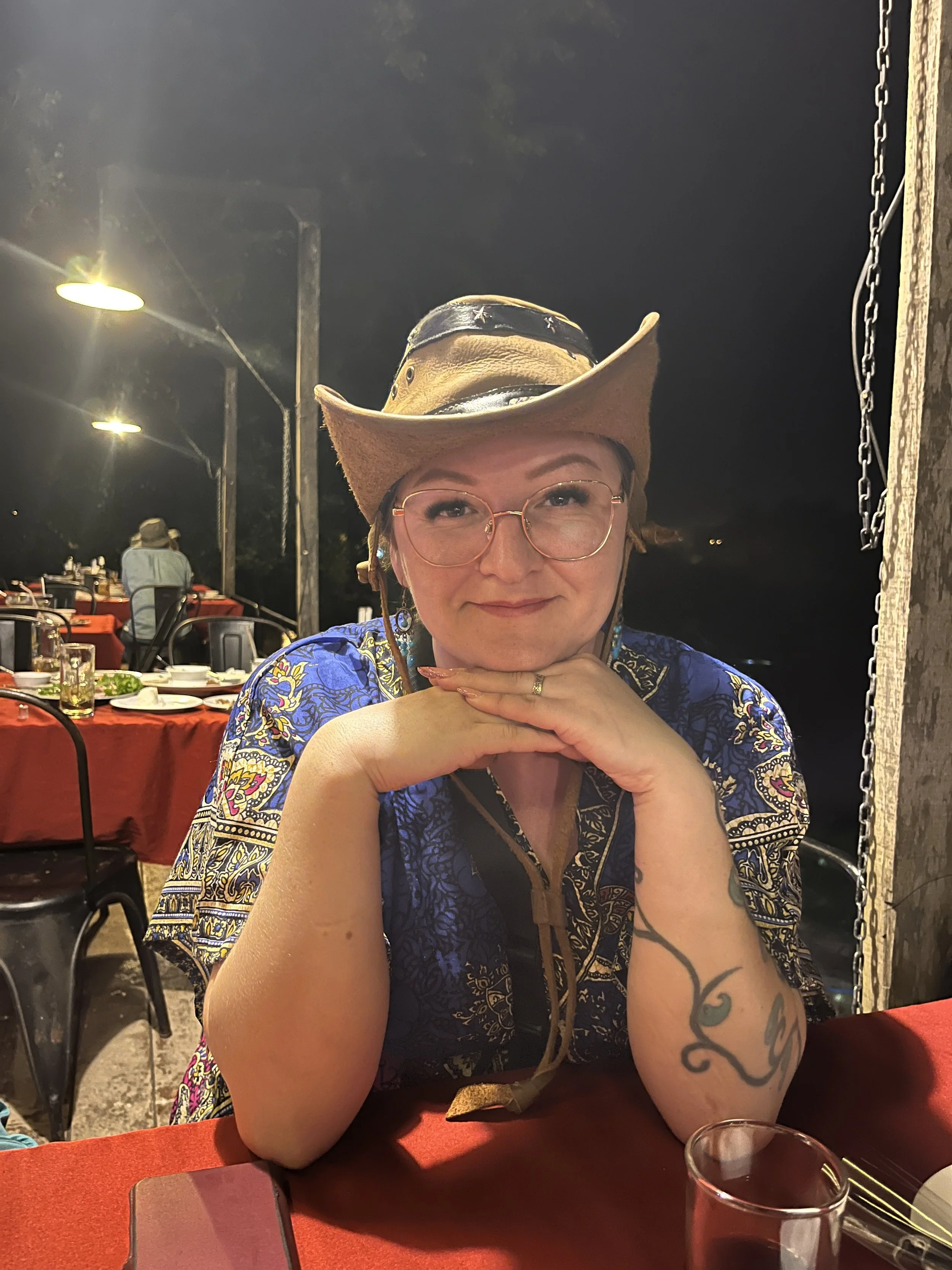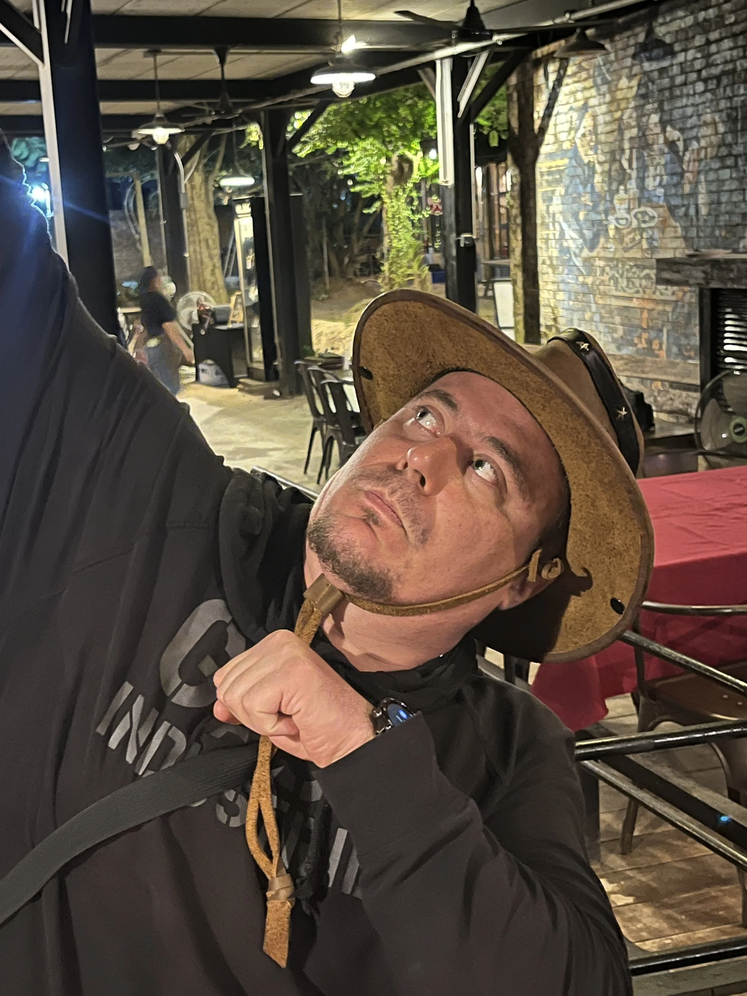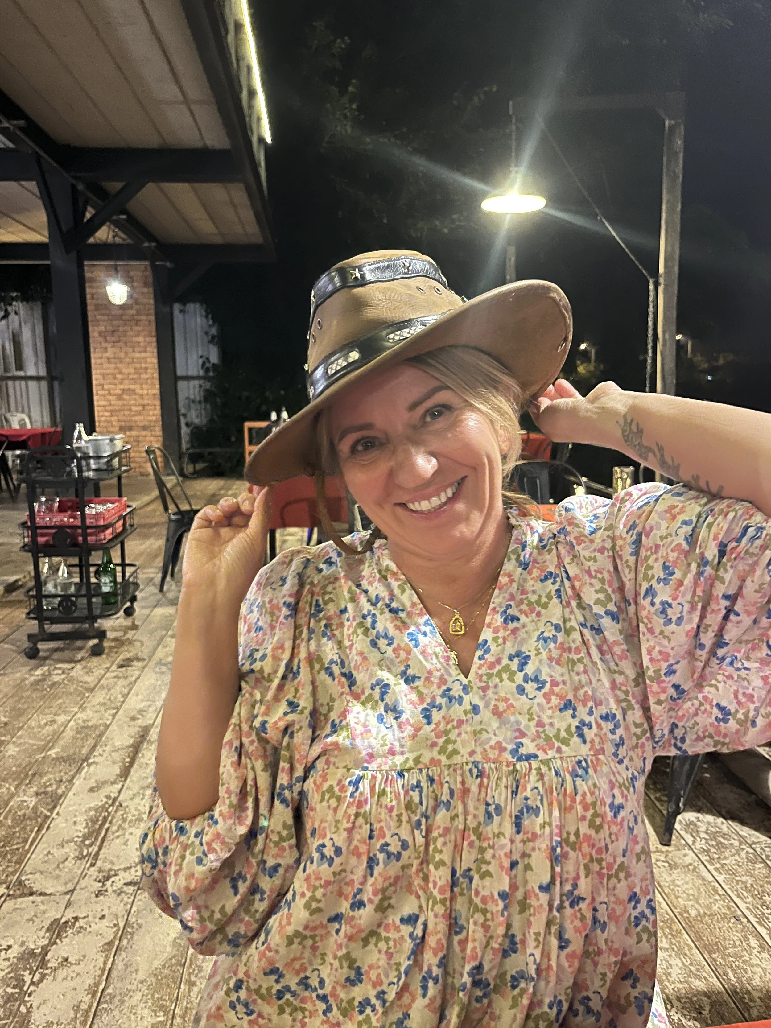 Päätettiin ruokaa odotellessa laittaa pystyyn hassu hattuleikki Jerimiaksen uuden nahkahatun kunniaksi.