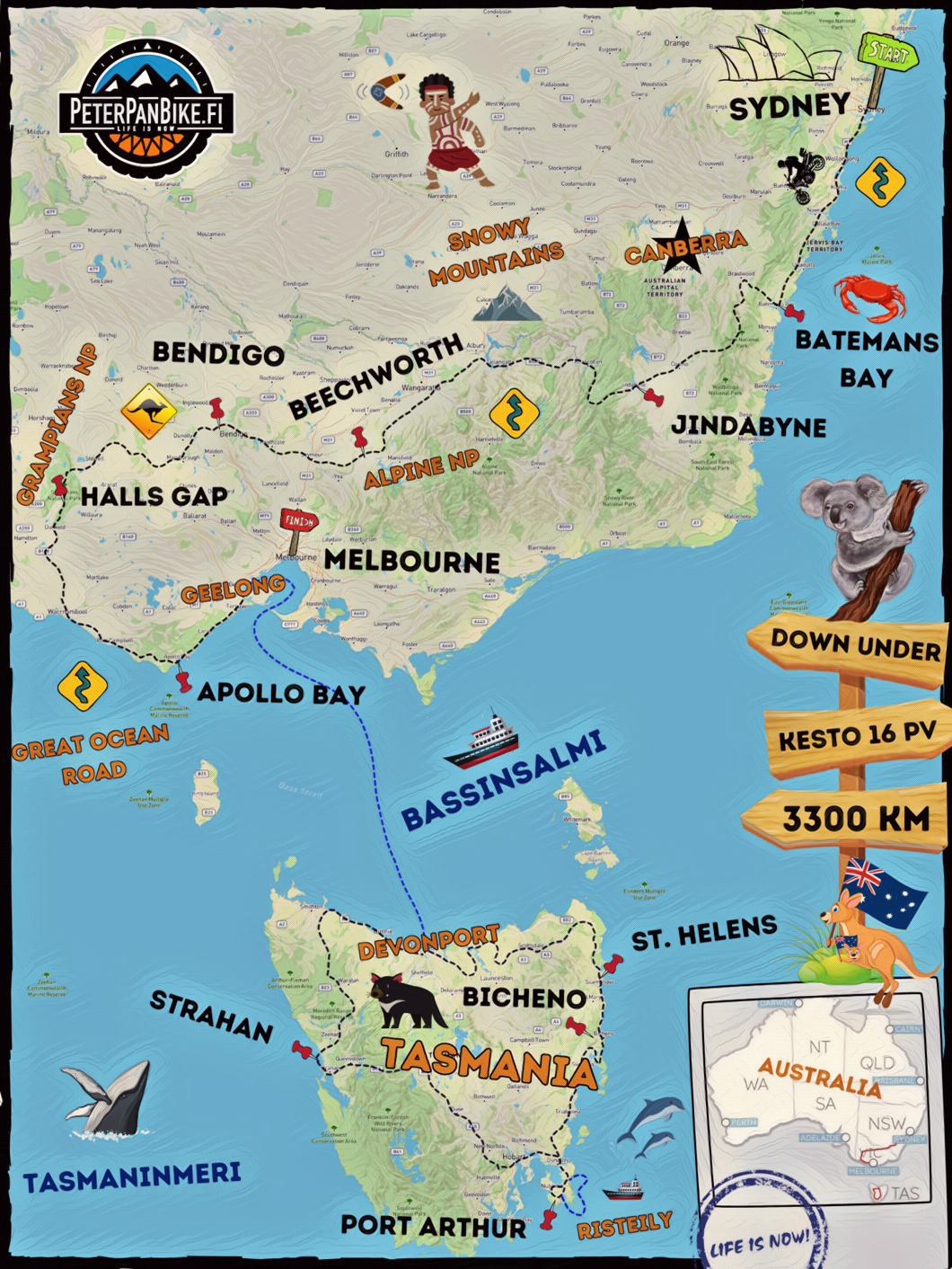 Keräämme käytännössä kaikki Australian parhaat mutkatiet, joita kruunaa motoristien Graalin malja, Great Ocean Road, joka ajetaan päästä päähän. Väistelemme kenguruita, wombatteja ja koaloja niin mantereella kuin Tasmanian saarella, jonne seilaamme Bassinsalmen yli. Tämä autenttinen saari säväyttää uniikilla luonnollaan, loputtomilla mutkilla ja mielenkiintoisella historiallaan.