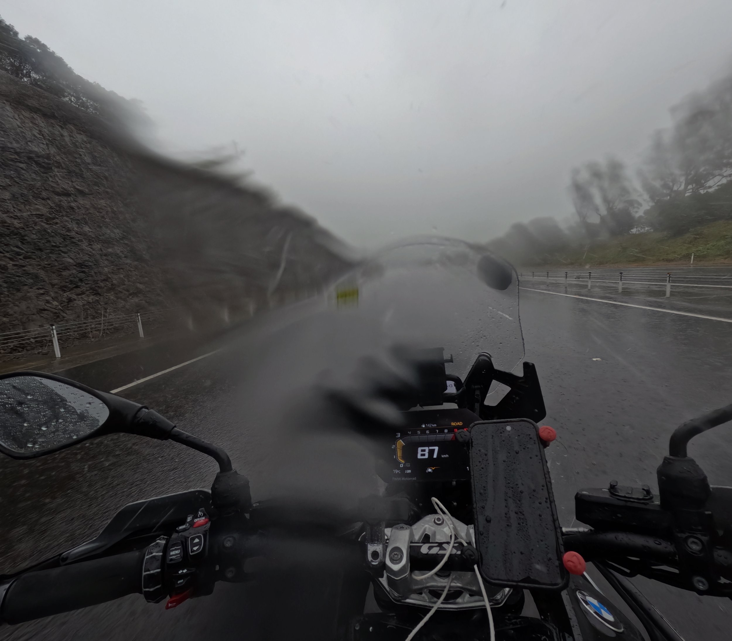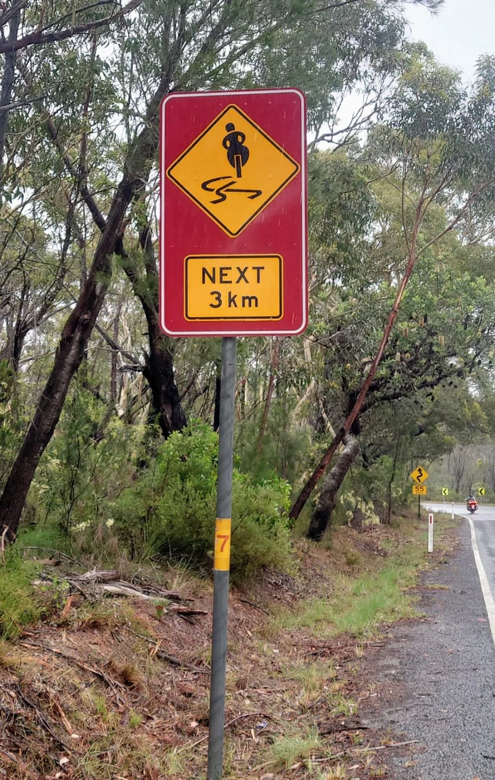 Lounaan jälkeen rannikko jäi peräpeileihin ja suunta kääntyi sisämaahan. Tie alkoi nousta, maisema muuttui ja ilma viileni. Snowy Mountains teki tuloaan vähitellen. Noin tuhannen metrin korkeudessa lämpötila putosi lähelle kymmentä astetta ja muutama pisara tiivistyi visiiriin muistutuksena siitä, että vuorilla ollaan.