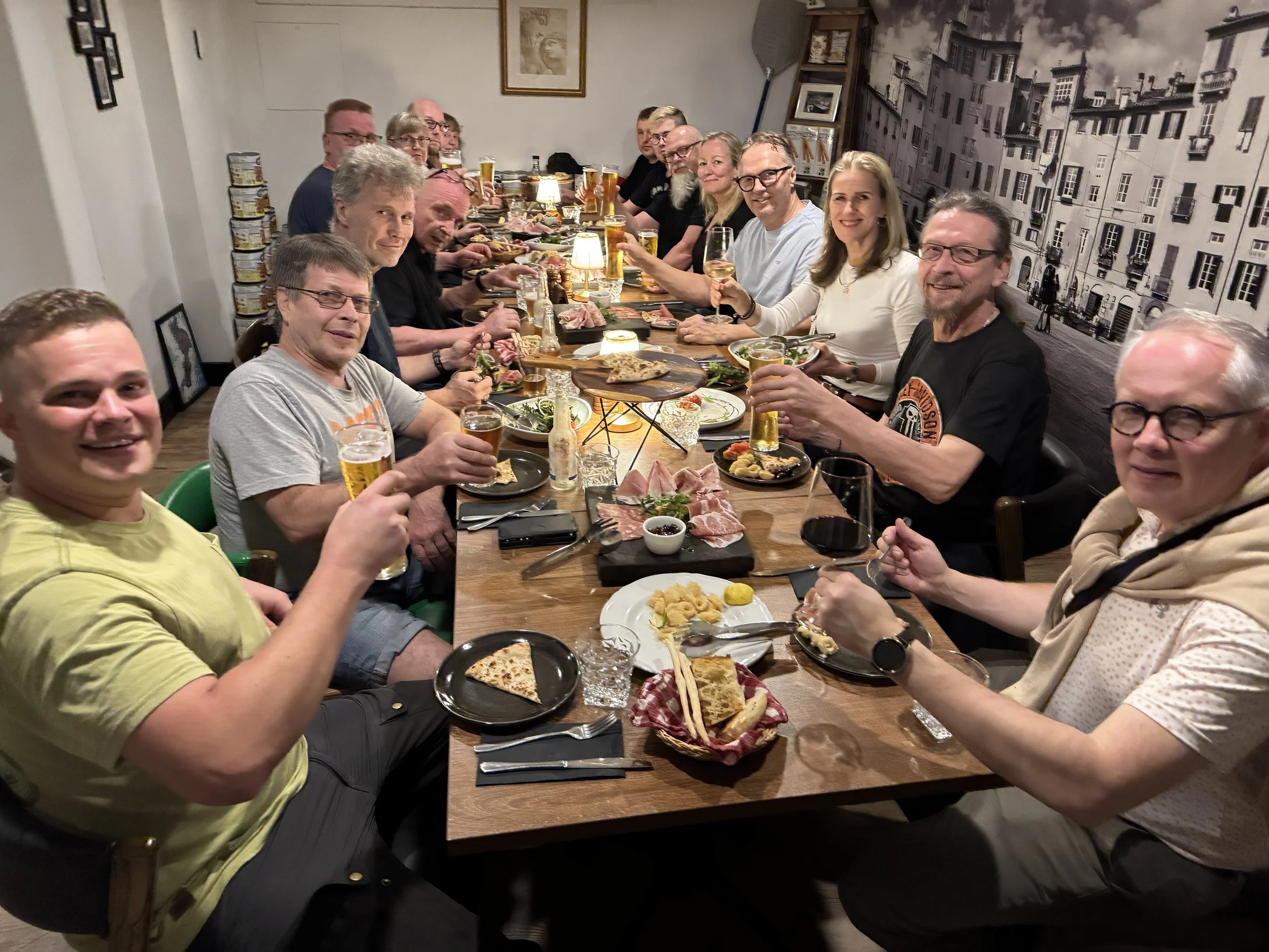 Porukka vihdoin kasassa ja tervetuloillallisen äärellä!