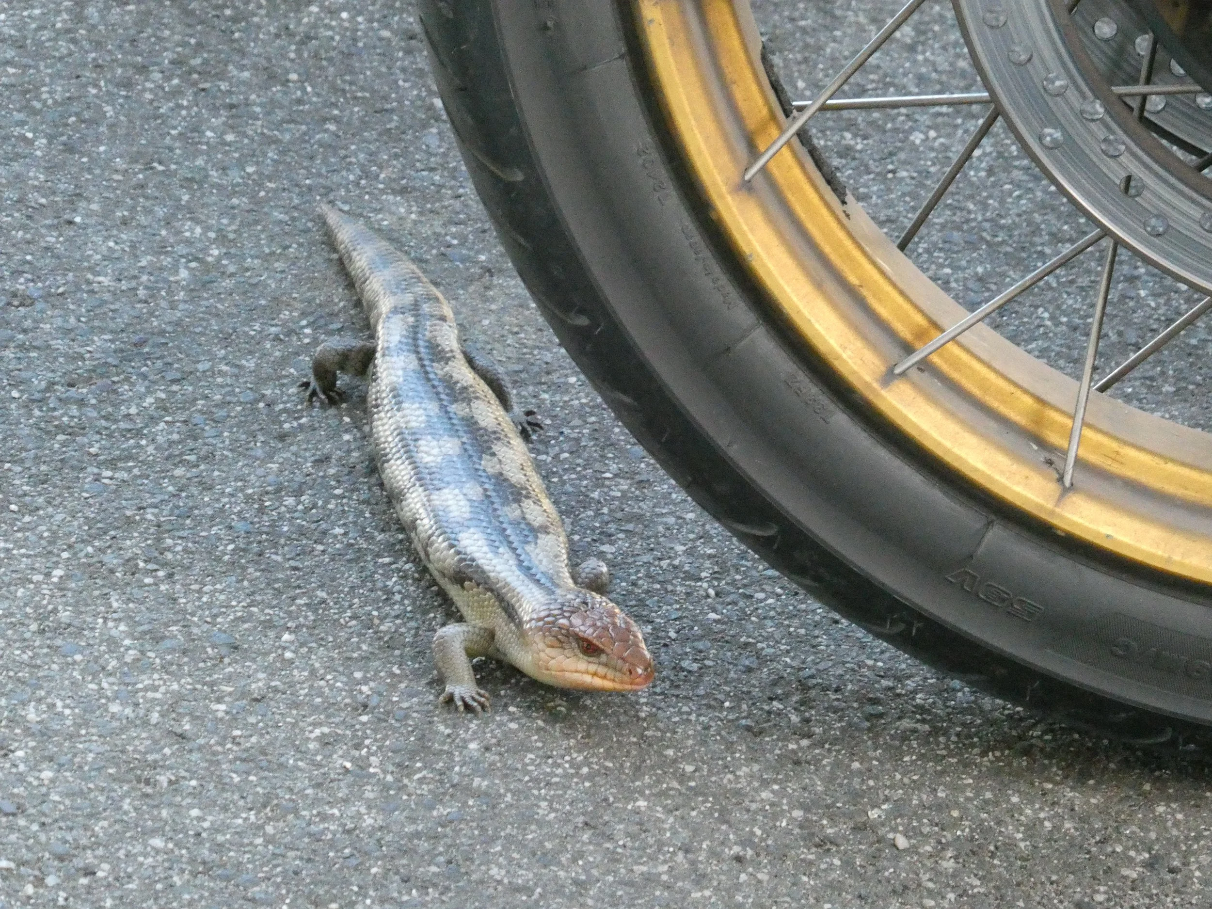 Pyöriä tuli jossain vaiheessa ihmettelemään valtava lisko, joka tunnistettiin sinikieliskinkiksi. Kyseessä on yksi Australian tunnetuimmista ja helpoimmin tunnistettavista liskoista – eikä vähiten nimensä vuoksi.