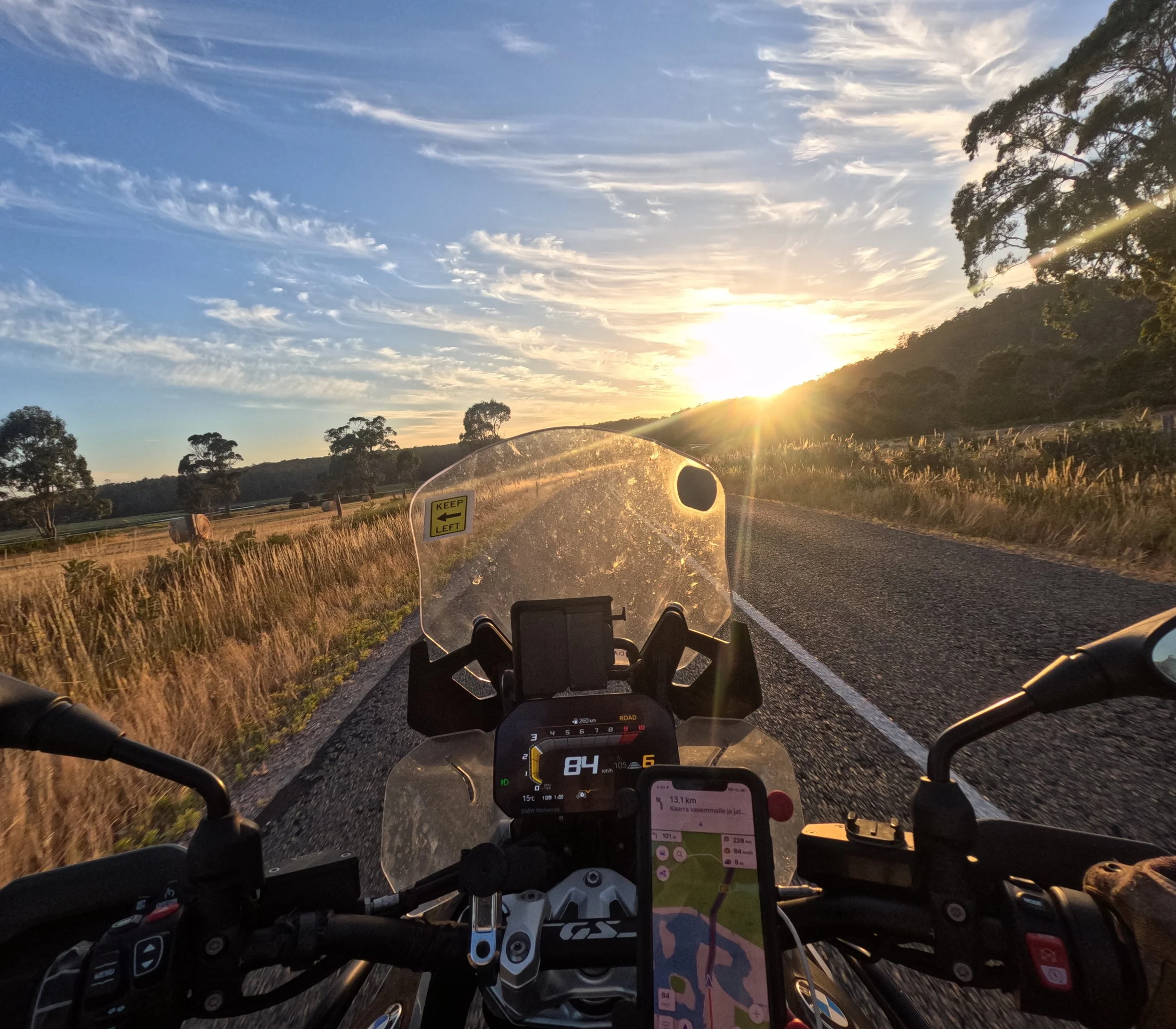 Satamasta irtauduttiin rauhassa ja ajettiin ensimmäinen tunti ilman sen suurempaa kiirettä. Pyörän mittari näytti auringon noustessa noin +12 astetta, joten pysähdyttiin kerran lisäämään kerroksia. Siinä on oma erityinen fiiliksensä, kun lähtee ajamaan kohti nousevaa aurinkoa – maailma näyttää hetken aikaa oudolta ja hiljaiselta, tiet ovat tyhjiä ja tuoksut tuntuvat voimakkaammilta kuin muuten.