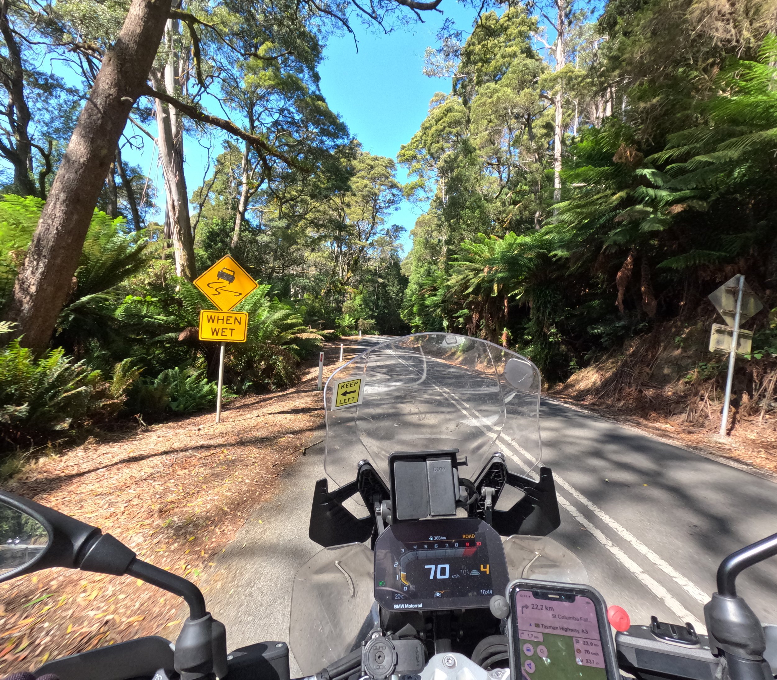 Tiet olivat heti kättelyssä hyvässä kunnossa ja liikennettä oli vähän. Tasmania tuntui saman tien moottoripyöräilijän paikalta: mutkat alkoivat nopeasti, ja maisema vaihteli jatkuvasti kumpuilevista pelloista metsään ja takaisin.