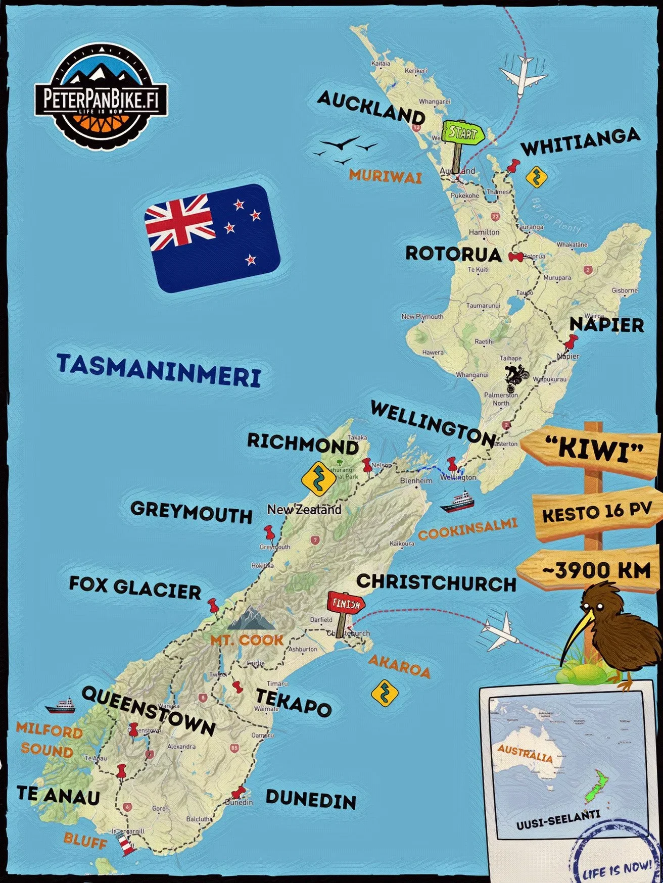 Koko reissun pituus on noin 4000 kilometriä, ja se päättyy Christchurchiin. Sen jälkeen on aikaa vetää henkeä, katsoa taaksepäin ja todeta, että Uusi-Seelanti ei ole vain yksi matkakohde muiden joukossa. Se on kokonaisuus, joka on tehty koettavaksi nimenomaan satulasta käsin.