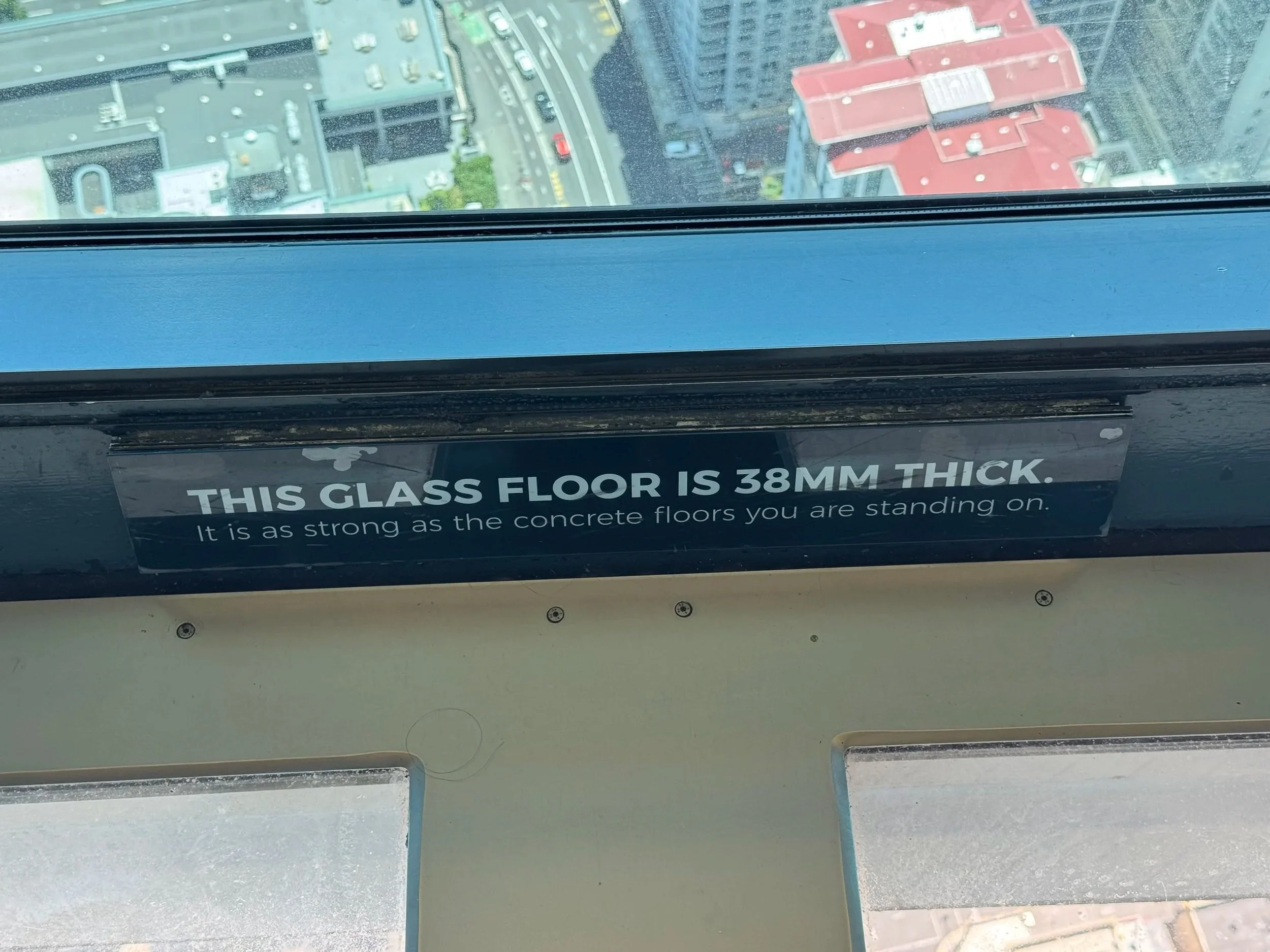 Vaikka kyltti vakuuttaa, että lasin päällä seisominen on samaa kun kivilattialla…