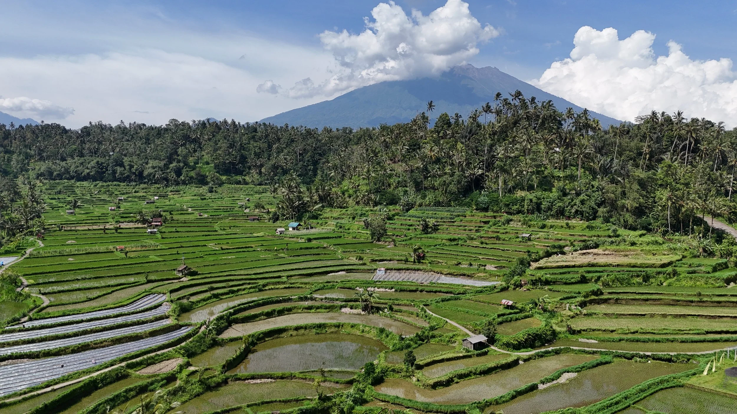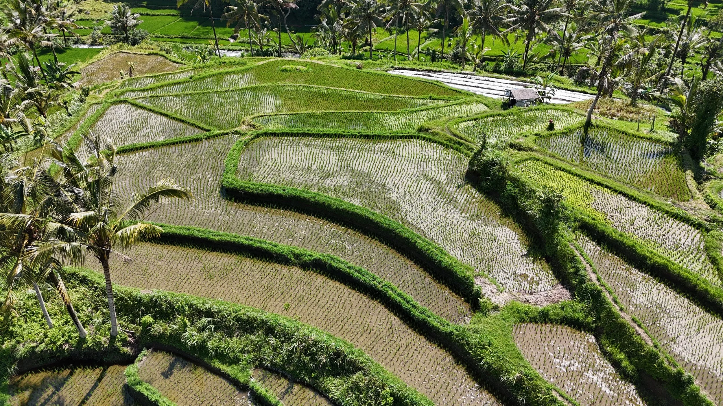 Viljely perustuu perinteiseen kastelujärjestelmään nimeltä subak. Se on vuosisatoja vanha järjestelmä, jossa kylät ja viljelijät jakavat veden keskenään tarkasti sovitulla tavalla. Vesi johdetaan vuorilta kanavia pitkin pelloille, ja koko järjestelmä toimii yhteistyön ja yhteisten sääntöjen varassa.