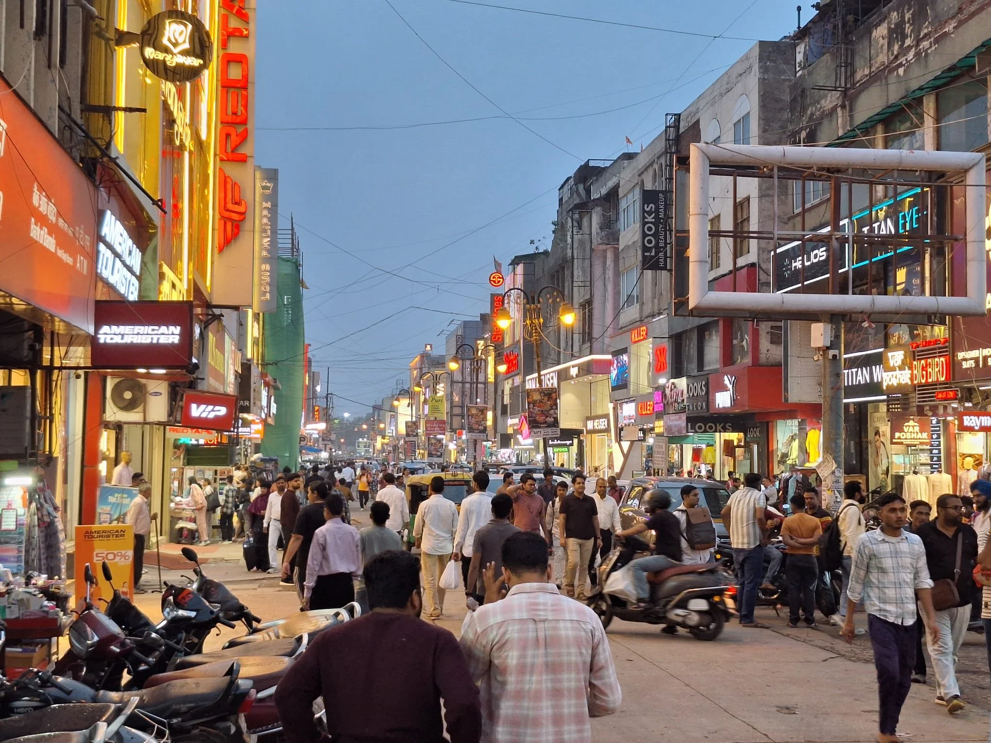 Hotellin takana korttelin päässä kulkee vilkas ostoskatu, jonka varrelta löytyvät lähes kaikki Intian johtavat brändit ja monia kansainväolisiä. Sivukaudut ja sisäphat ovat pullollaan tekstiilejä ja innokkaita opastajia vähille valkoisille turisteille on riittämin.