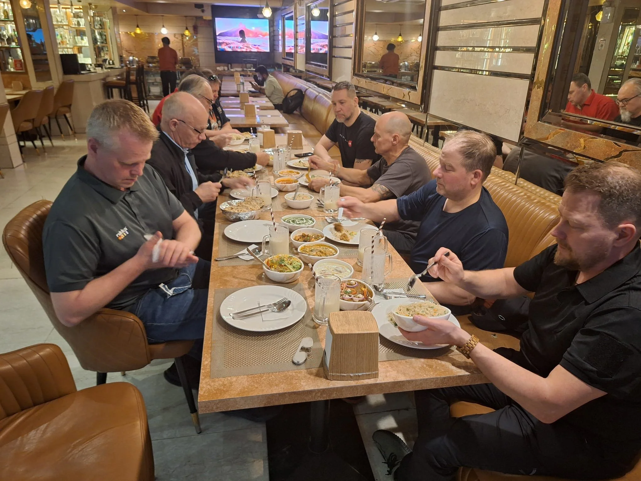 Muutaman askeleen päästä hotellin vierestä löytyi kelpoinen ravintola. Olin sen valinnut, kun ruokalistalla oli sekä kasvisruokia että kanaa ja lammasta. Nyt kuitenkin muutama päivä sitten oli Intian uusi vuosi eikä tähän pyhään aikaan kukaan tahdo eläimiä tappaa, joten vain kasvisvaihtoehdot olivat tarjolla. Mutta niistäkin löytyi kiva kattaus monenlaisia makuja. Käytiin vielä seuraavien päivien ohjelma läpi ja keskusteltiin ryhmäajamisesta Intian ja Nepalin liikenteessä. Useimmat ovat ensikertalaisia Aasiassa ja kaikki ekaa kertaa Intiassa, joten uuttahan kaikki on. Mulle jäi sellainen kutina, että tämä porukka tulee ajamaan siistissä paketissa tämän matkan.