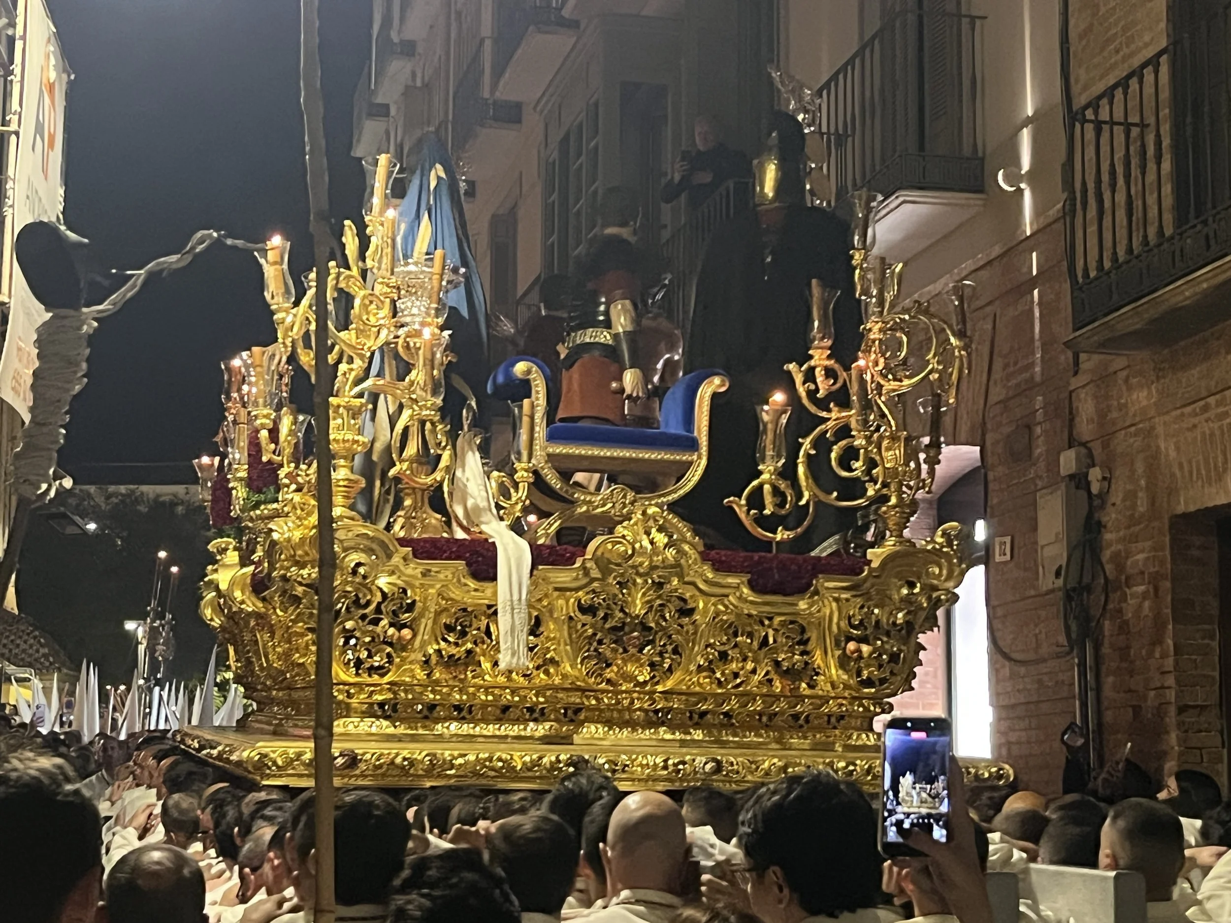 Hotellilta Malagan keskustan puistokadulle oli vain muutaman minuutin kävelymatka. Siellä monikaistainen pääkatu oli suljettu liikenteeltä ja katu oli täytetty siirrettävillä katsomoilla. Moni malagalainen varaa katsomosta itselleen istuimapaikan koko viikoksi, josta seuraa pääsiäisen viettoon kuuluvia, eri veljeskuntien kulkueita.